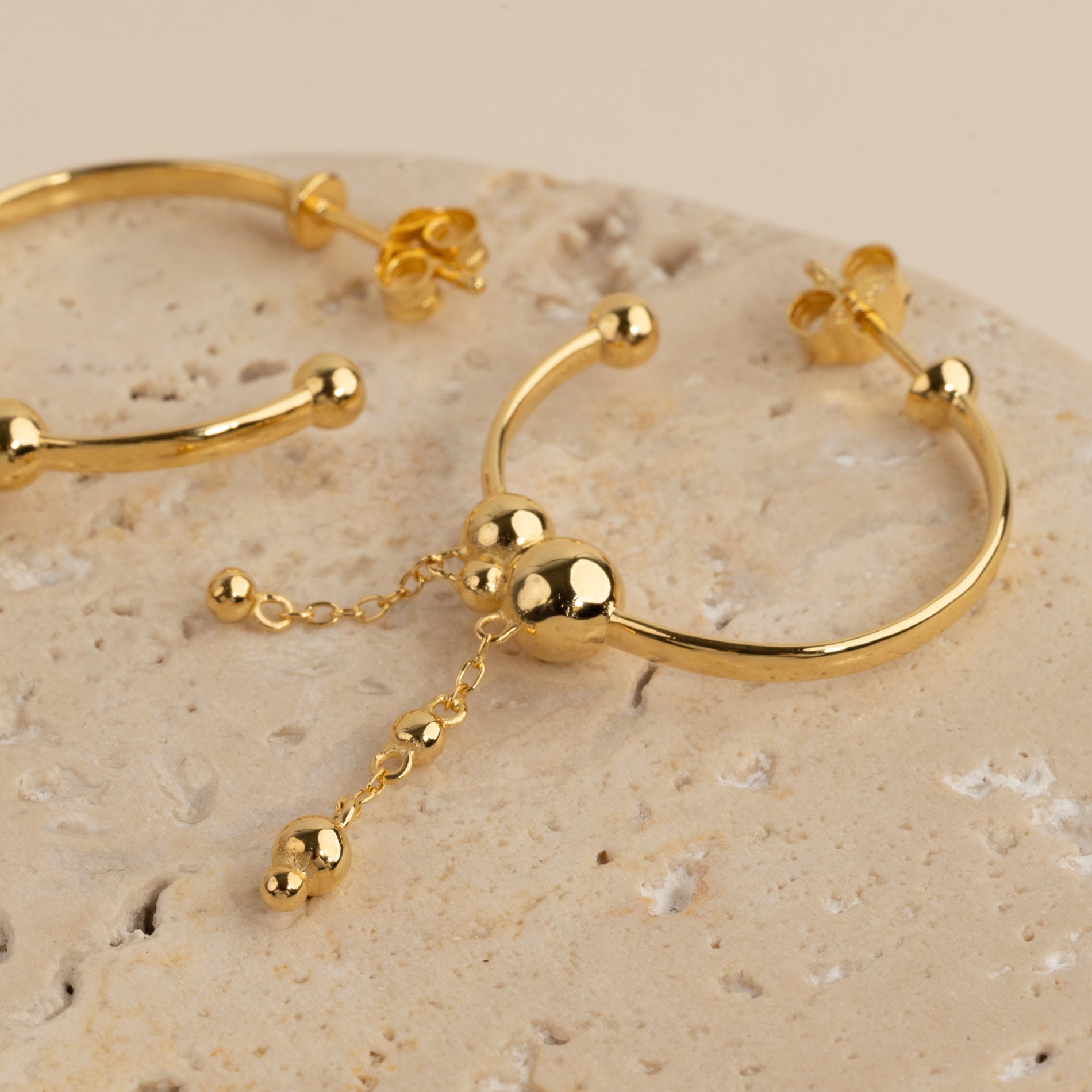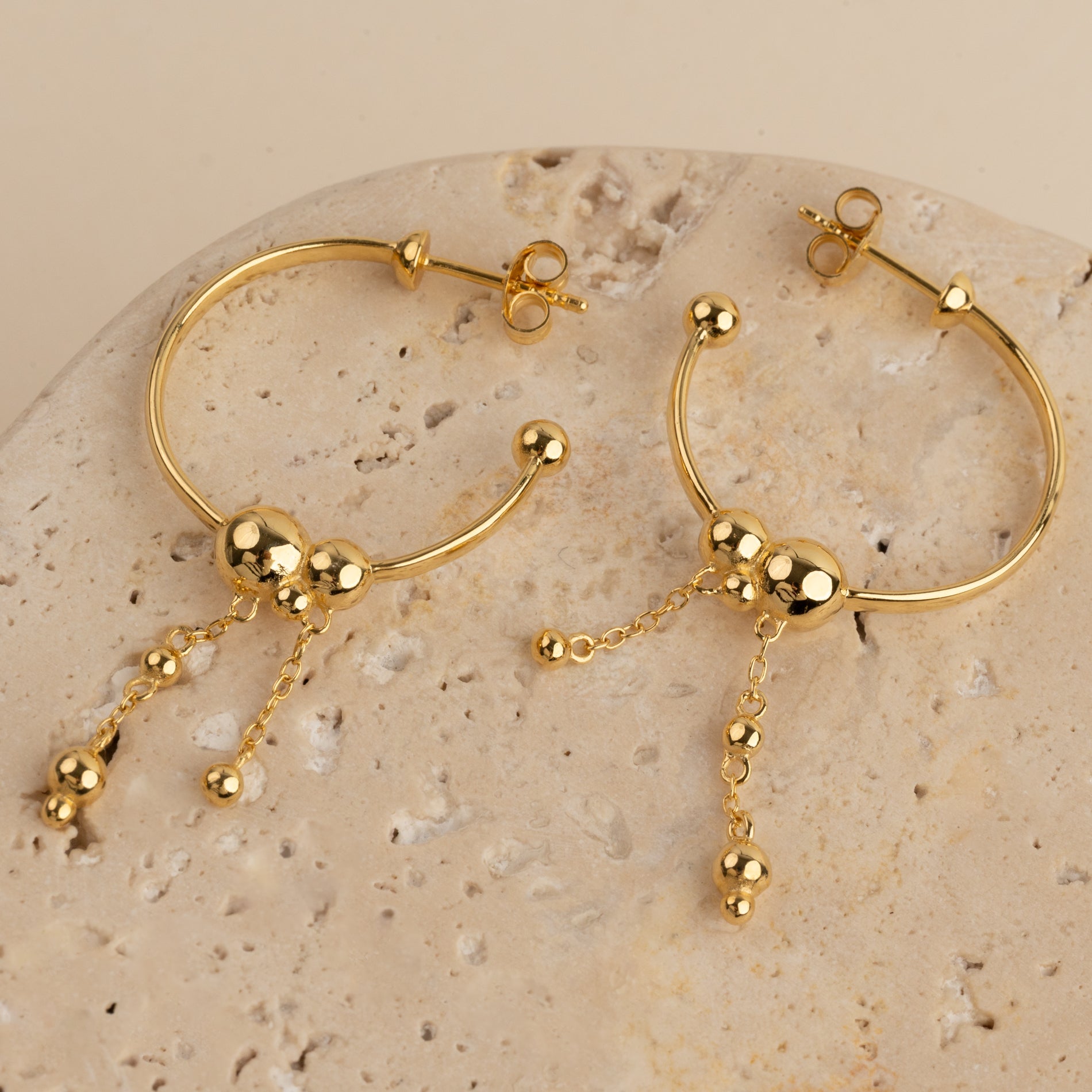 Disse unike øredobbene kombinerer et moderne og elegant uttrykk, der små, kuleformede detaljer fremhever de runde creolene. Fra bunnen faller to fine kjeder som beveger seg lett og gir smykket et feminint og karakteristisk preg.