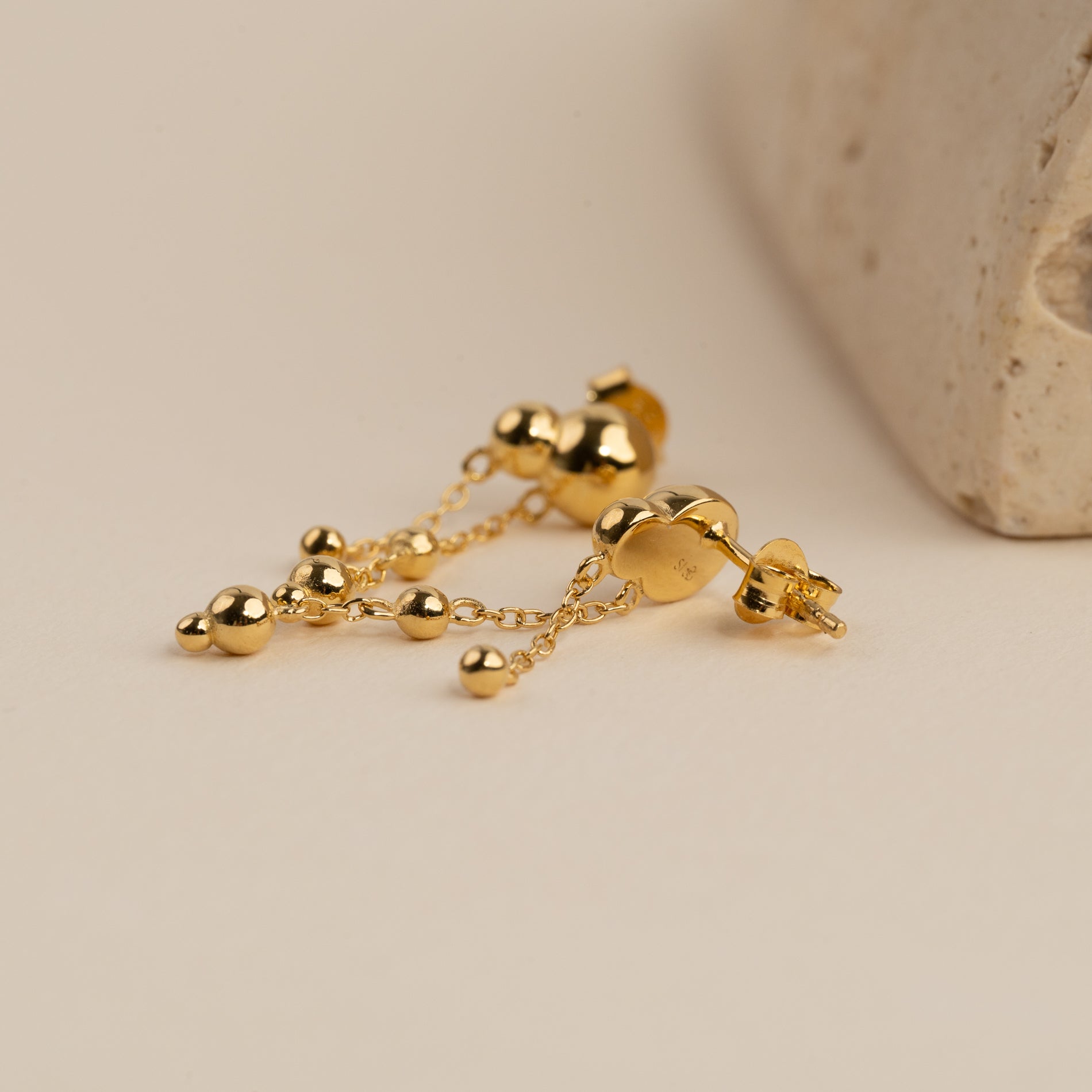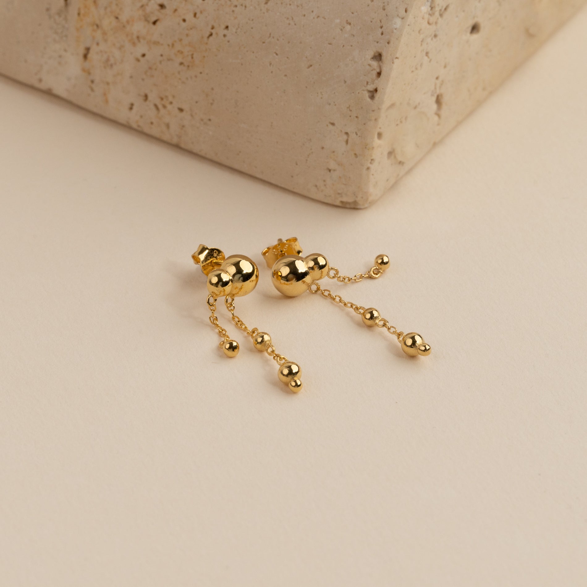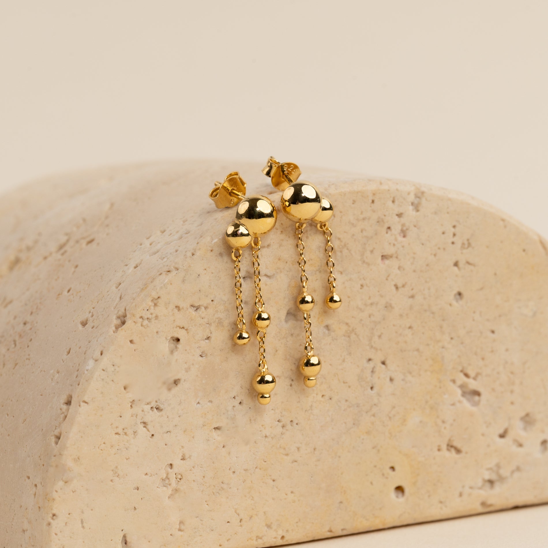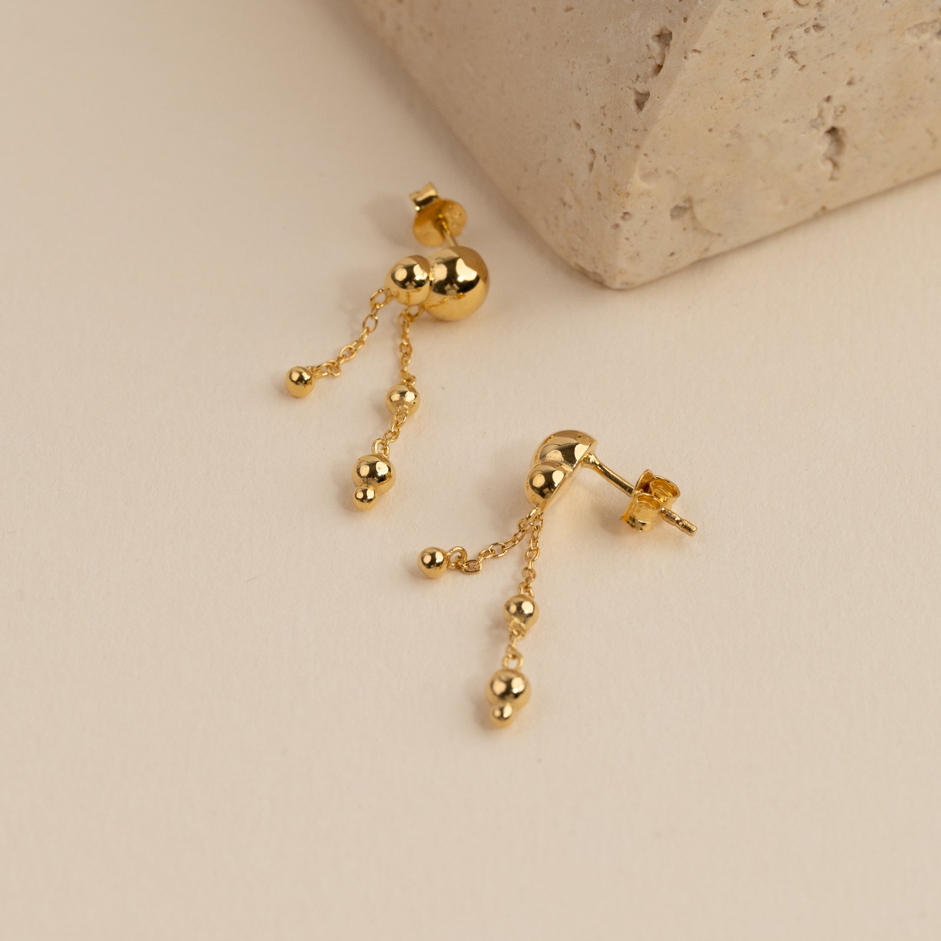 Disse elegante, hengende øredobbene har et moderne og feminint uttrykk. Små kuler er festet sammen med fine lenker som beveger seg lett, og det skulpturelle designet gir smykket et unikt og tydelig preg.
