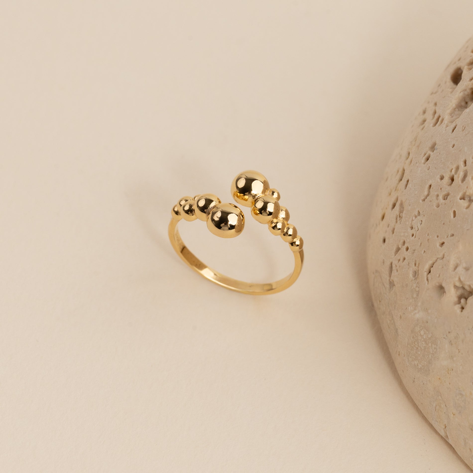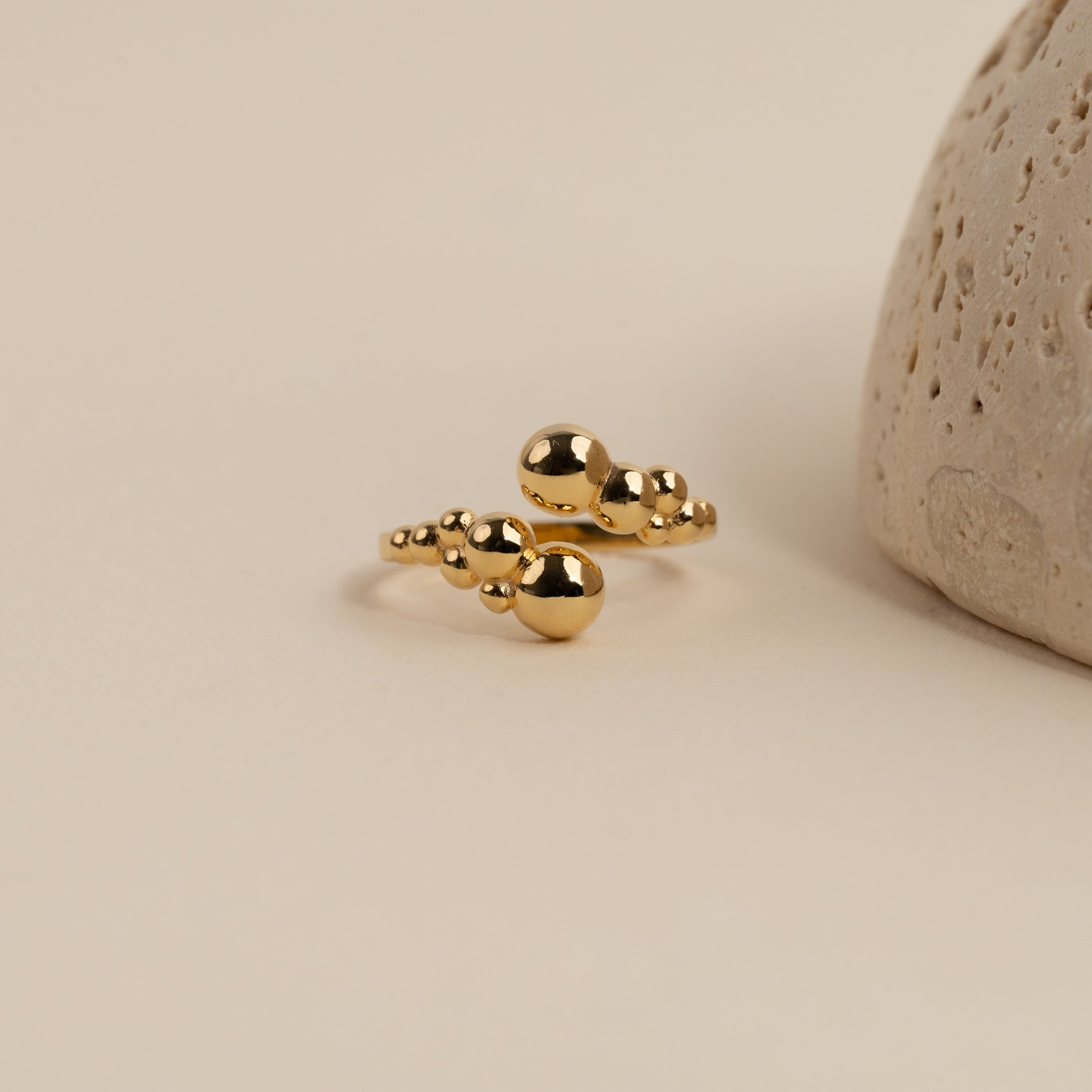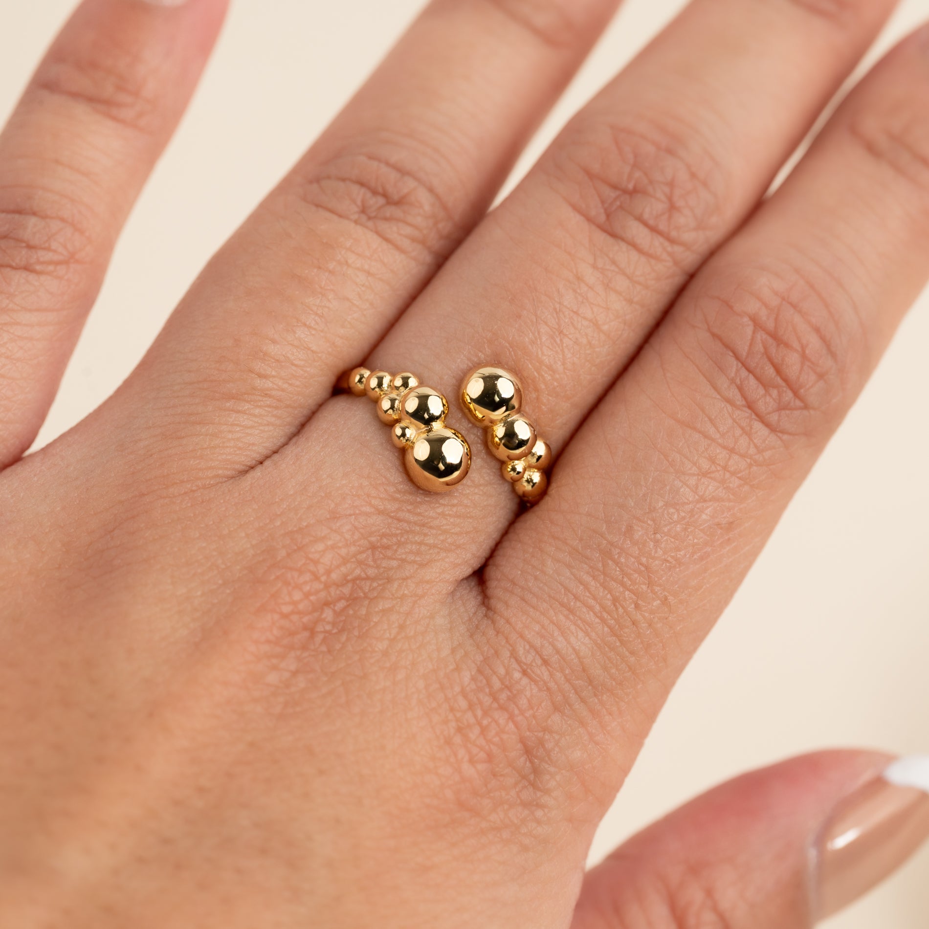 Denne unike ringen har et åpent, skulpturelt design med små kuler, som gir et moderne og elegant uttrykk. Den karakteristiske formen tilfører personlighet og er perfekt for et statement-look, enten du bærer den alene eller sammen med andre ringer.