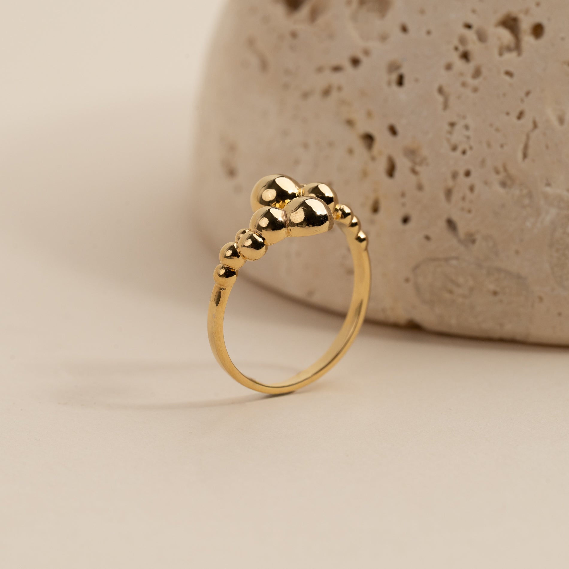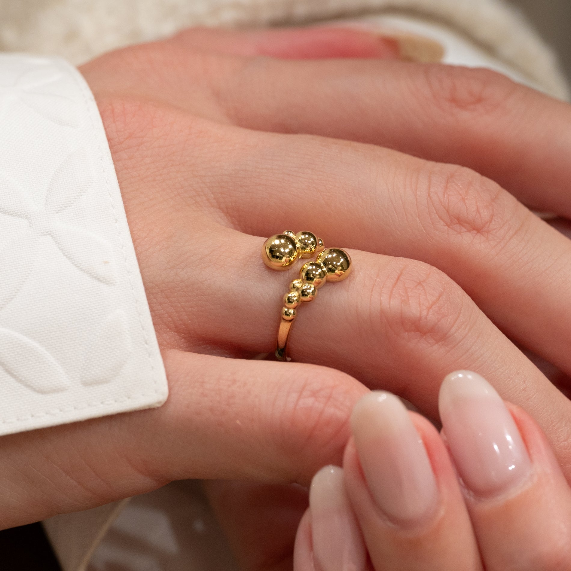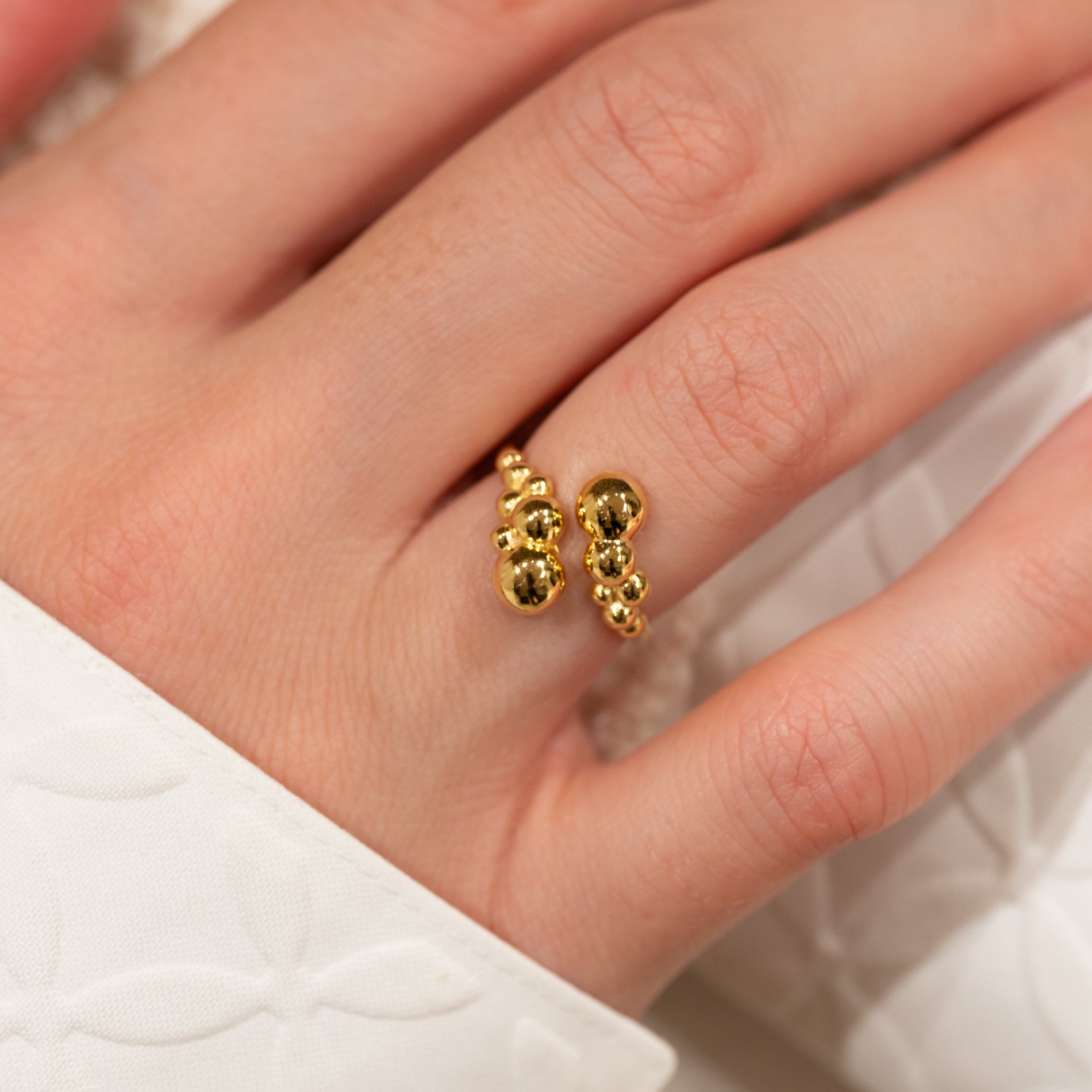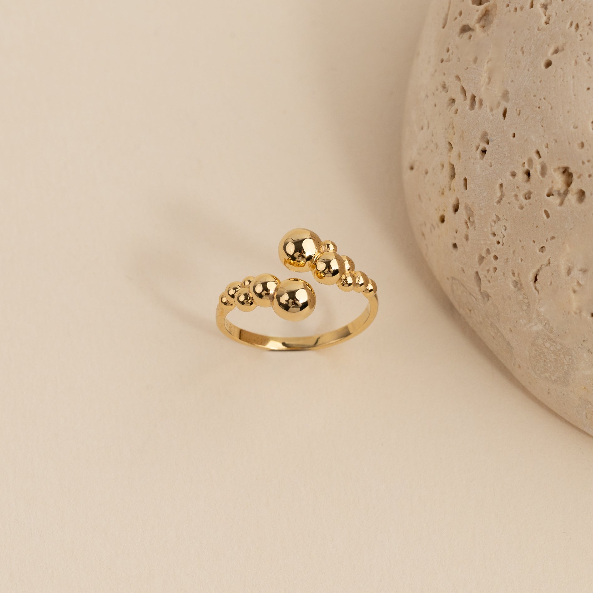 Denne unike ringen har et åpent, skulpturelt design med små kuler, som gir et moderne og elegant uttrykk. Den karakteristiske formen tilfører personlighet og er perfekt for et statement-look, enten du bærer den alene eller sammen med andre ringer.