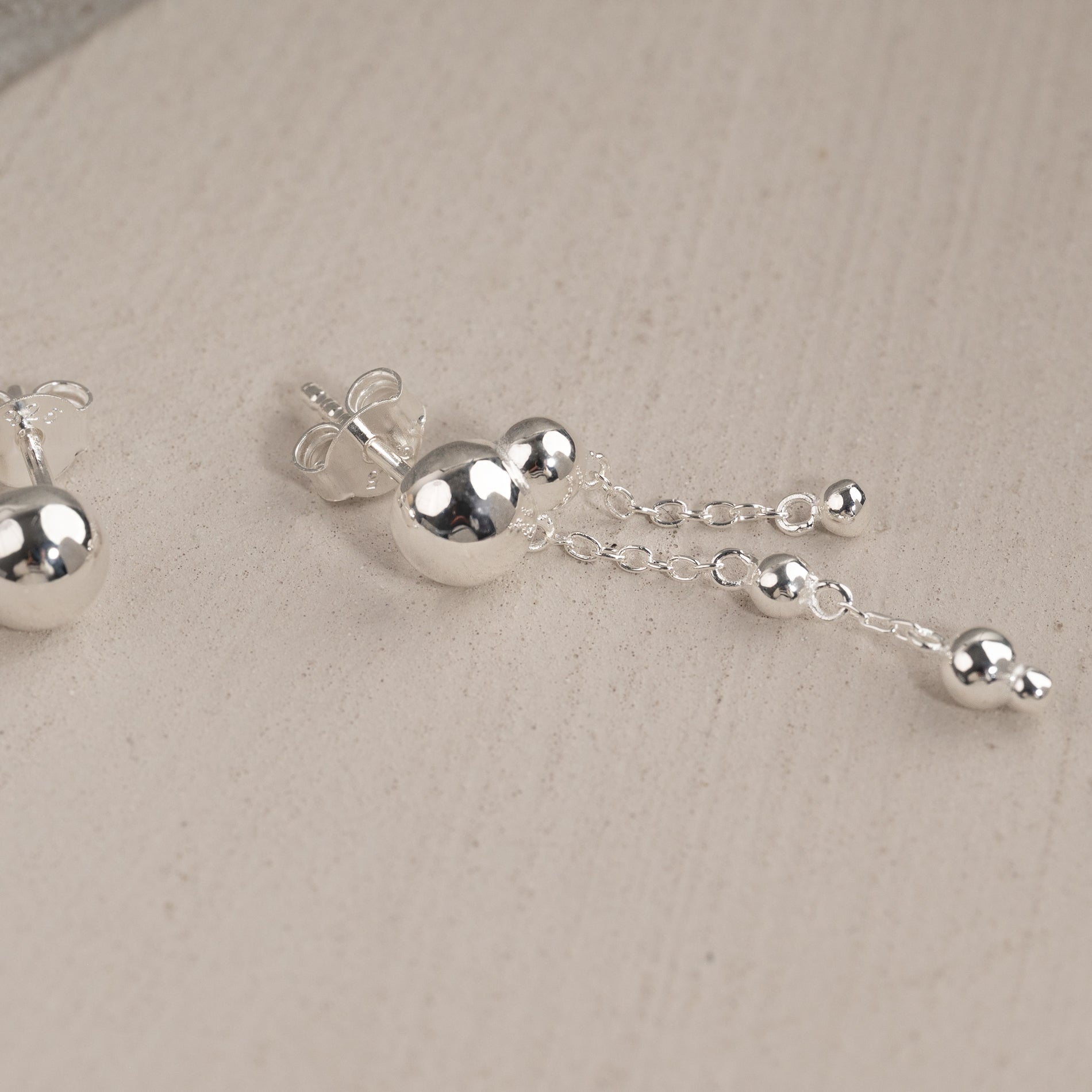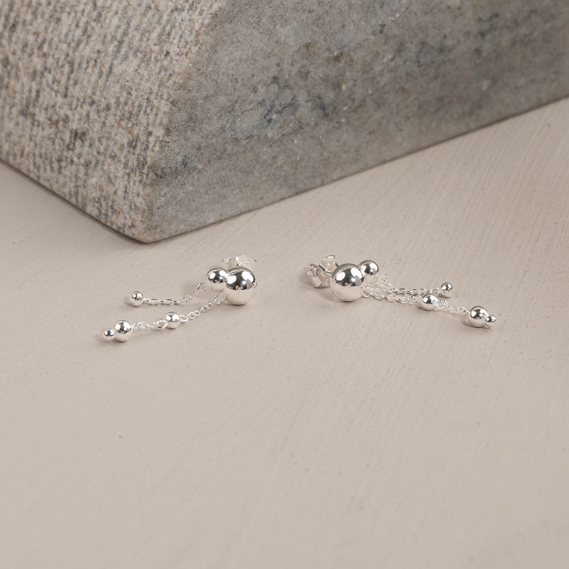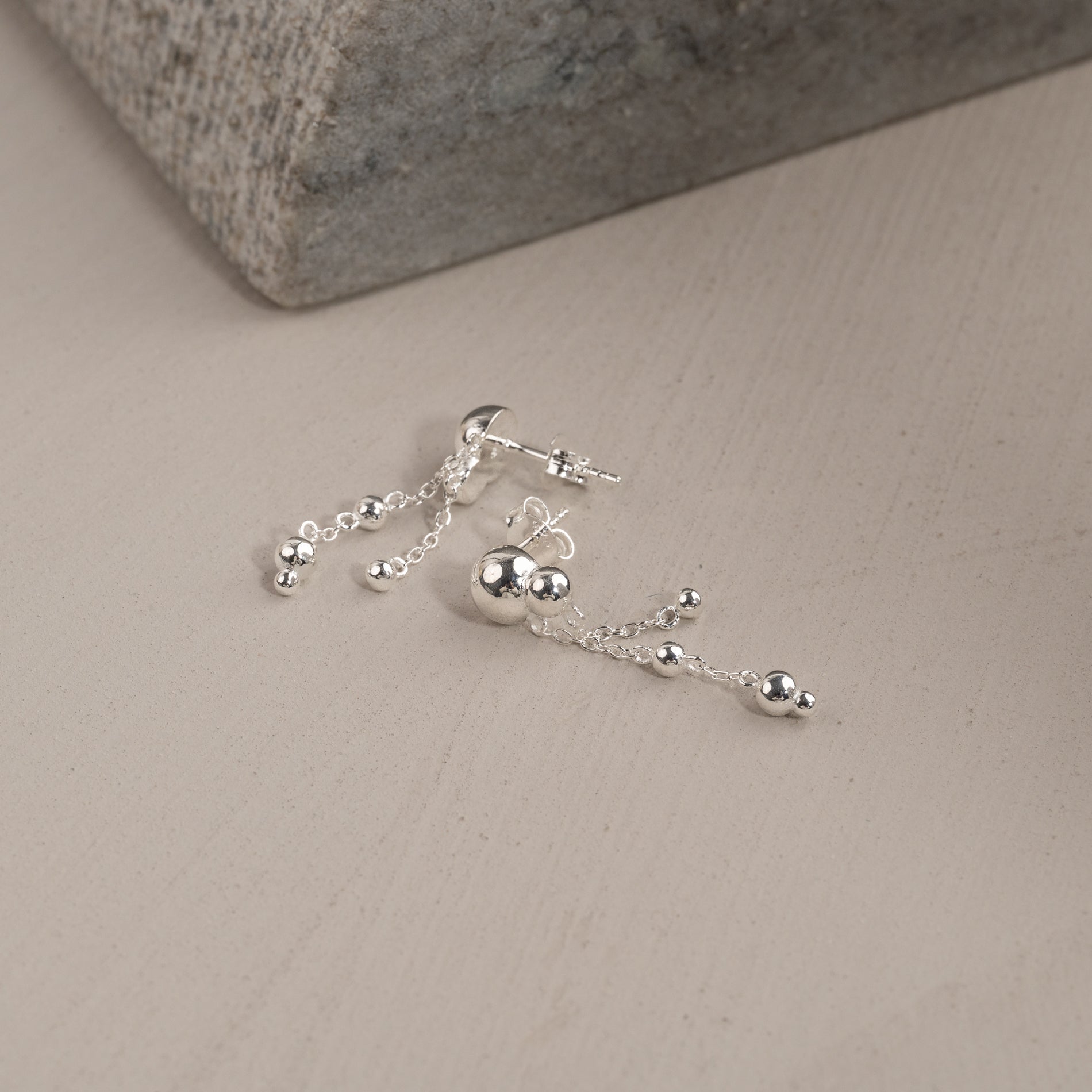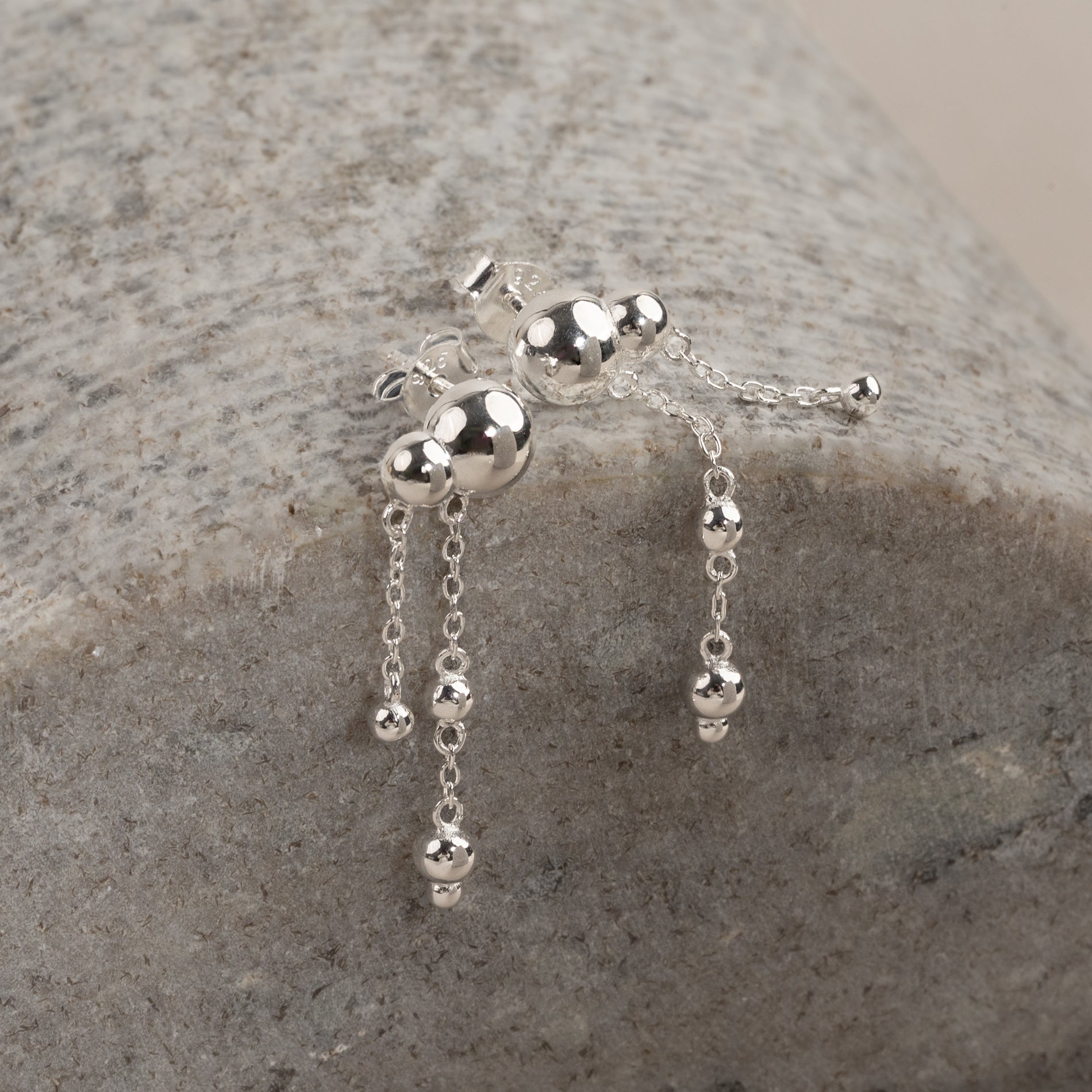 Disse elegante, hengende øredobbene har et moderne og feminint uttrykk. Små kuler er festet sammen med fine lenker som beveger seg lett, og det skulpturelle designet gir smykket et unikt og tydelig preg.