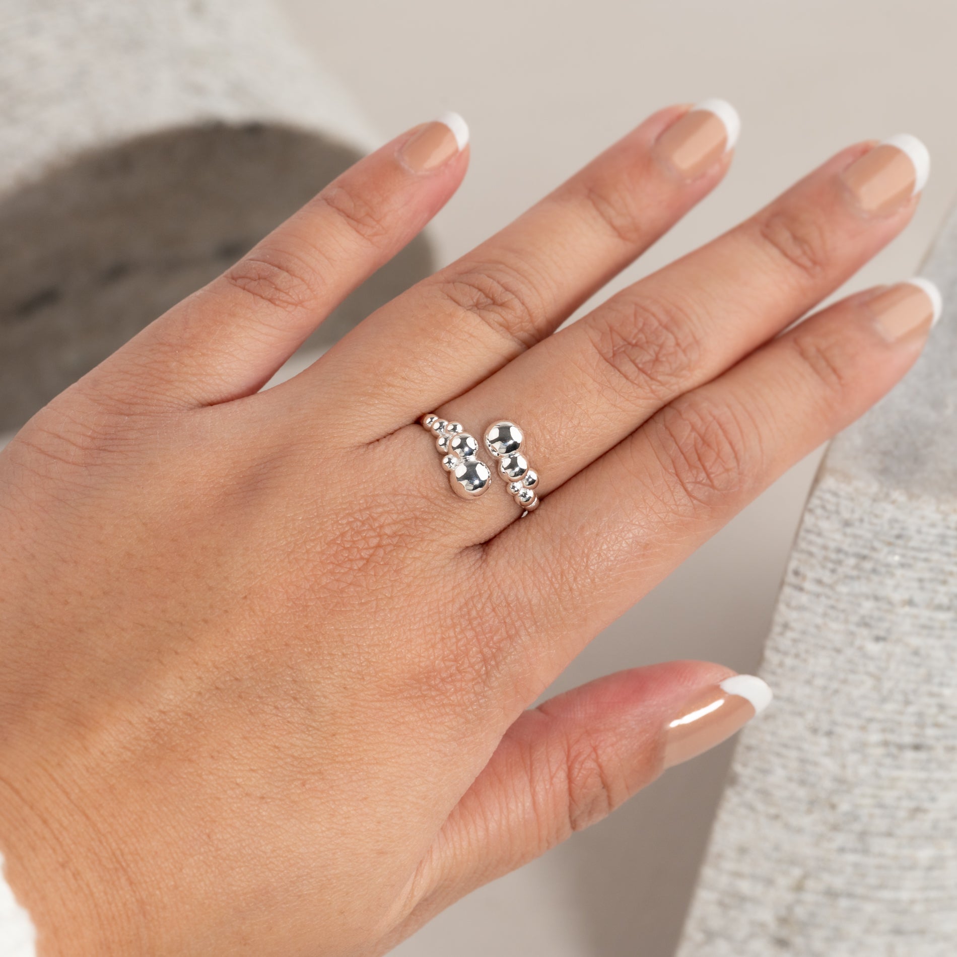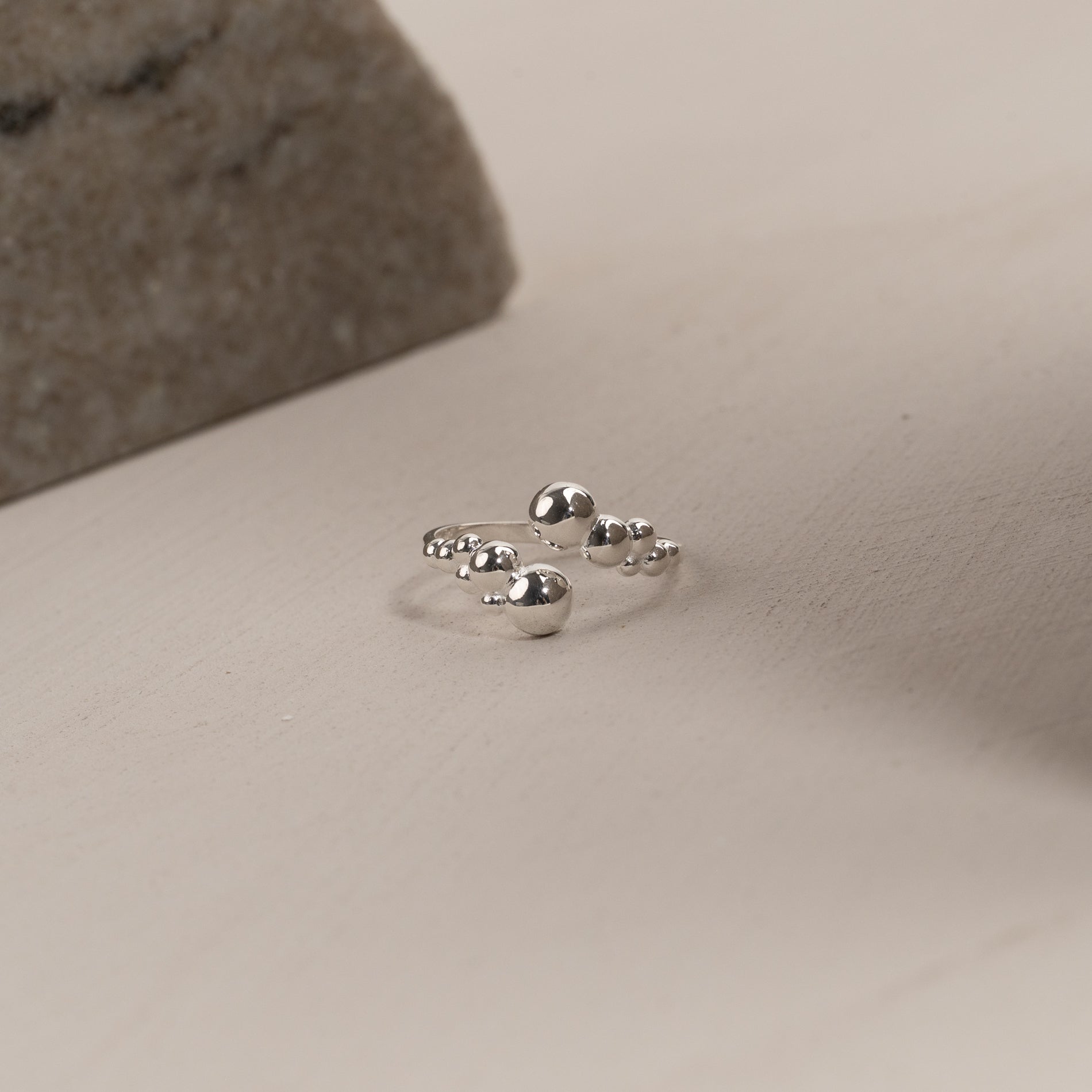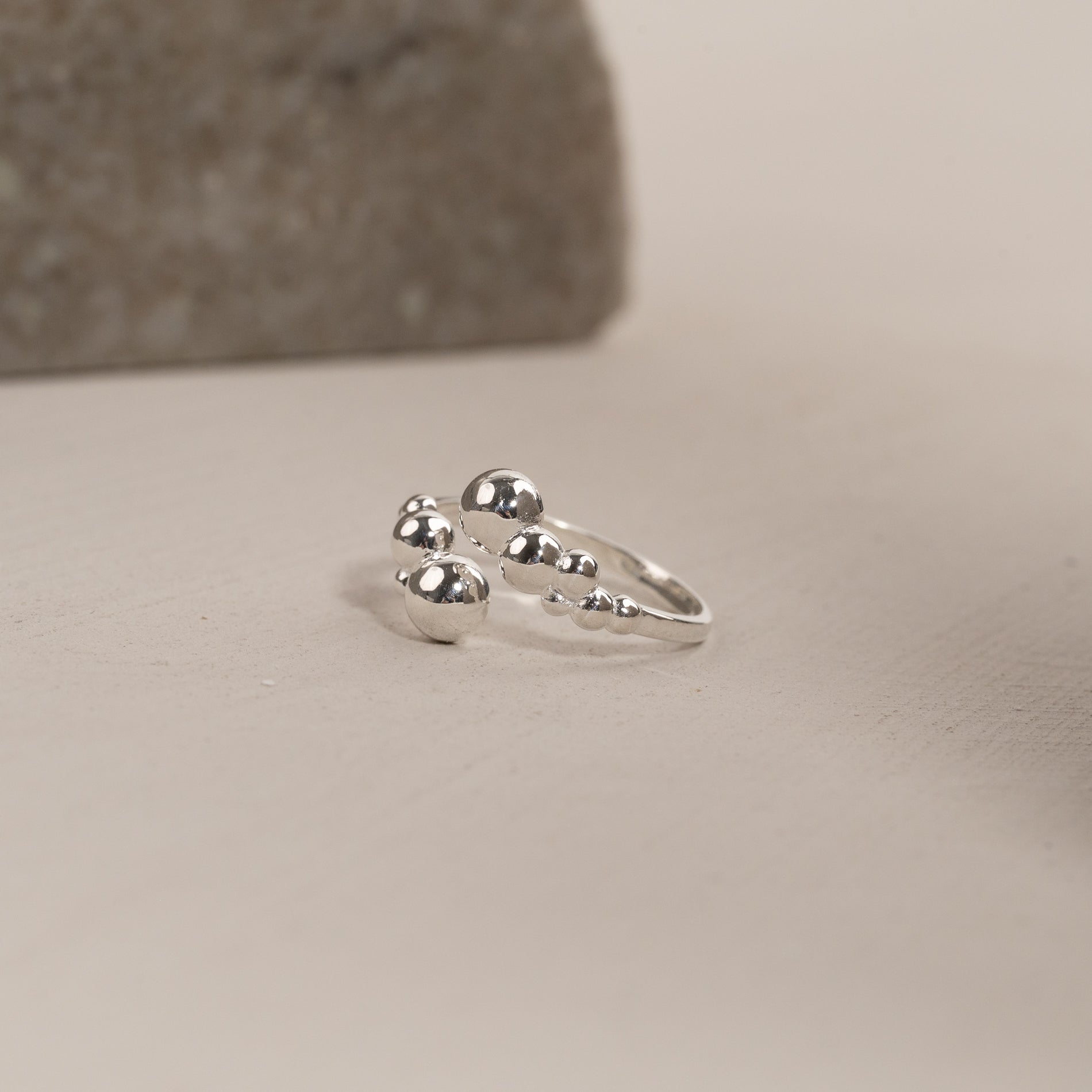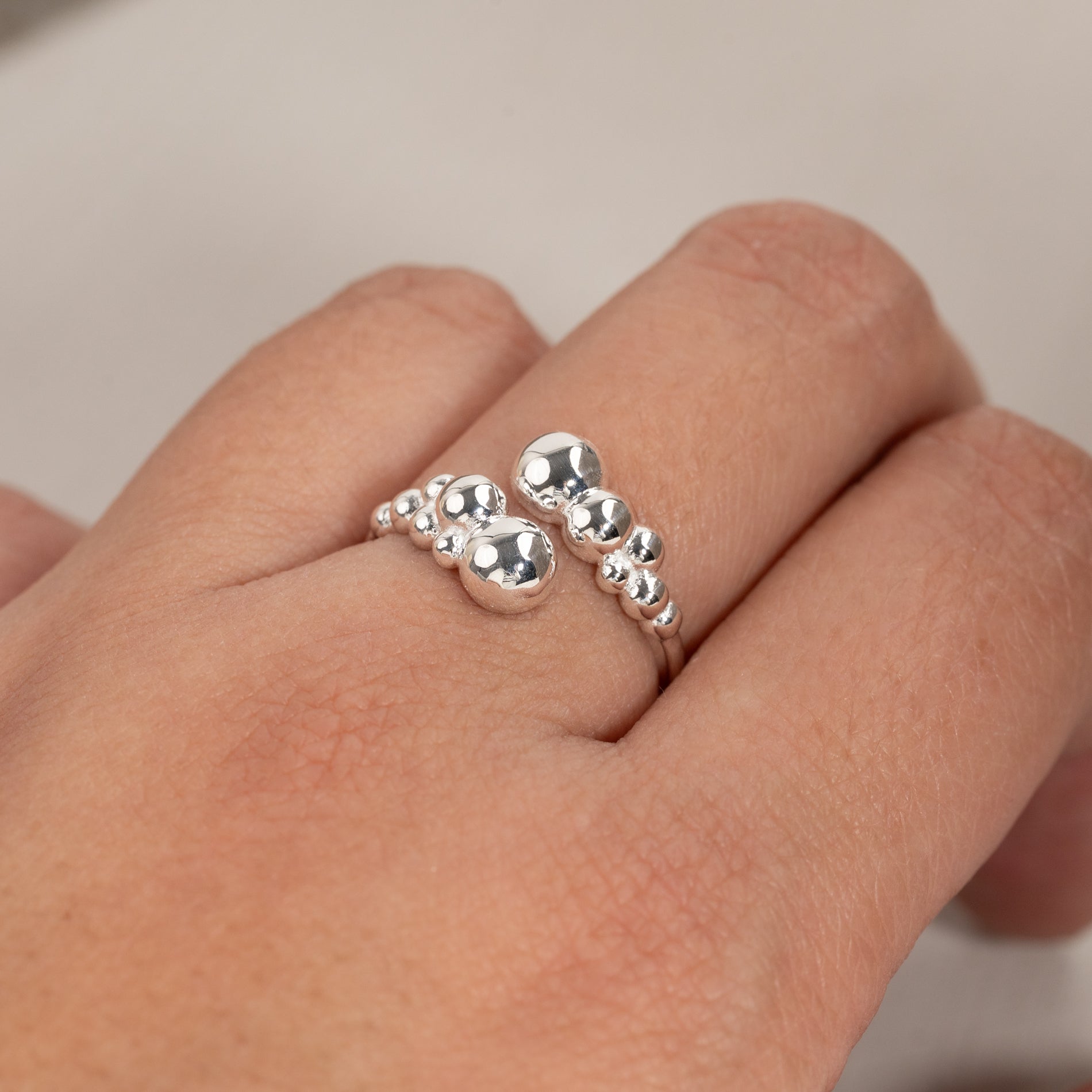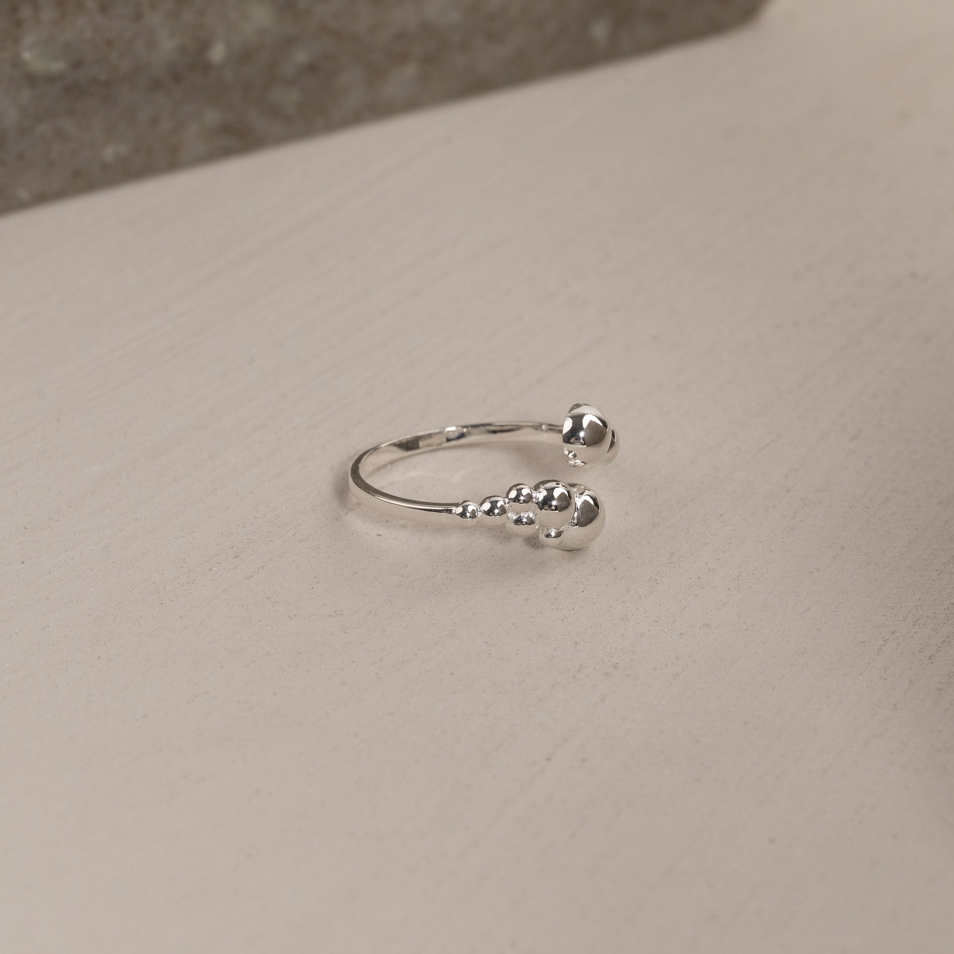 Denne unike ringen har et åpent, skulpturelt design med små kuler, som gir et moderne og elegant uttrykk. Den karakteristiske formen tilfører personlighet og er perfekt for et statement-look, enten du bærer den alene eller sammen med andre ringer.