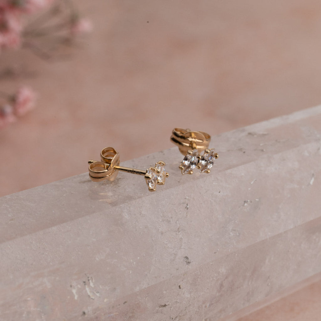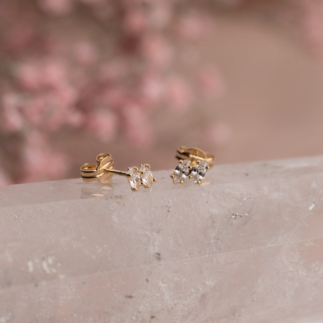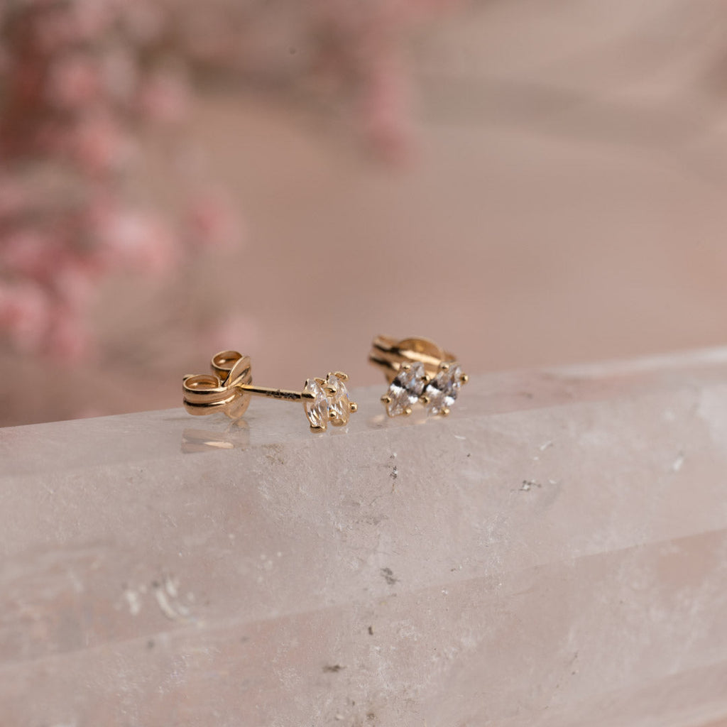 Våre øredobber Paris er laget av 100% resirkulert 9 karat massivt gull med små, marquise slipte kubiske zirkoniasteiner. Øredobbene er designet med to små marquis slipte - eller øyeformede - zirkoniasteiner som sitter i en omfatning i hver side. Øredobbene er speilvendte, slik at du får et pent og symmetrisk utseende når du har dem på.