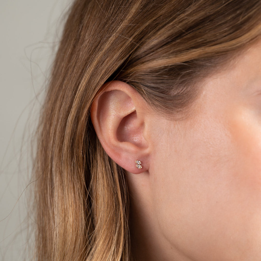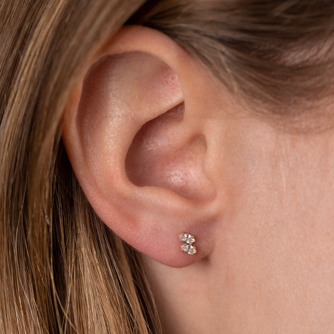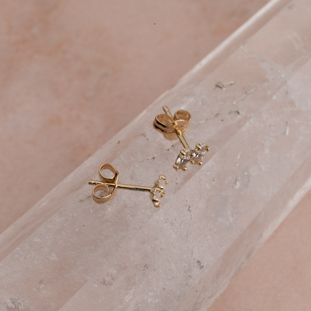 Våre øredobber Paris er laget av 100% resirkulert 9 karat massivt gull med små, marquise slipte kubiske zirkoniasteiner. Øredobbene er designet med to små marquis slipte - eller øyeformede - zirkoniasteiner som sitter i en omfatning i hver side. Øredobbene er speilvendte, slik at du får et pent og symmetrisk utseende når du har dem på.