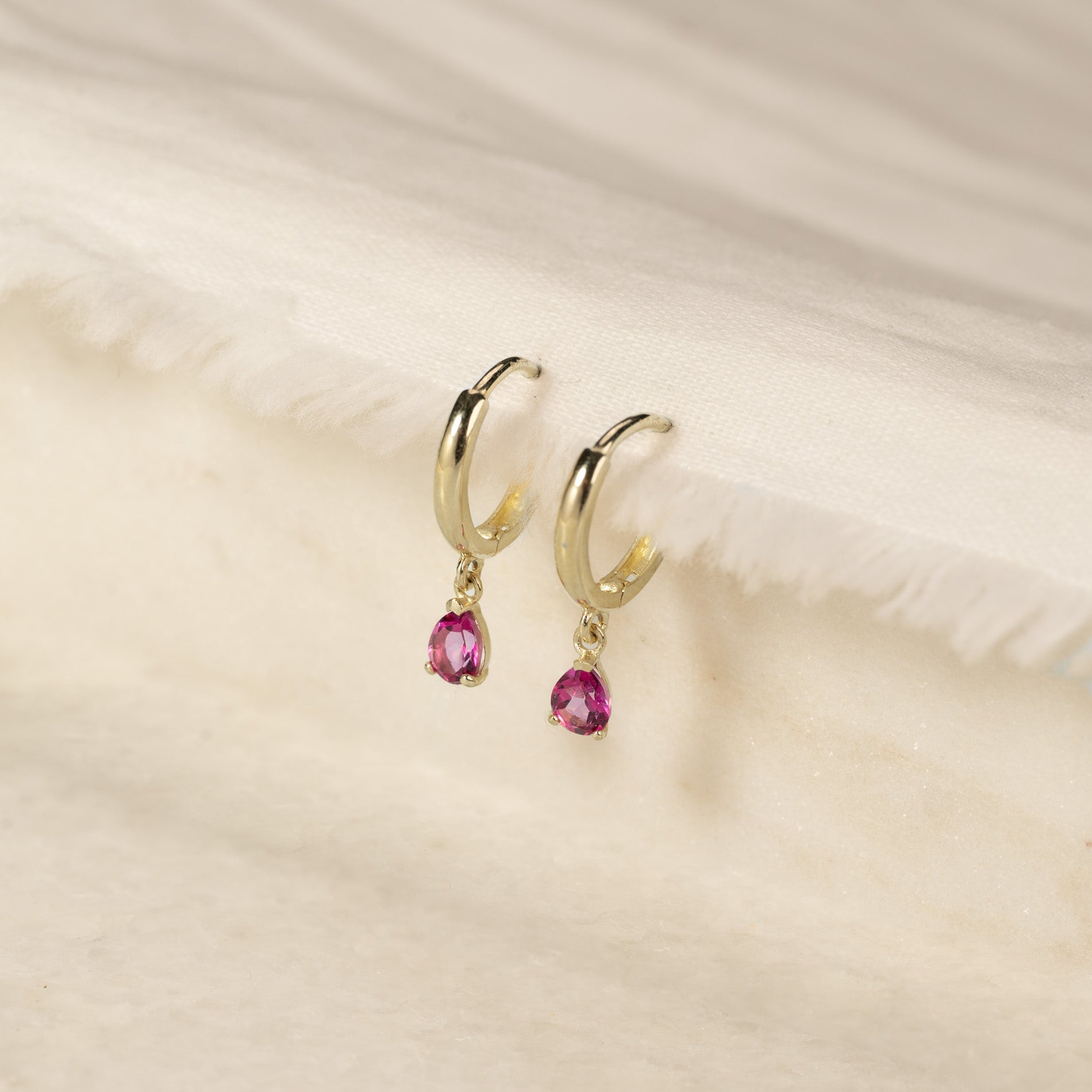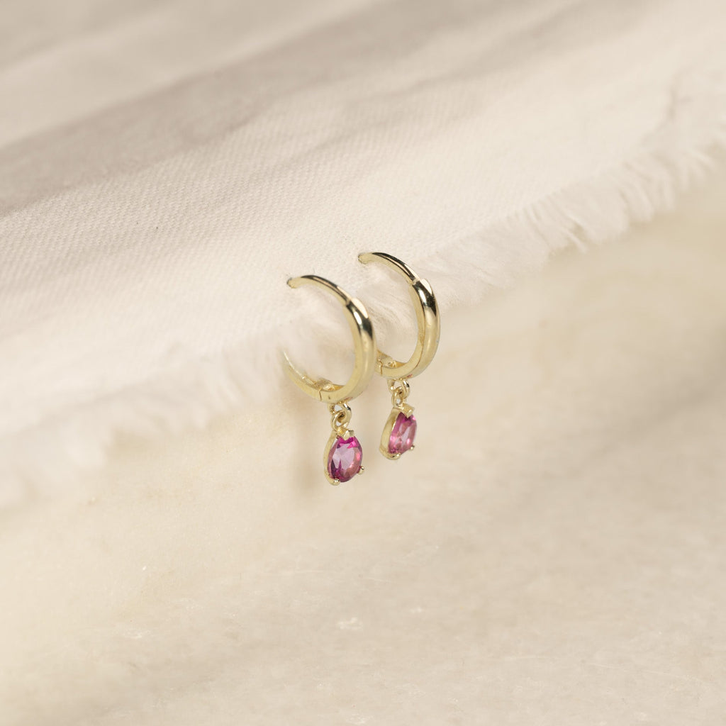 Øreringene er laget i 100% resirkulert 9 karat massivt gull, med et vakkert anheng besatt med en rosa topas. De fine øreringene er en tidløs klassiker som passer godt til både hverdag og fest, og som fint kan bæres alene eller i kombinasjon med andre øredobber.