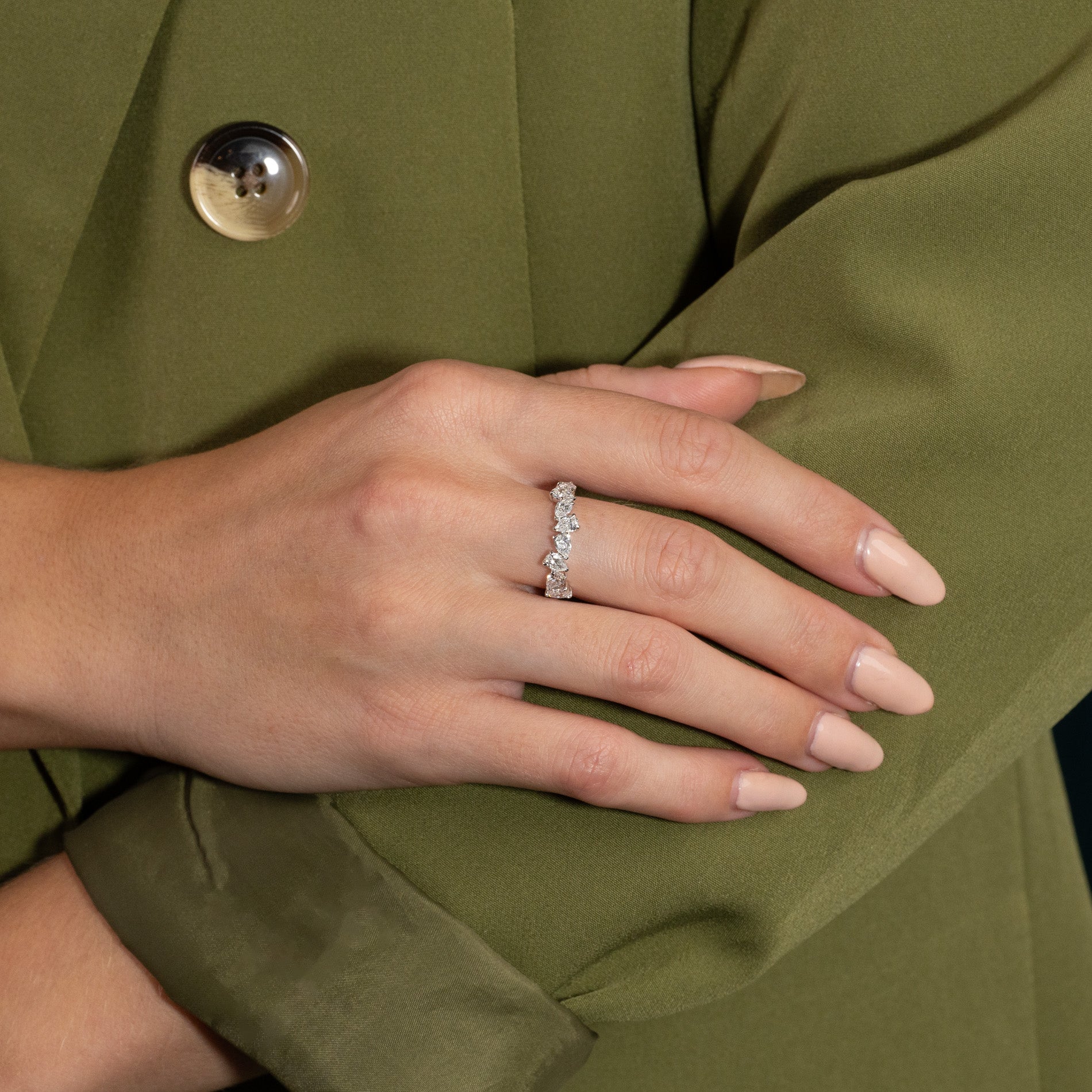 De 8 laboratorieskapte diamantene har en vekt på 1,2 ct., og har farge E/F (River) og en klarhet på VVS. Smykket er laget med omtanke; diamantene er produsert med blant annet solenergi, og gullet er 100 % sertifisert resirkulert.