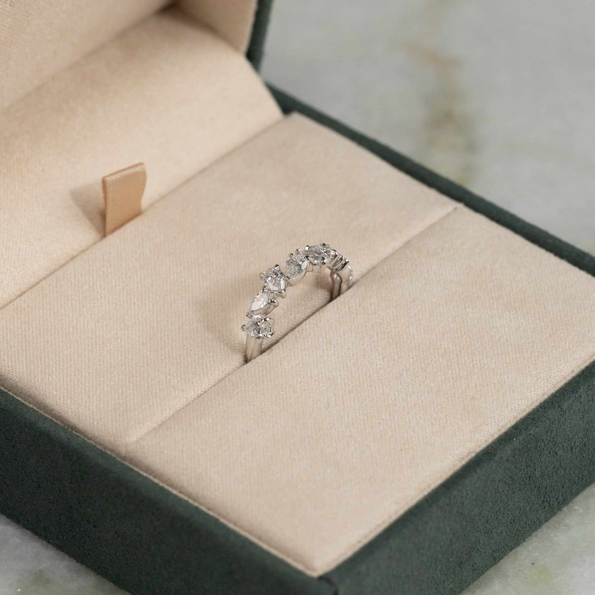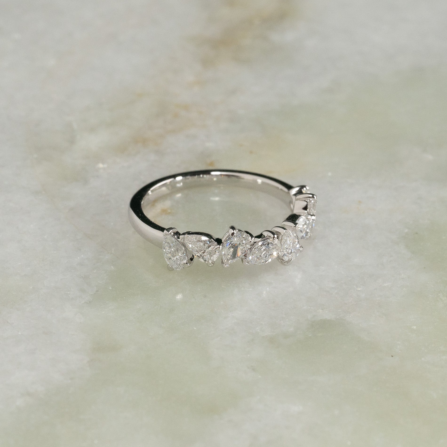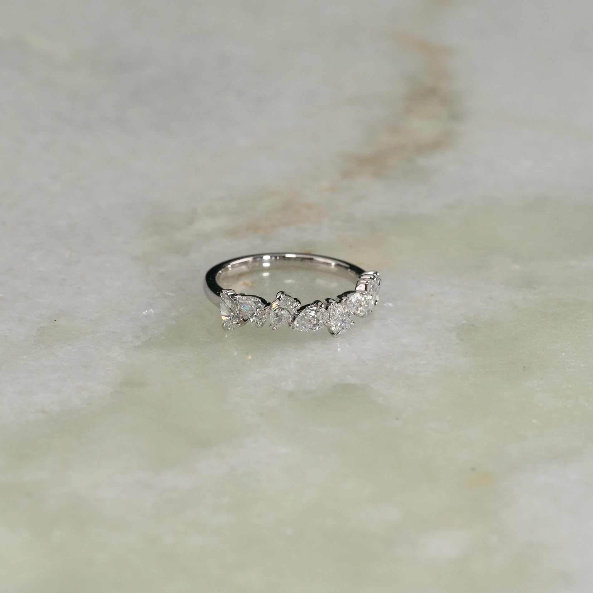 Ring i 14 karat massivt hvitt gull med 1,2 ct. pæreslipte (dråpeformede) laboratoriedyrkede diamanter, arrangert som en asymmetrisk klynge, pryder vakkert den øvre delen av ringskinnen.