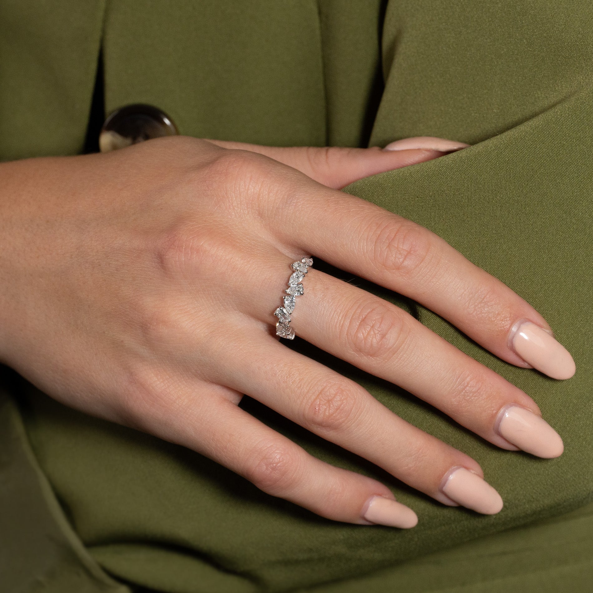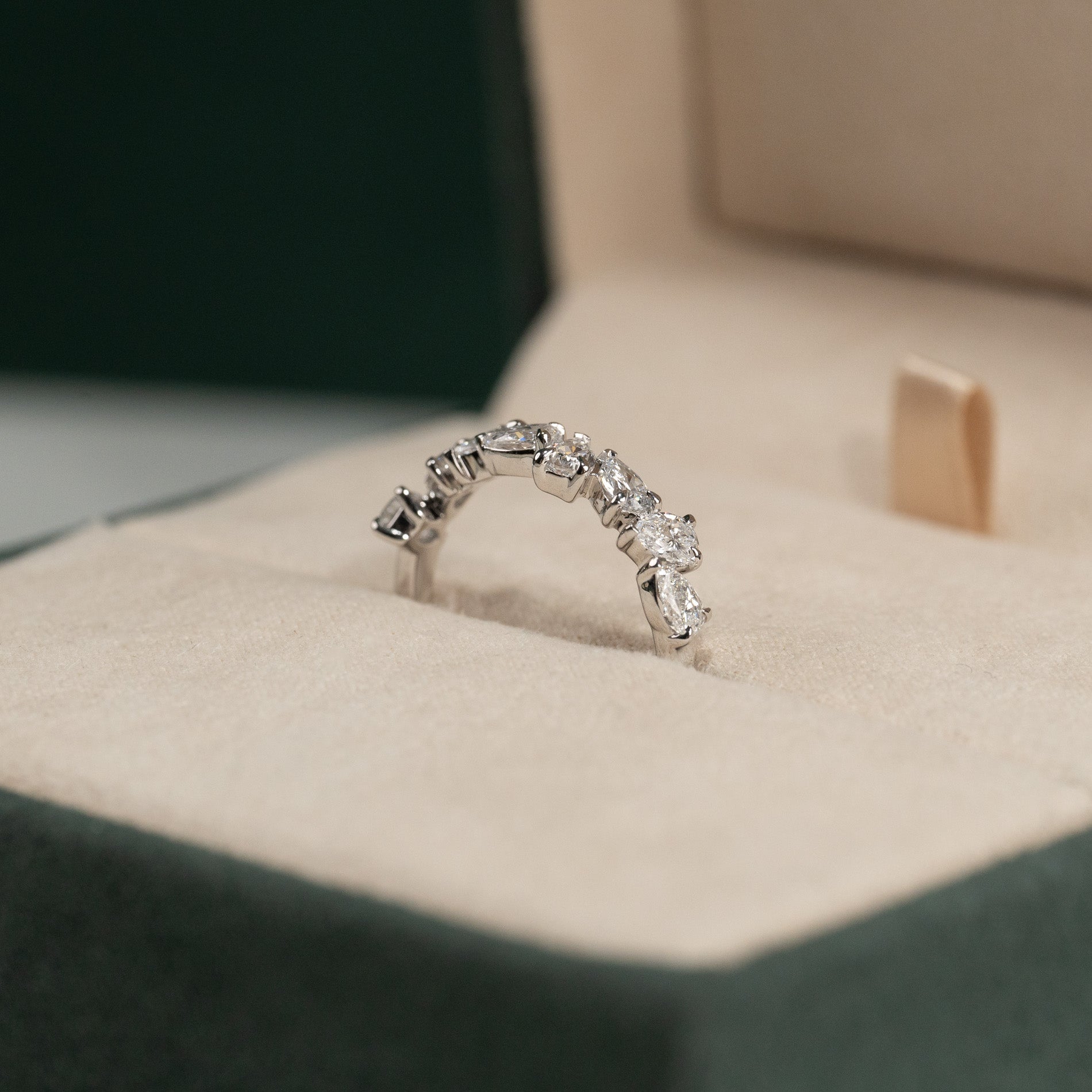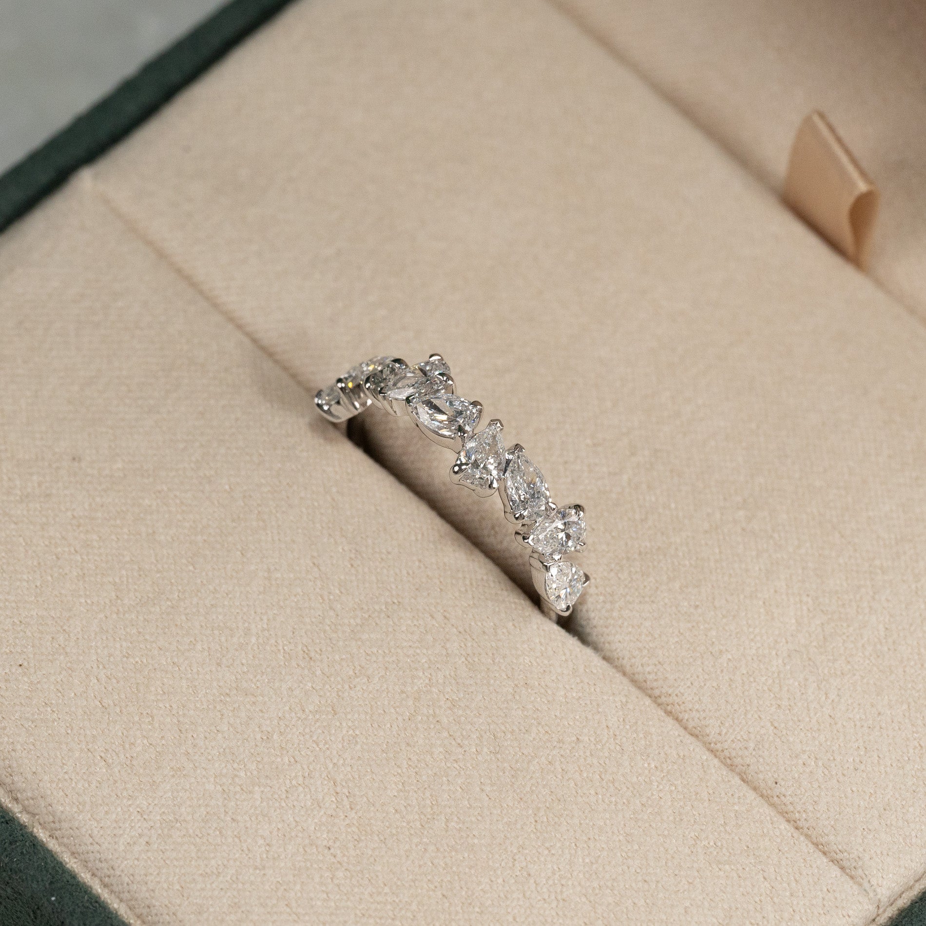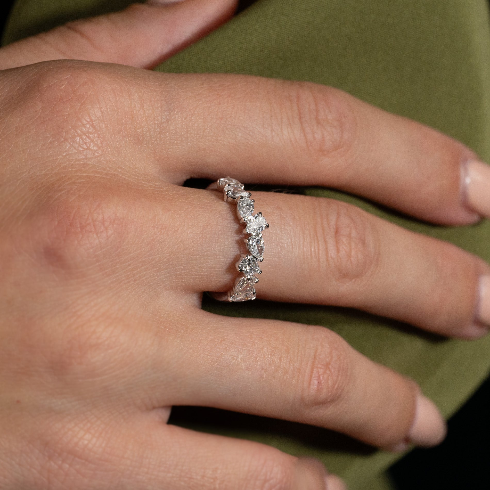 Ring i 14 karat massivt hvitt gull med 1,2 ct. pæreslipte (dråpeformede) laboratoriedyrkede diamanter, arrangert som en asymmetrisk klynge, pryder vakkert den øvre delen av ringskinnen.