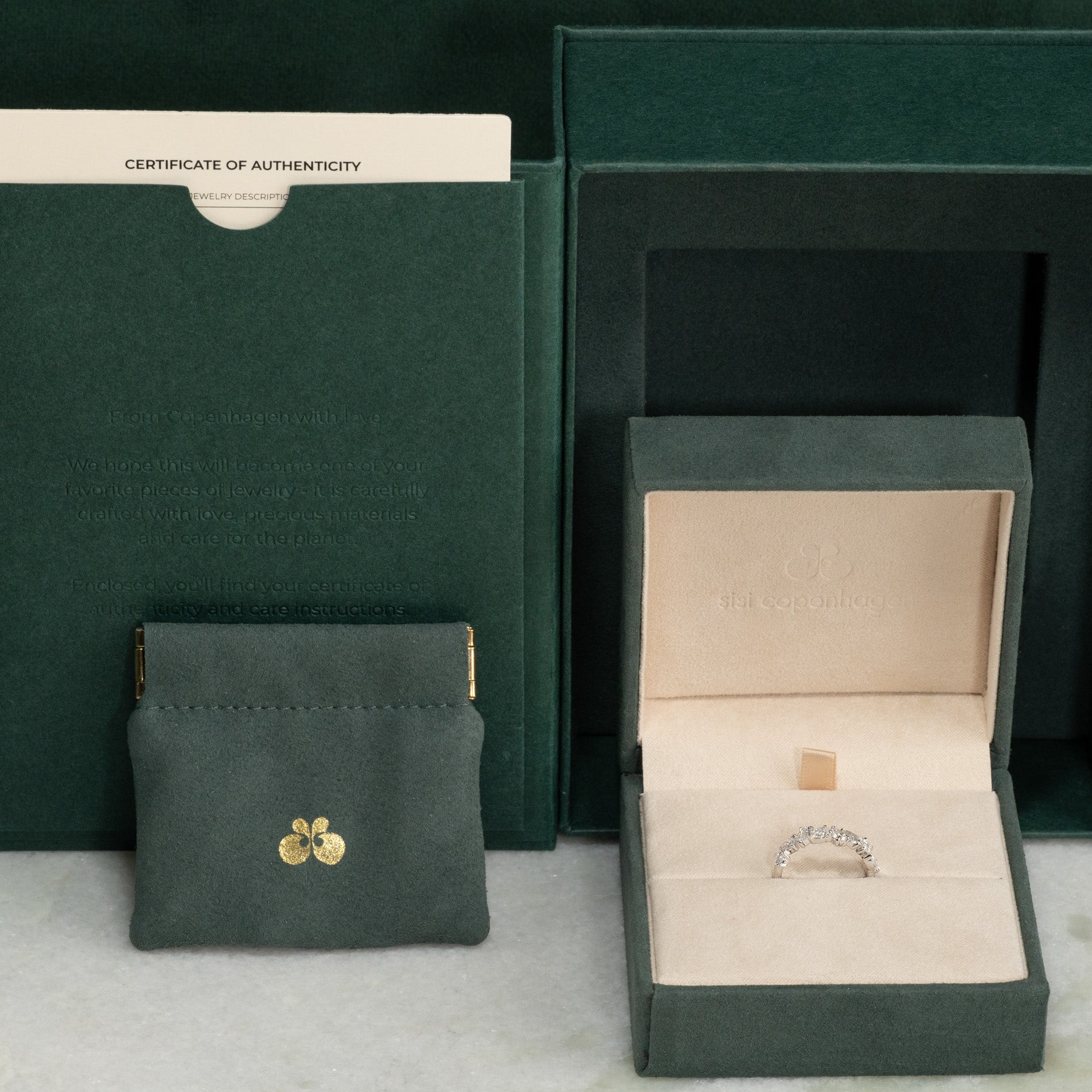 Når du mottar smykket, vil det være i vår gaveeske, bundet med et vakkert matchende silkebånd, klar til å gis som gave. Inne i esken finner du en smykkeboks, en pose og et ekthetsbevis.