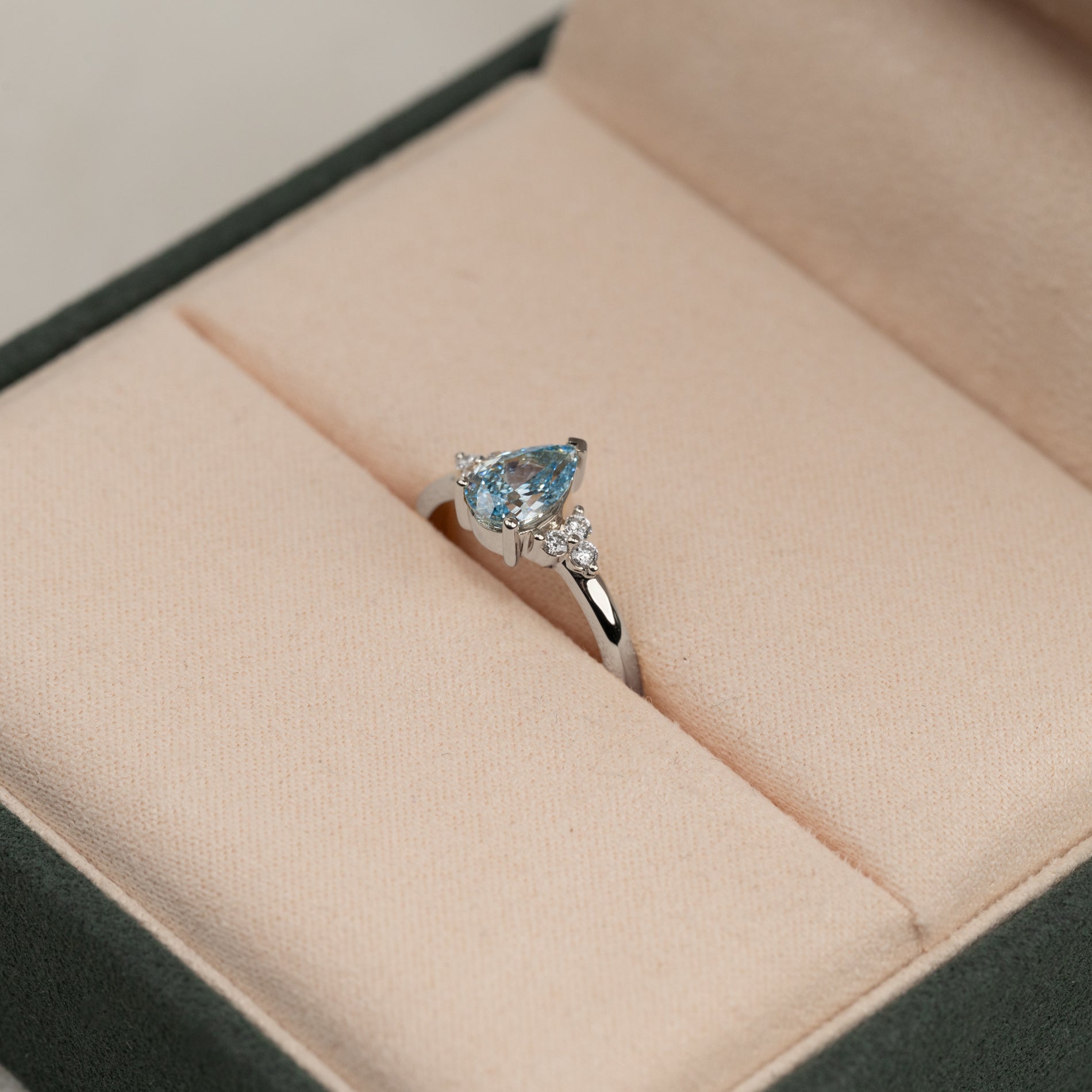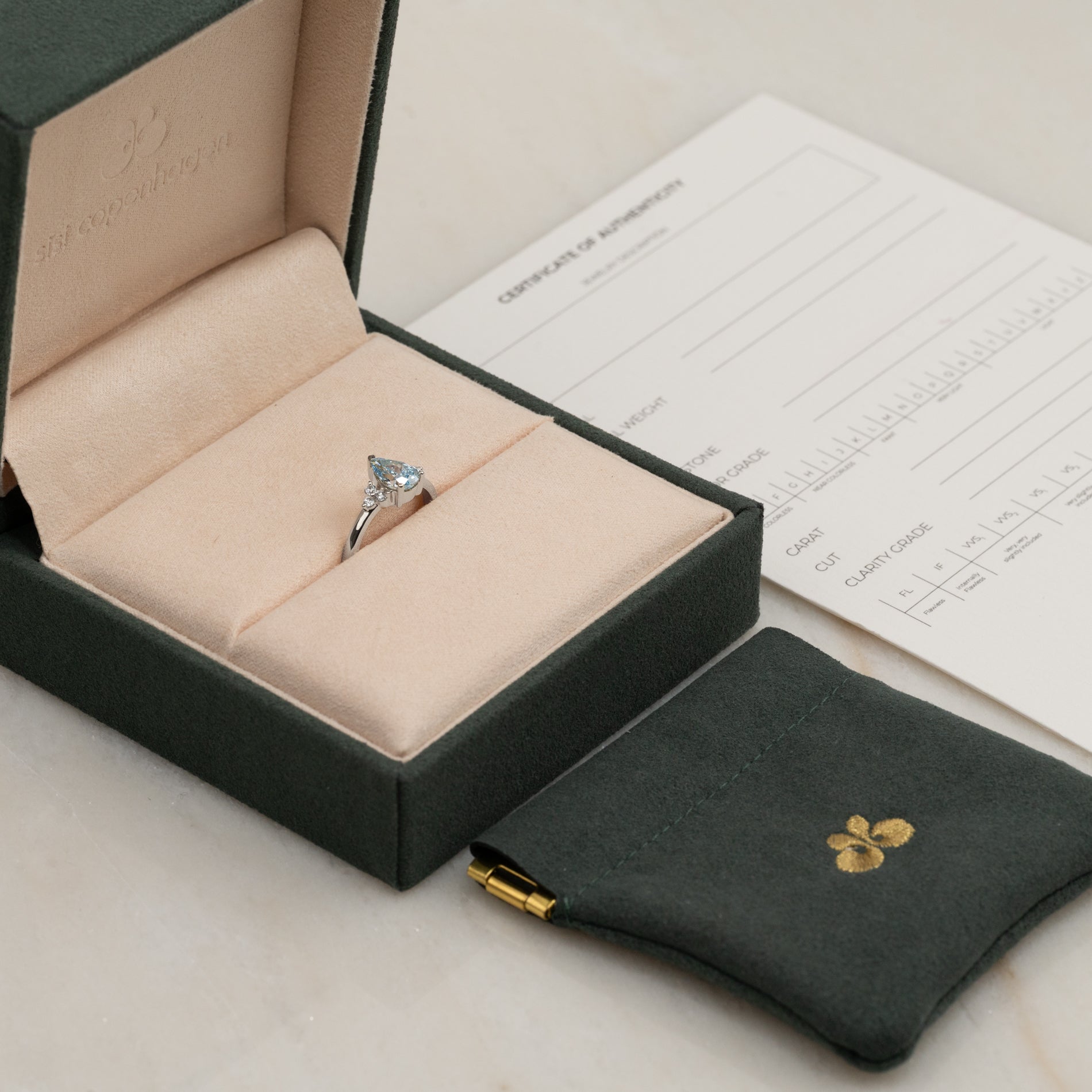 Ringen er fremstilt i 14 karat hvitt gull med en 1,0 ct pæreslipt laboratorieskapt diamant i fargen Fancy Blue og klarhet VVS. Smykket er skapt med omtanke. Diamantene er produsert blant annet ved bruk av solenergi, og gullet er 100 % sertifisert resirkulert.