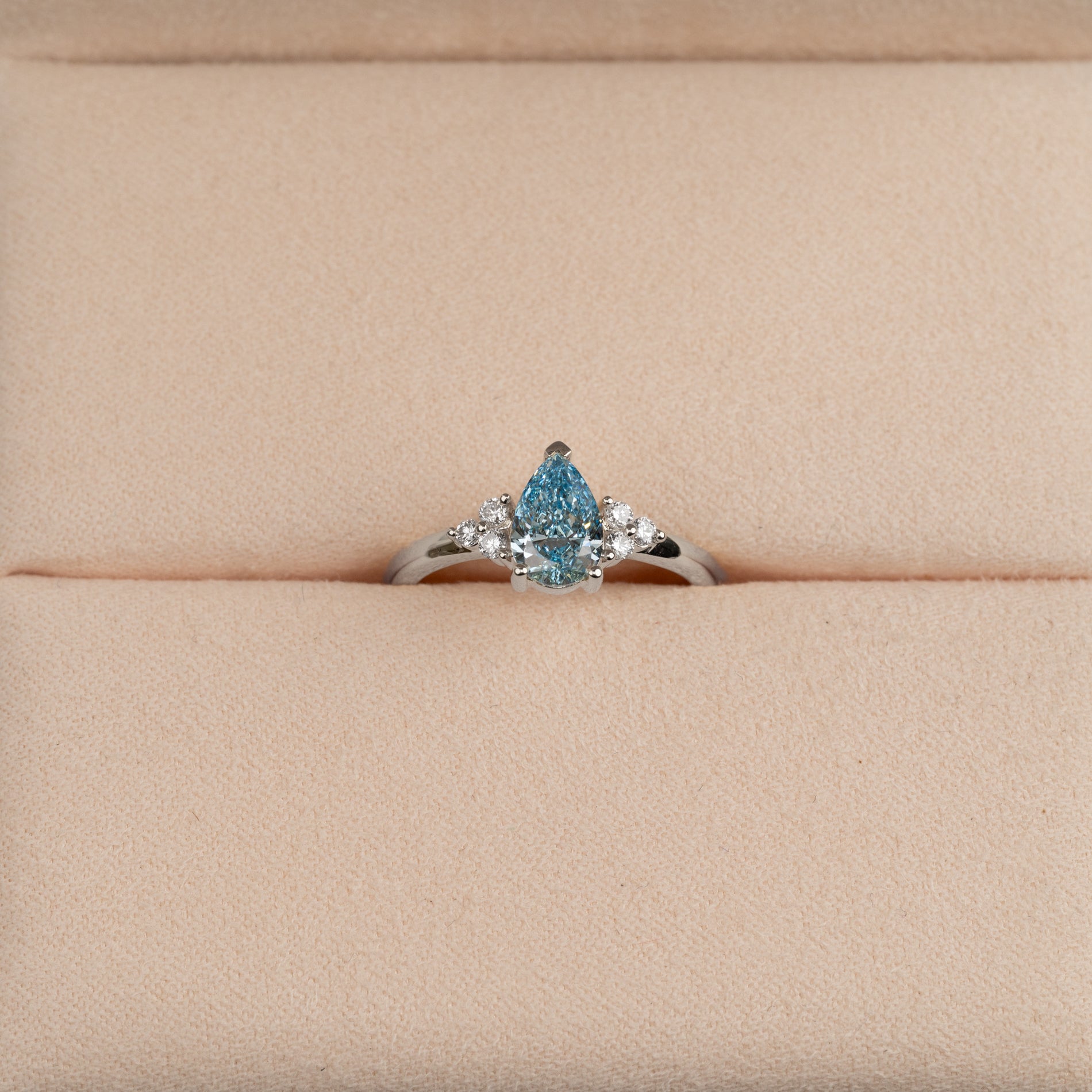 Pæreformet diamantring med en 1,0 ct blå laboratorieskapt diamant og klare sidestener