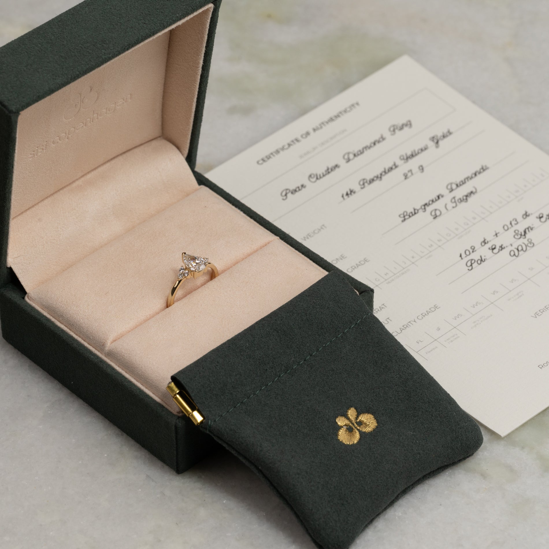 Ringen er laget i 14 karat gull med en 1,0 ct lab-grown diamant i fargen E–F (River) og klarheten VVS. Smykket er skapt med omtanke – diamantene er produsert med blant annet solenergi, og gullet er 100 % sertifisert resirkulert.