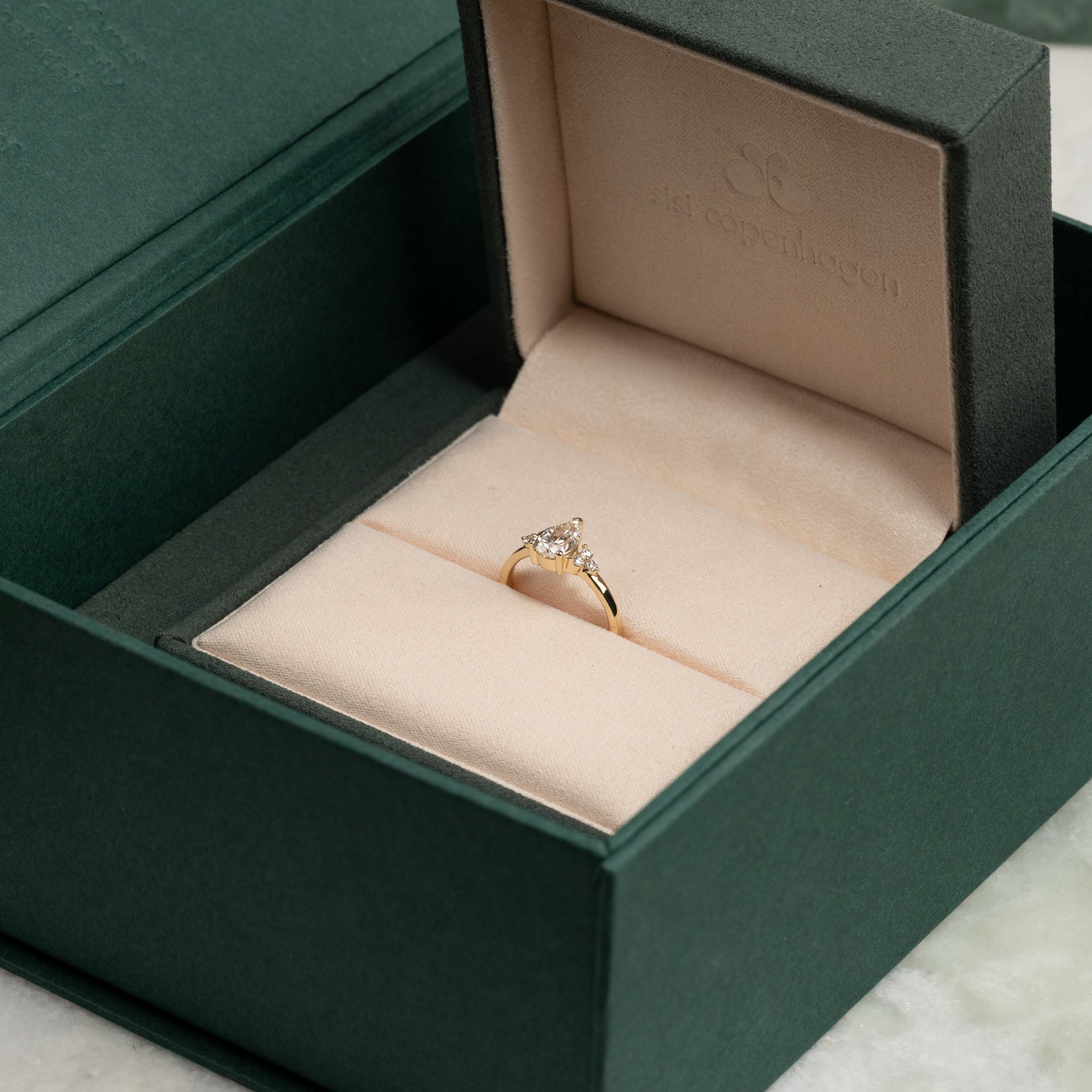 Smykket er pent og sikkert plassert i en smykkeboks som er trukket med vegansk semsket skinn.