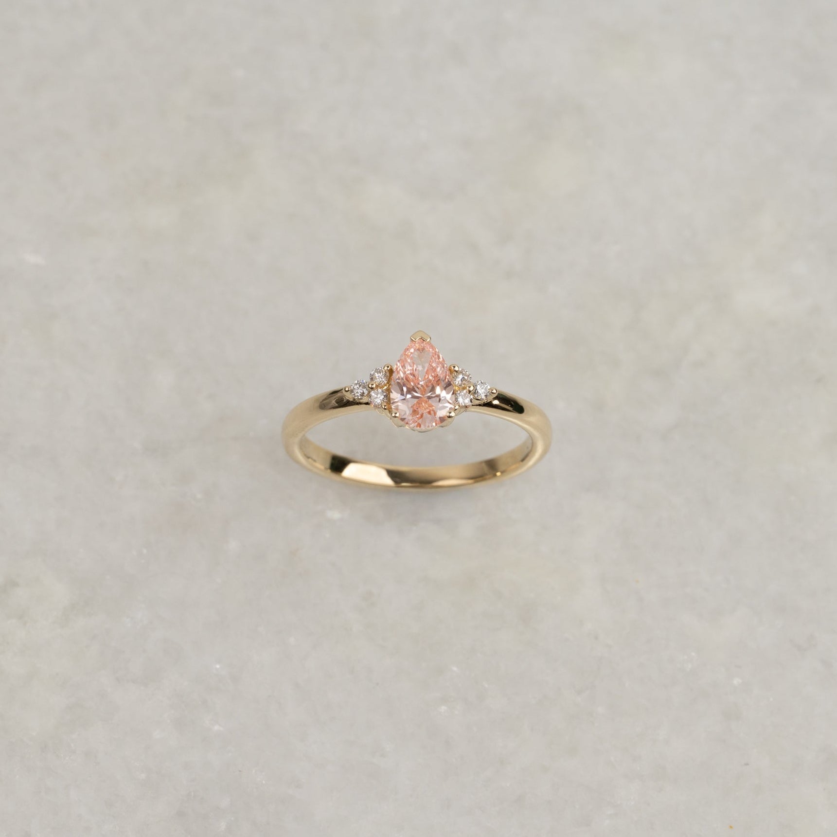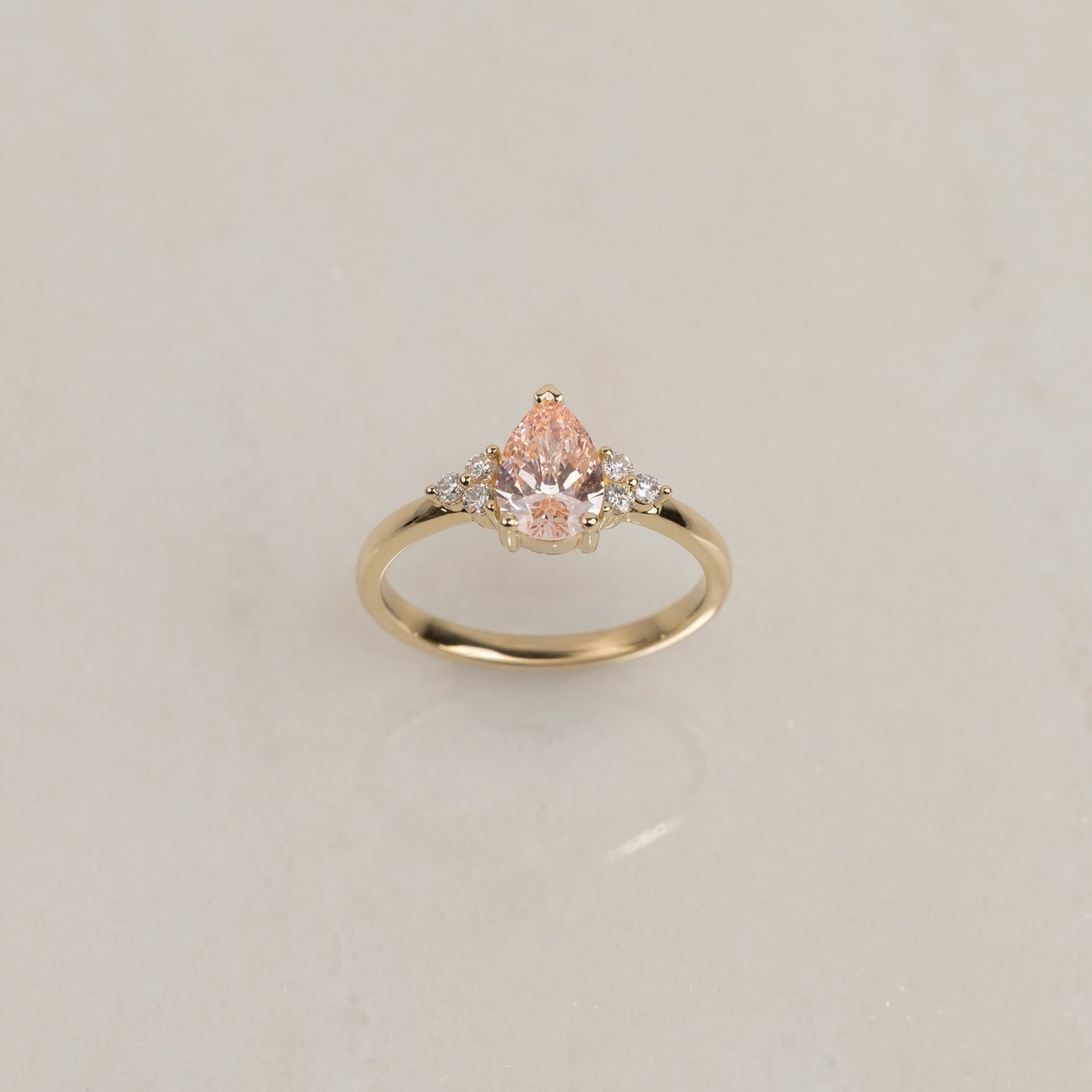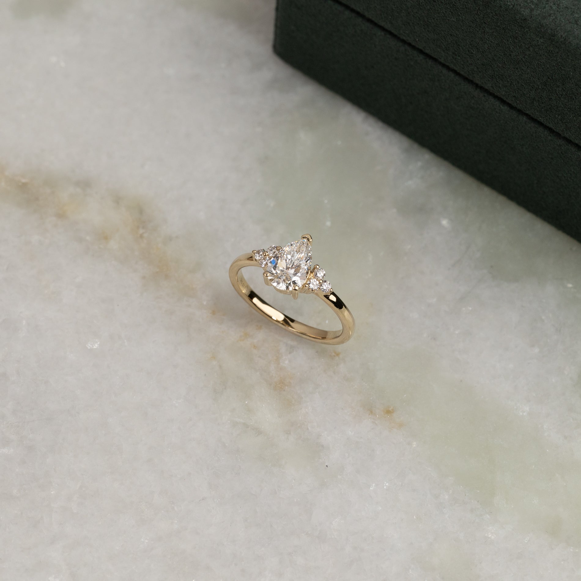 Ring i 14 karat gull med et unikt og detaljert uttrykk. I sentrum sitter en vakker pæreformet lab-grown diamant, som fremheves av tre mindre diamanter på hver side.