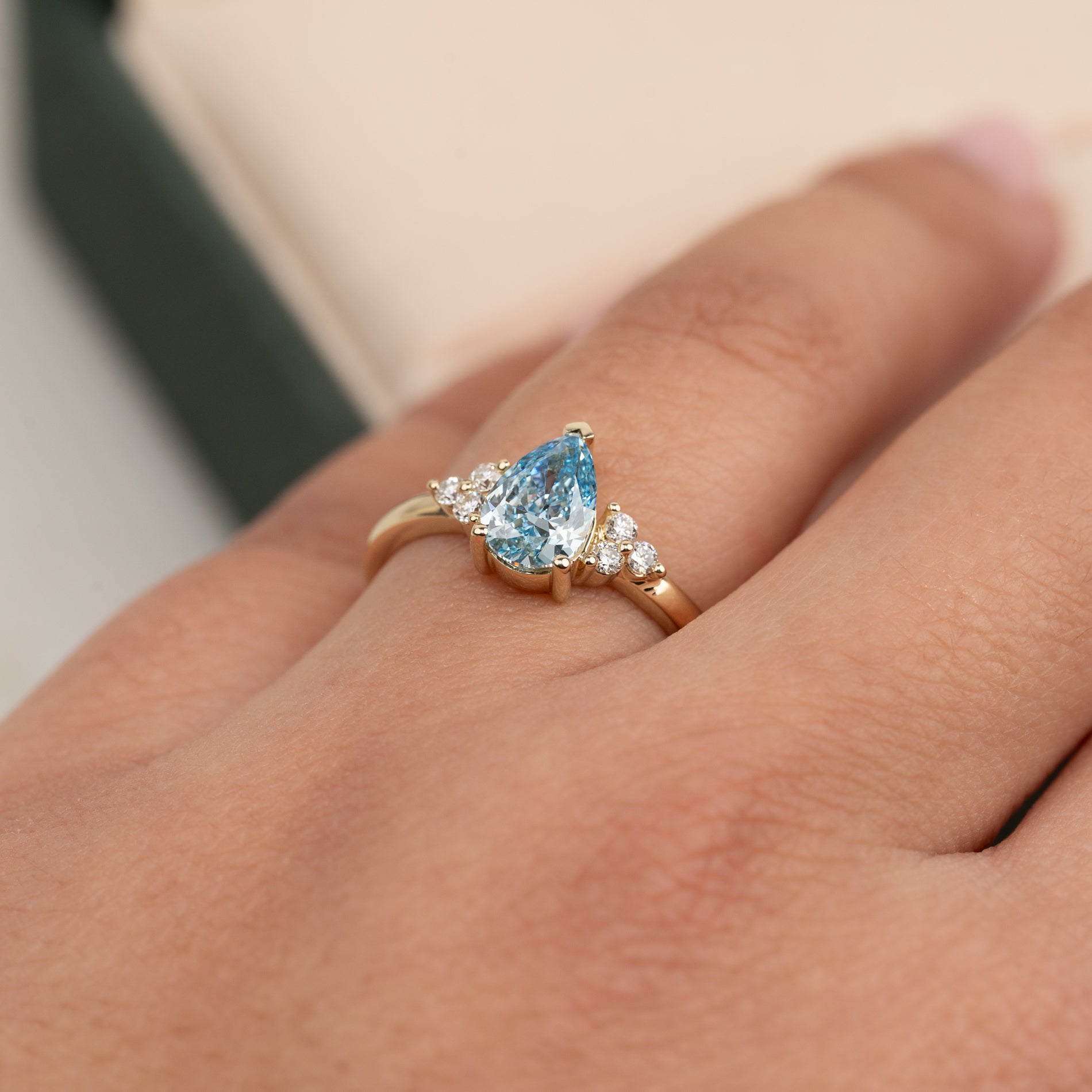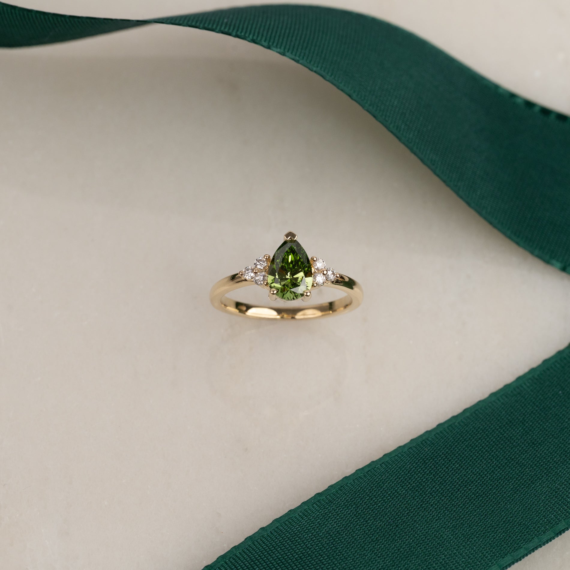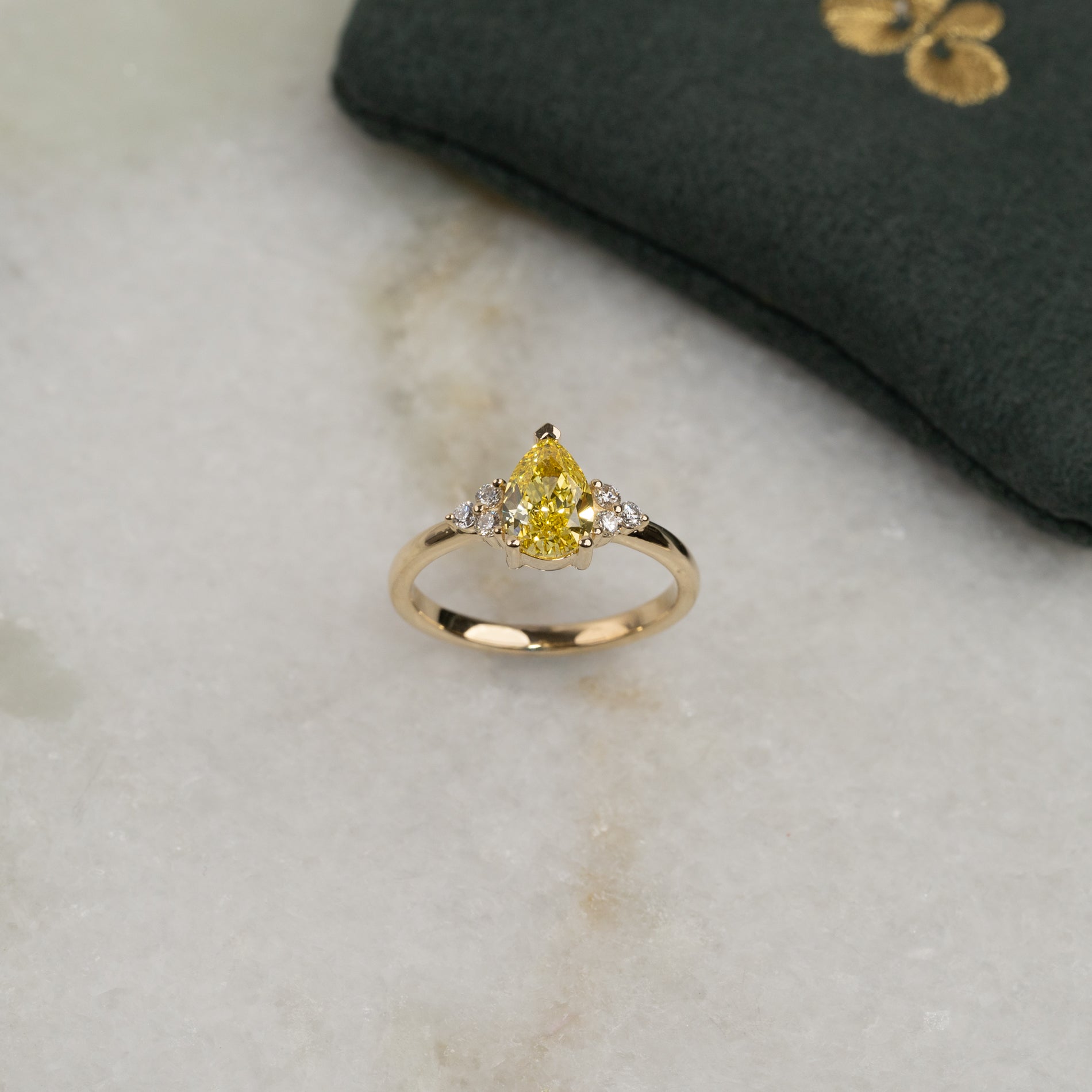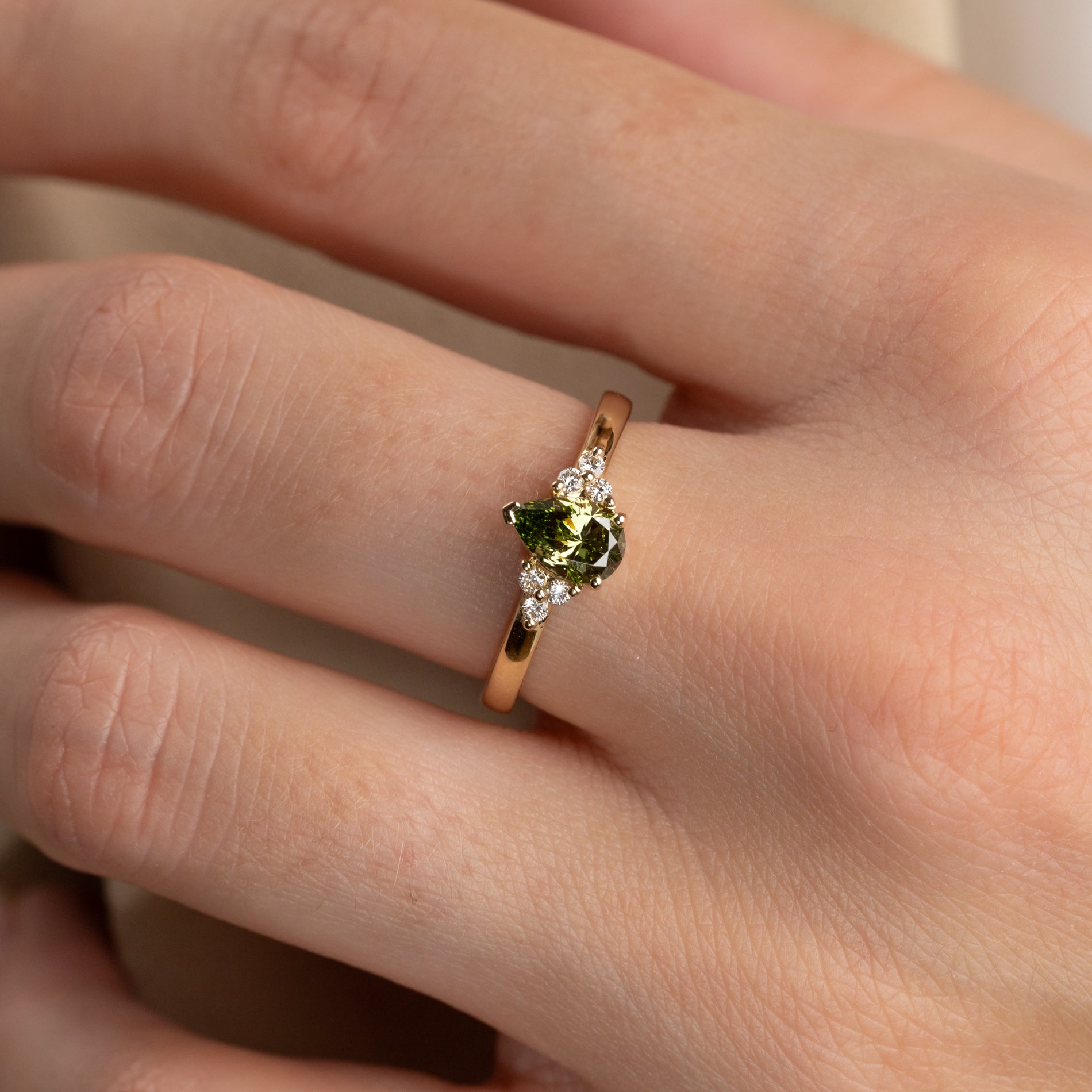 Ring i 14 karat gull med et unikt og detaljert uttrykk. I sentrum sitter en vakker pæreformet lab-grown diamant, som fremheves av tre mindre diamanter på hver side.