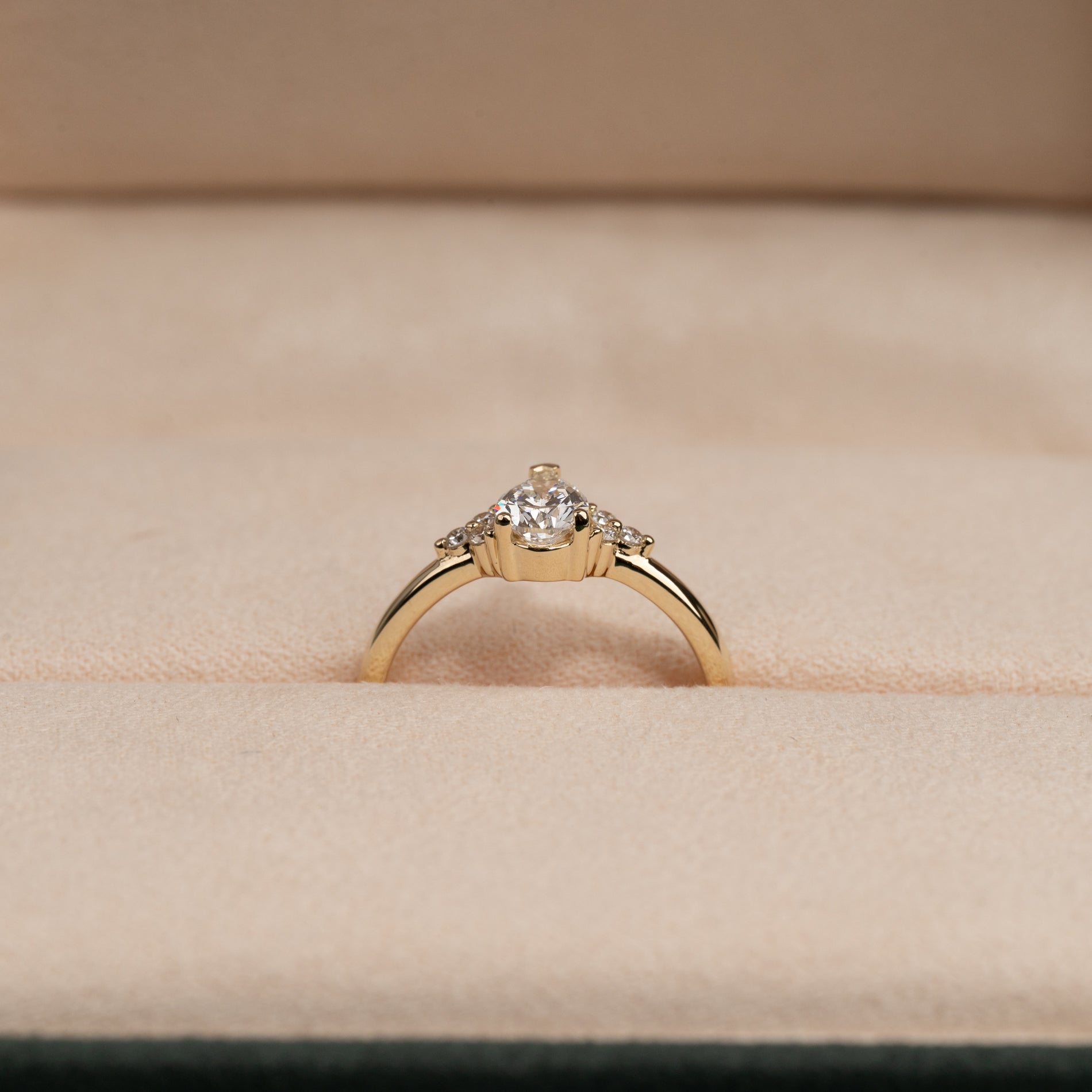 Ring i 14 karat gull med et unikt og detaljert uttrykk. I sentrum sitter en vakker 0,6 ct pæreformet lab-grown diamant, som fremheves av tre mindre diamanter på hver side. Til sammen gir de ringen en total caratvekt på 0,65 ct.