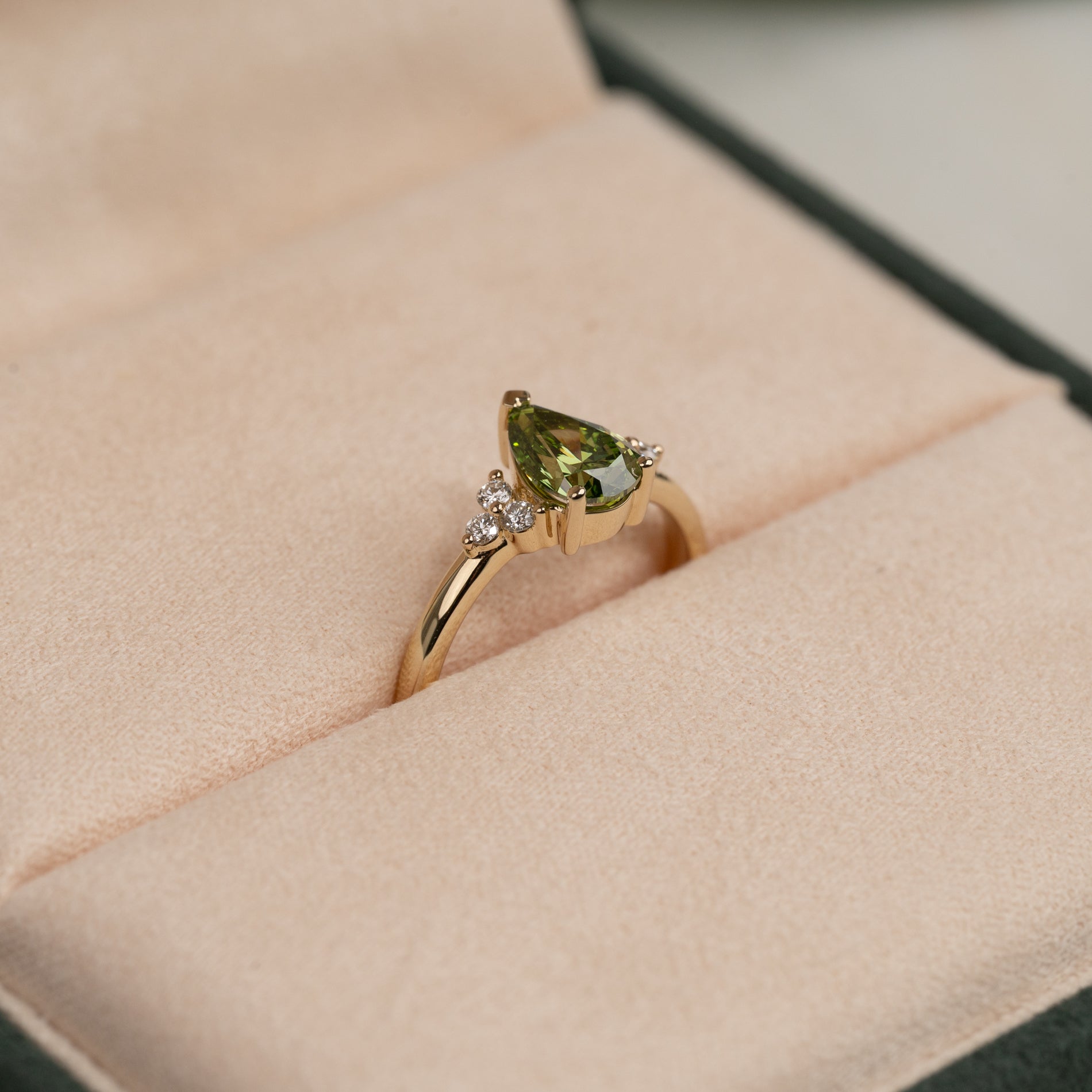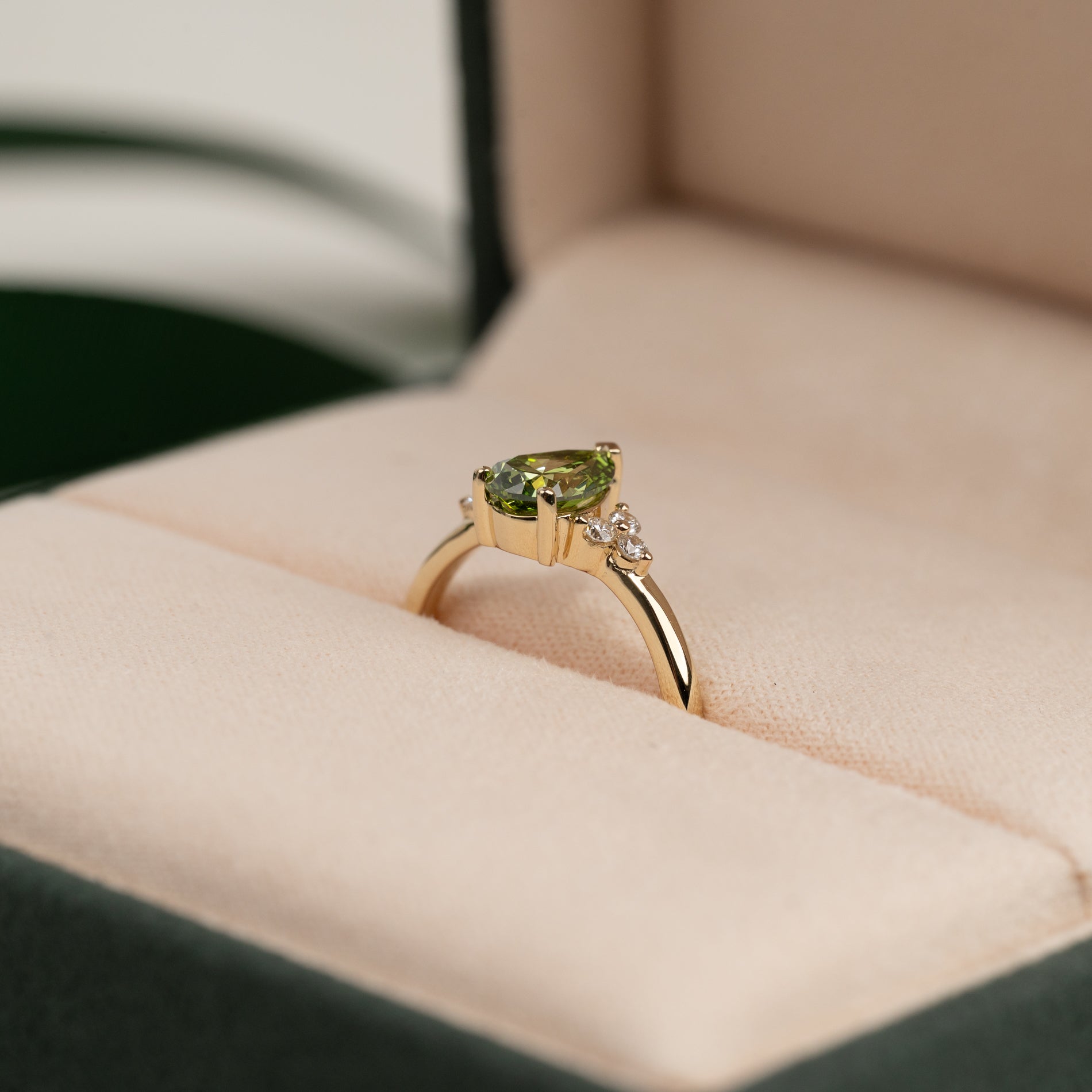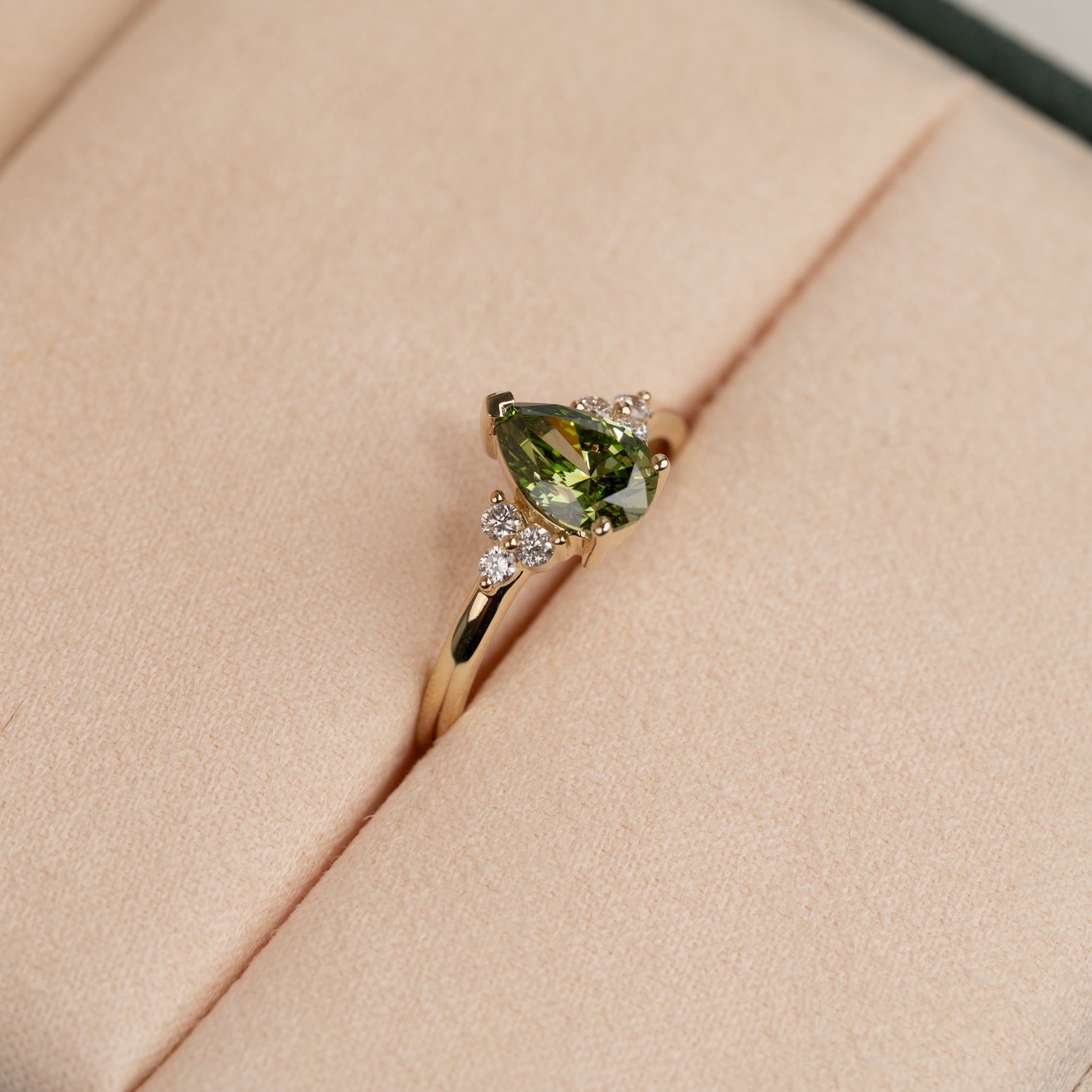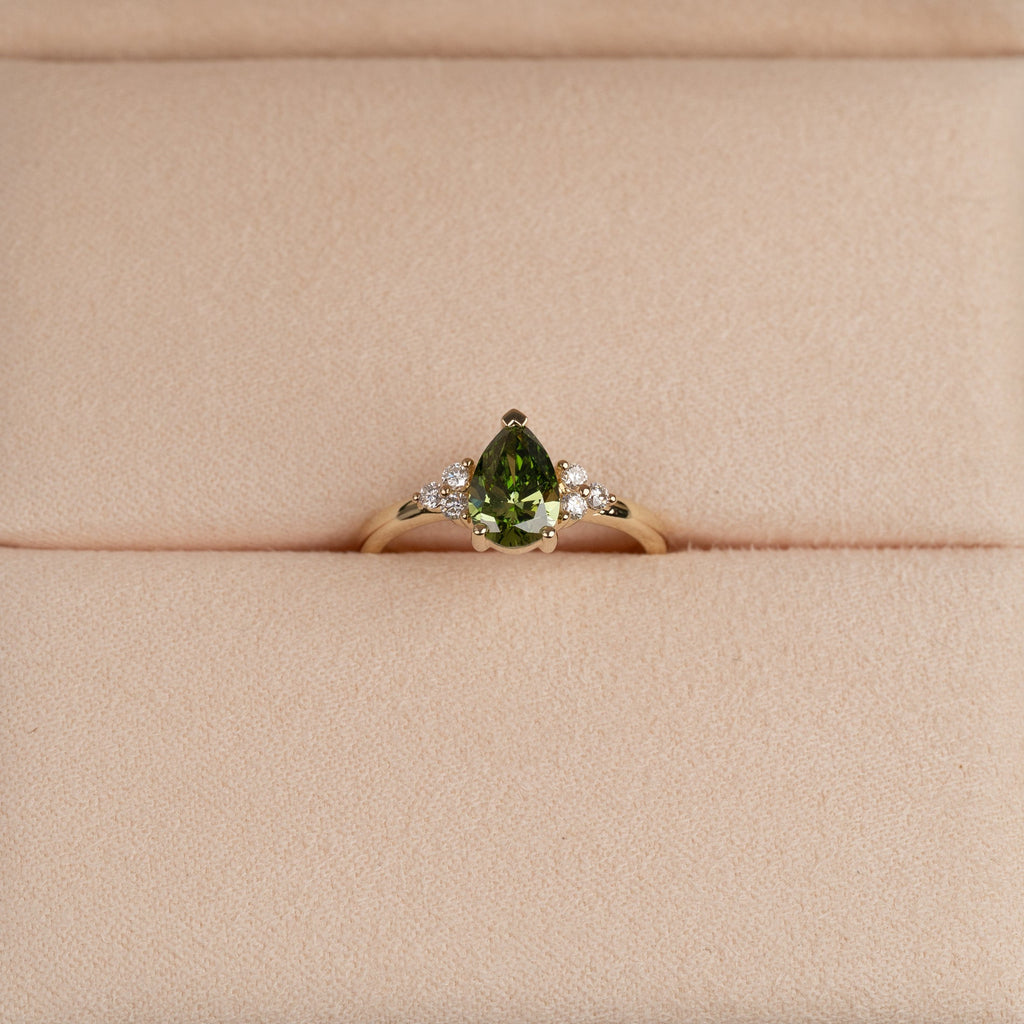 Ringen er laget i 14 karat gull med en 1,0 ct pæreformet lab-grown diamant i en nydelig "fancy green" farge og klarheten VVS. Smykket er skapt med omtanke – diamantene er produsert med blant annet solenergi, og gullet er 100 % sertifisert resirkulert.