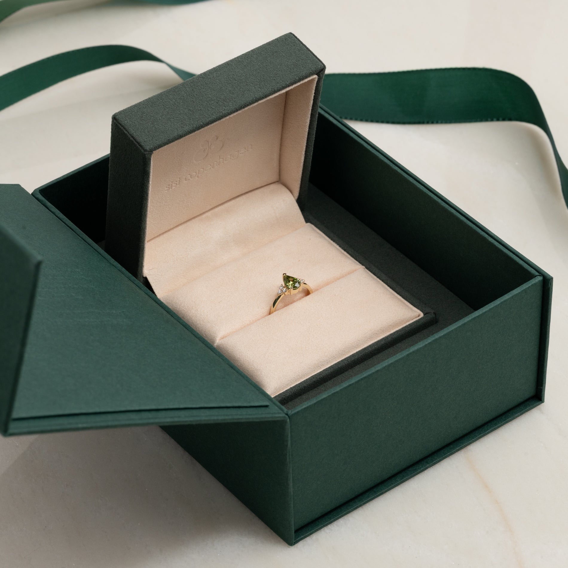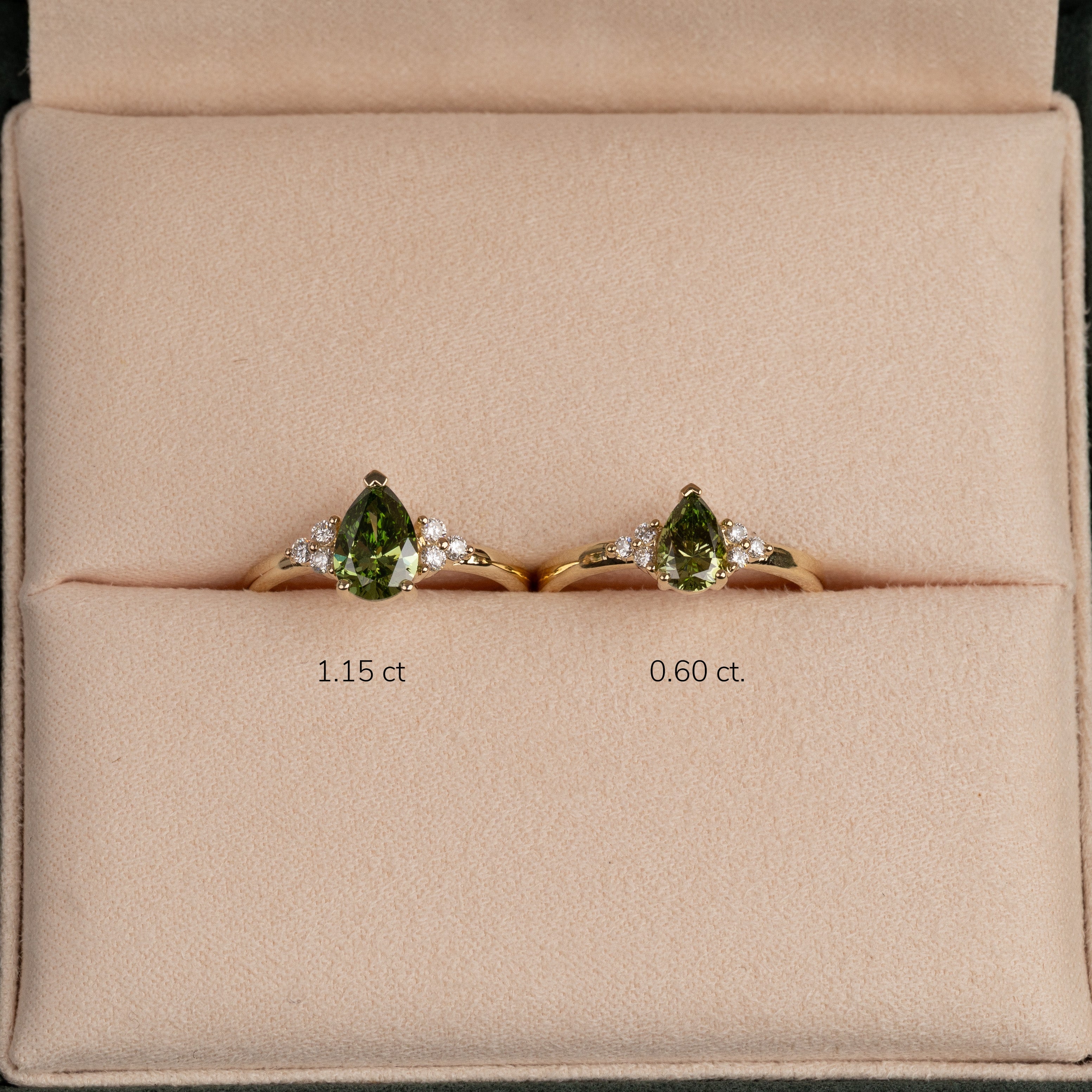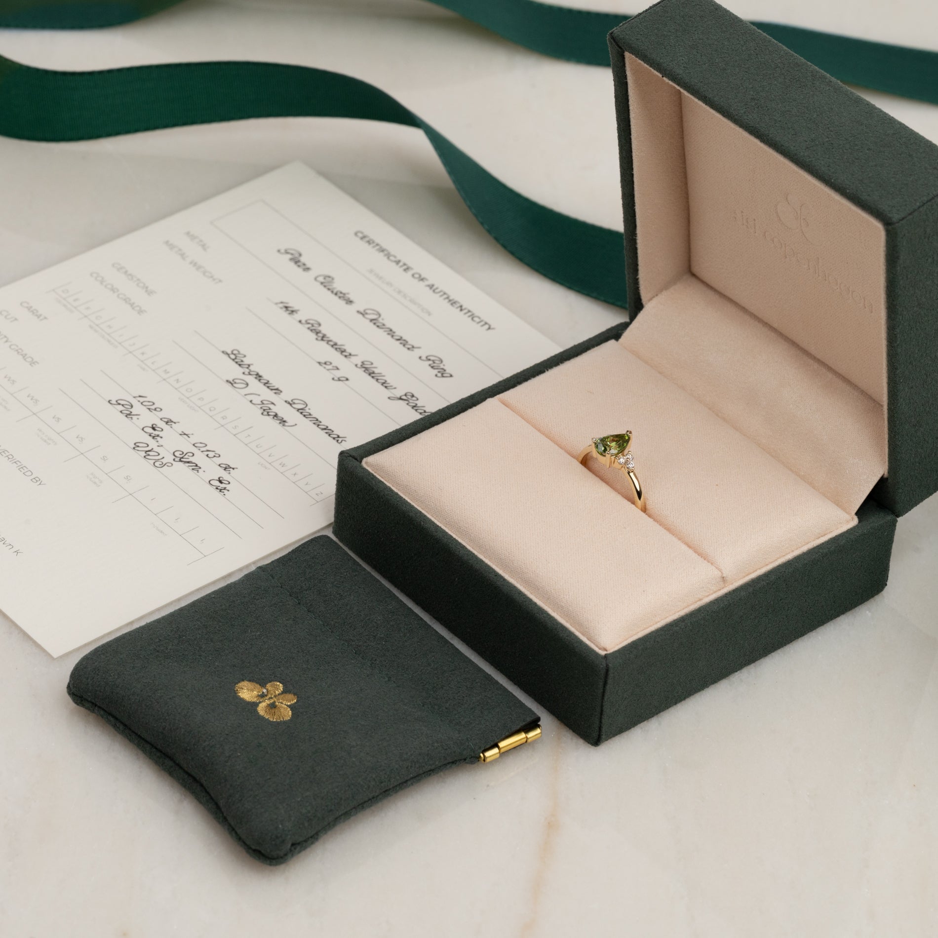 Ringen er laget i 14 karat gull med en 1,0 ct pæreformet lab-grown diamant i en nydelig "fancy green" farge og klarheten VVS. Smykket er skapt med omtanke – diamantene er produsert med blant annet solenergi, og gullet er 100 % sertifisert resirkulert.