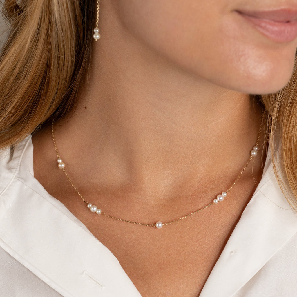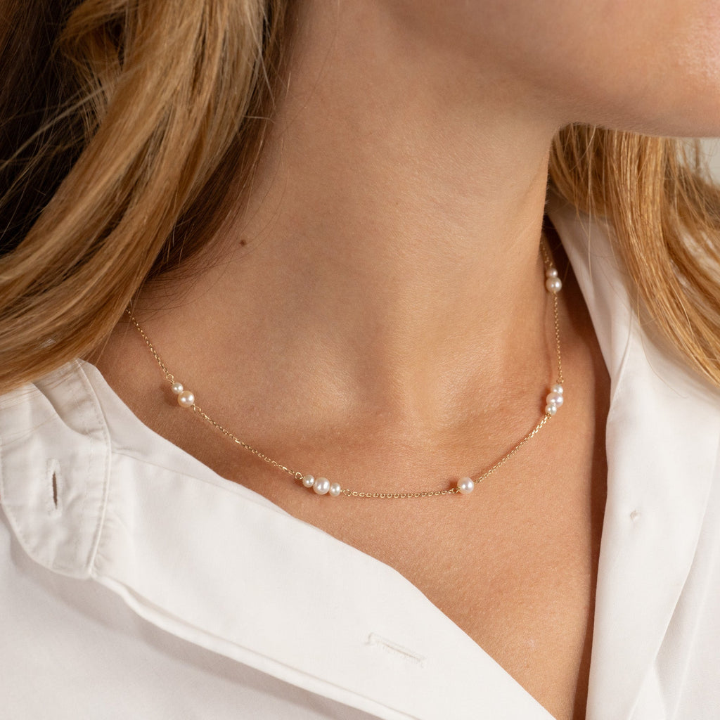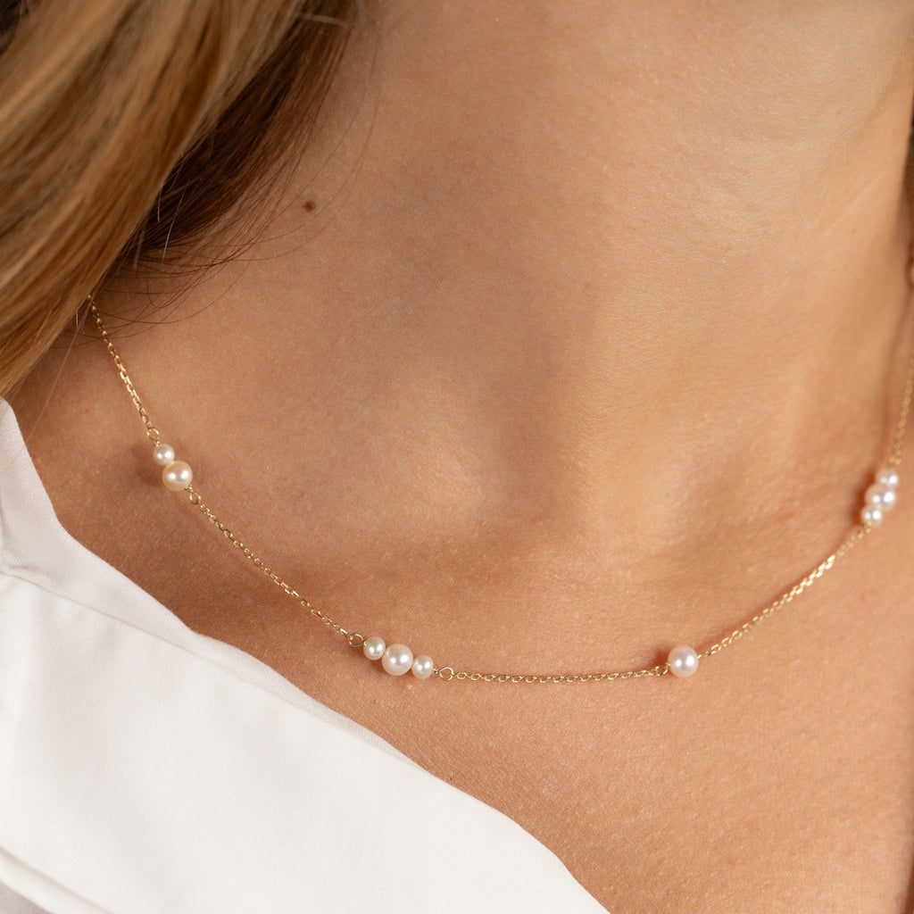 Halskjede i 100% resirkulert 9 karat massivt gull med små, ovale, hvite ferskvannsperler