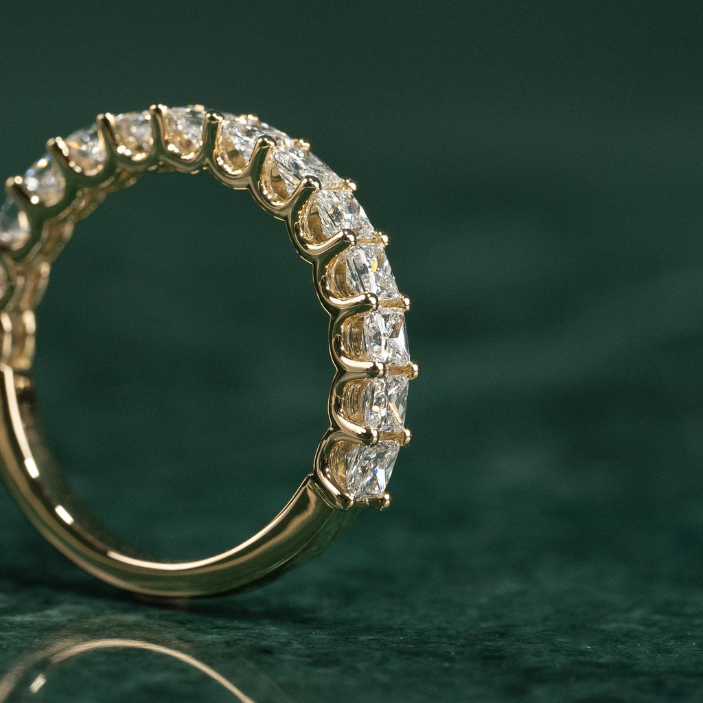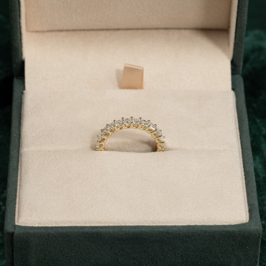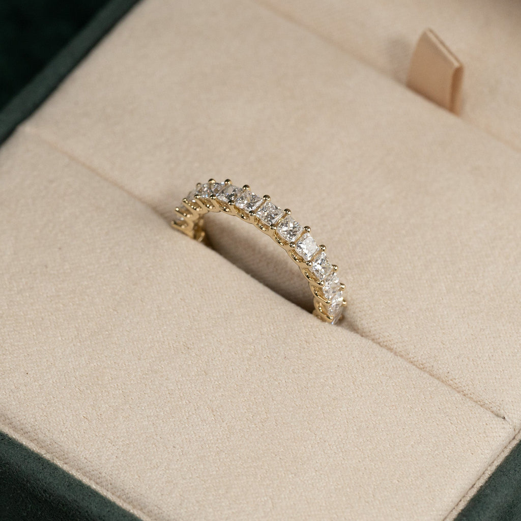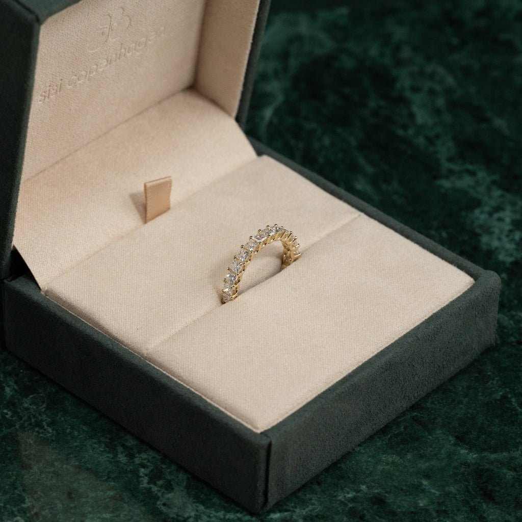 Allianseringen er laget i 14 kt. massivt gull og 14 prinsesseslipte lab-dyrkede diamanter på til sammen 1,5 ct. ned langs øvre halvdel av ringskinnen.