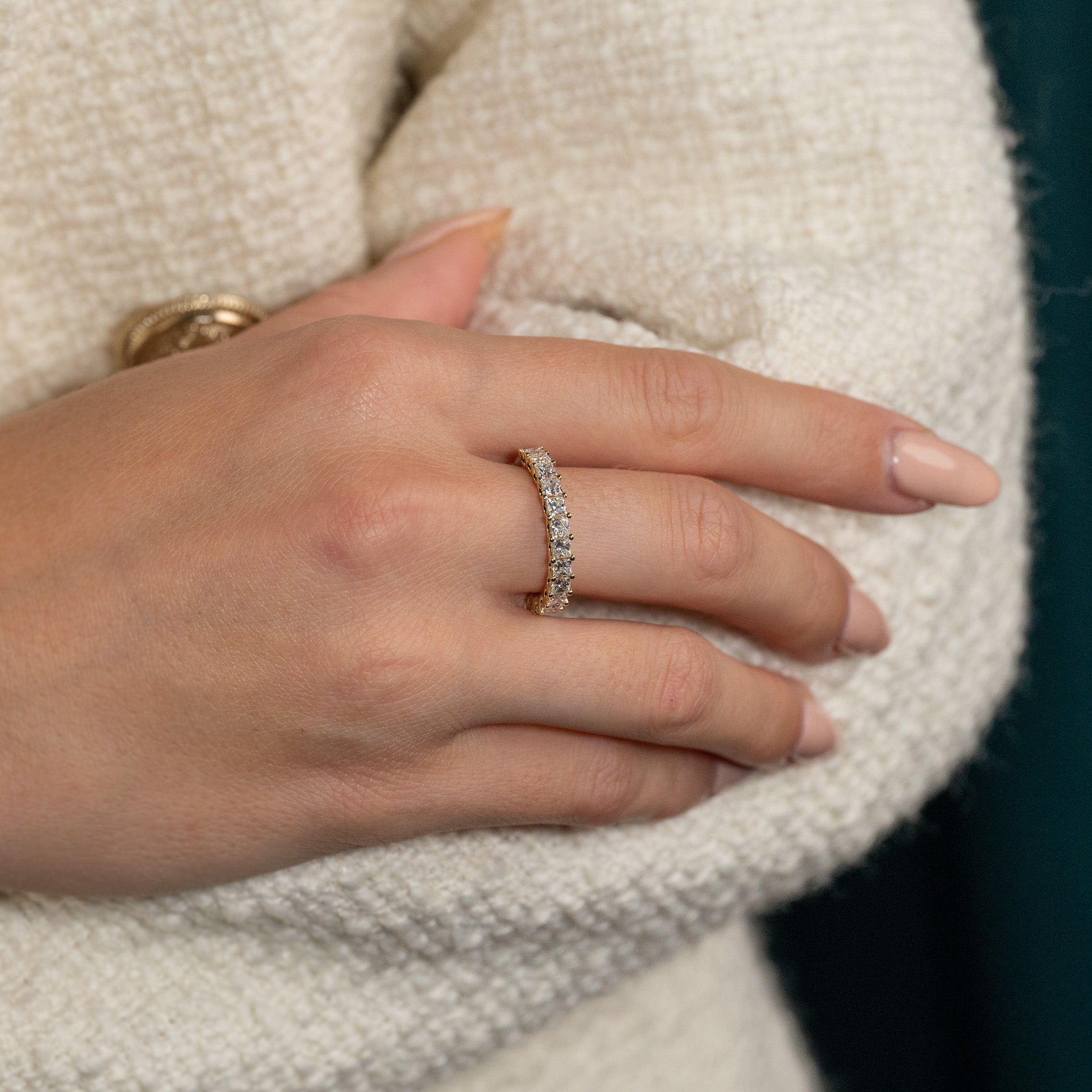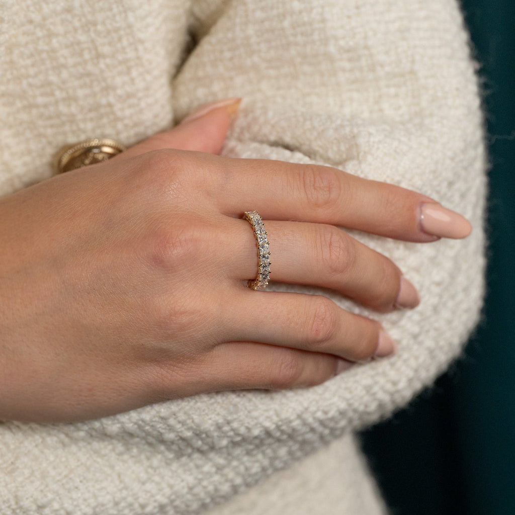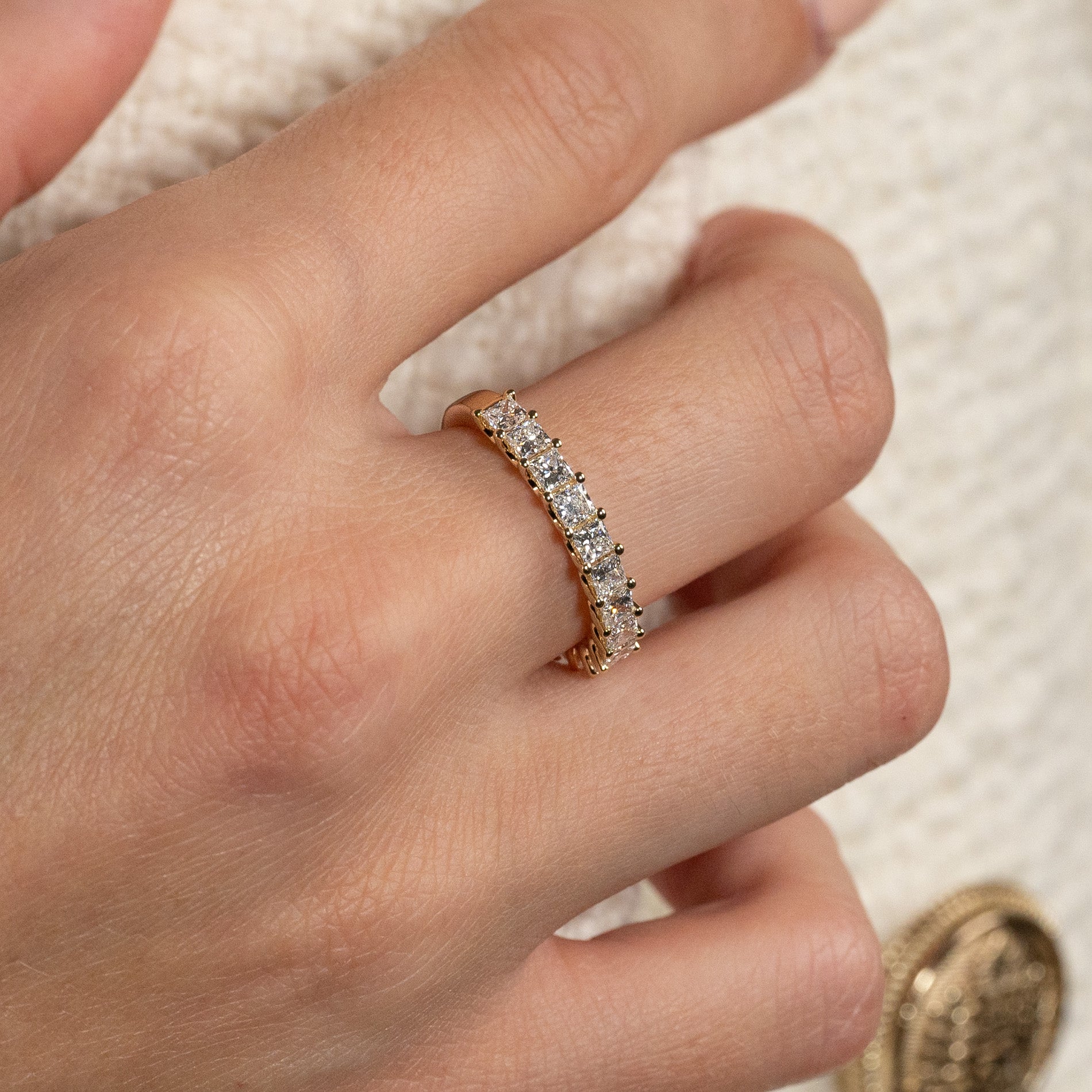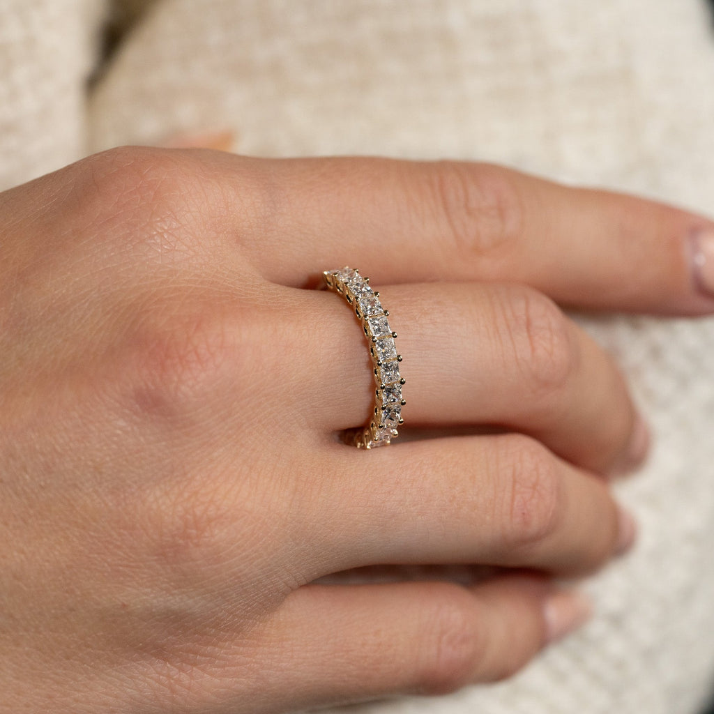Allianseringen er laget i 14 kt. massivt gull og 14 prinsesseslipte lab-dyrkede diamanter på til sammen 1,5 ct. ned langs øvre halvdel av ringskinnen.