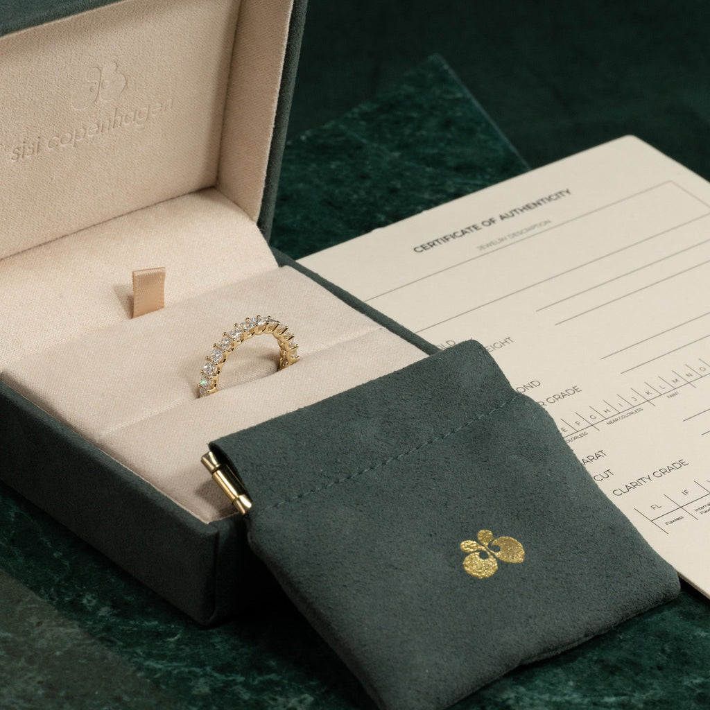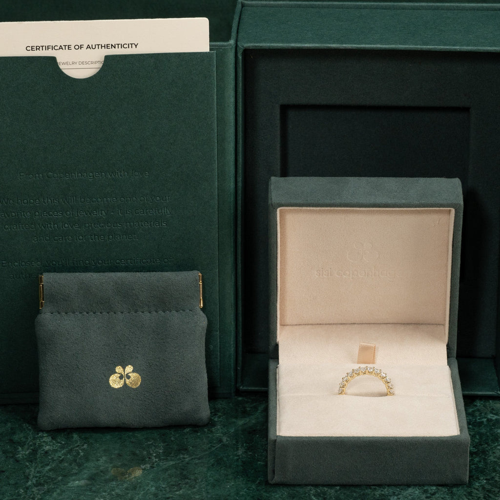 Når du mottar smykket, vil det være i vår gaveeske, bundet med et vakkert matchende silkebånd, klar til å gis som gave. Inne i esken finner du en smykkeboks, en pose og et ekthetsbevis.