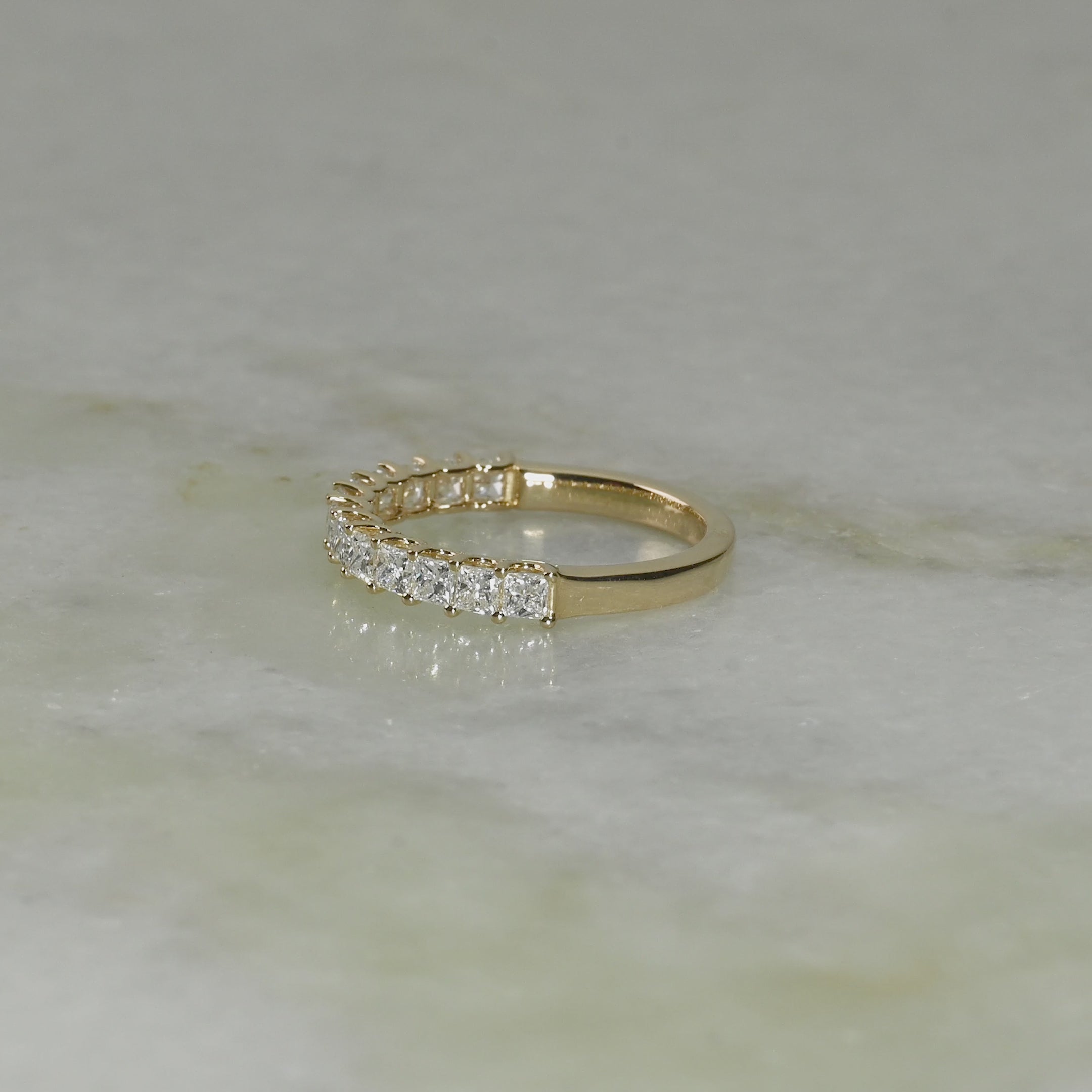 Allianseringen er laget i 14 karat massivt gull og inneholder 13 prinsesseslipte laboratoriedyrkede diamanter med en totalvekt på 1,0 ct., plassert langs den øvre halvdelen av ringskinnen.