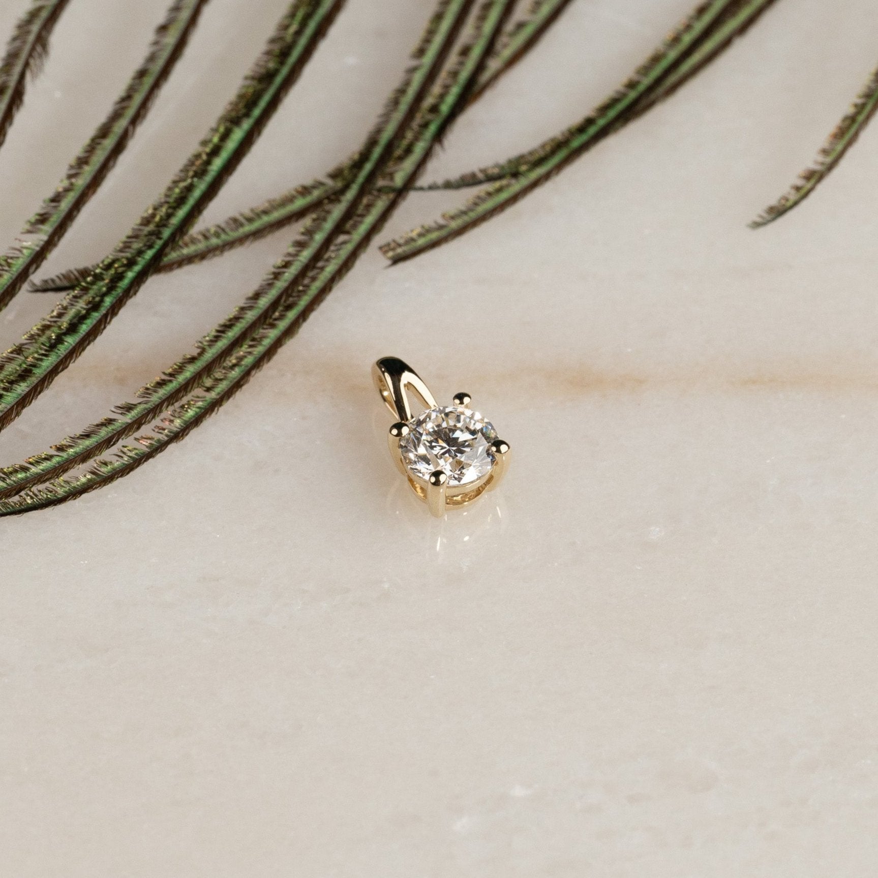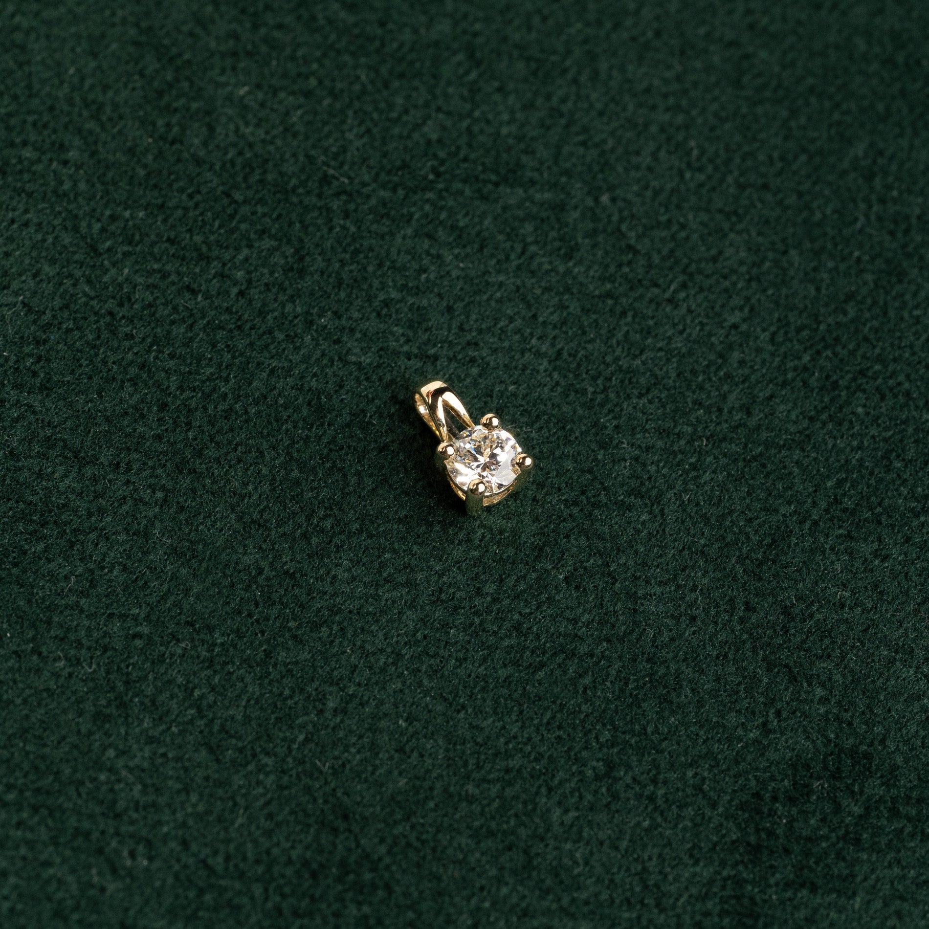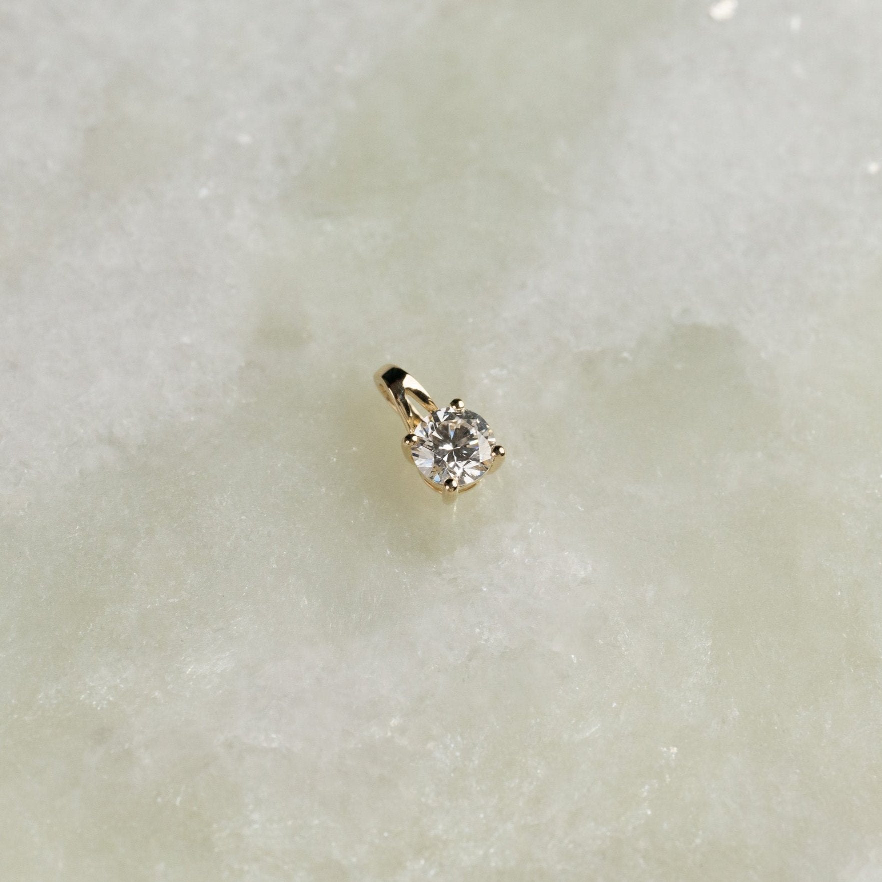 Vedhenget er laget i 14 karat massiv gull med en etisk skapt laboratorie diamant.