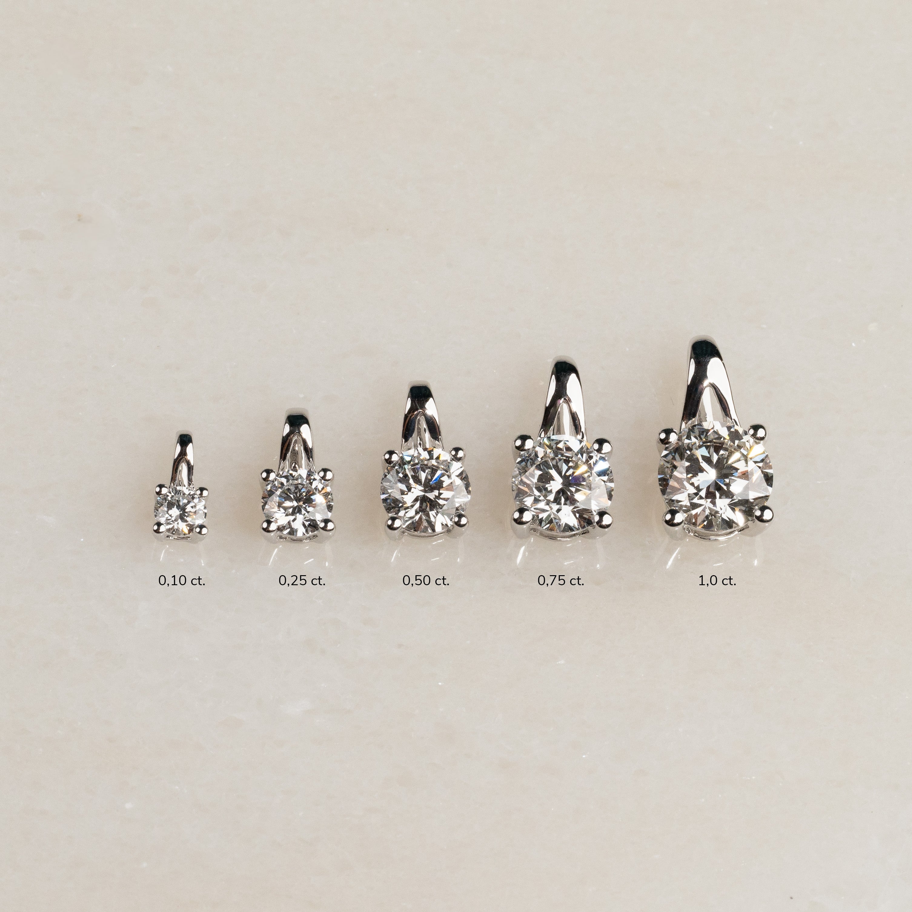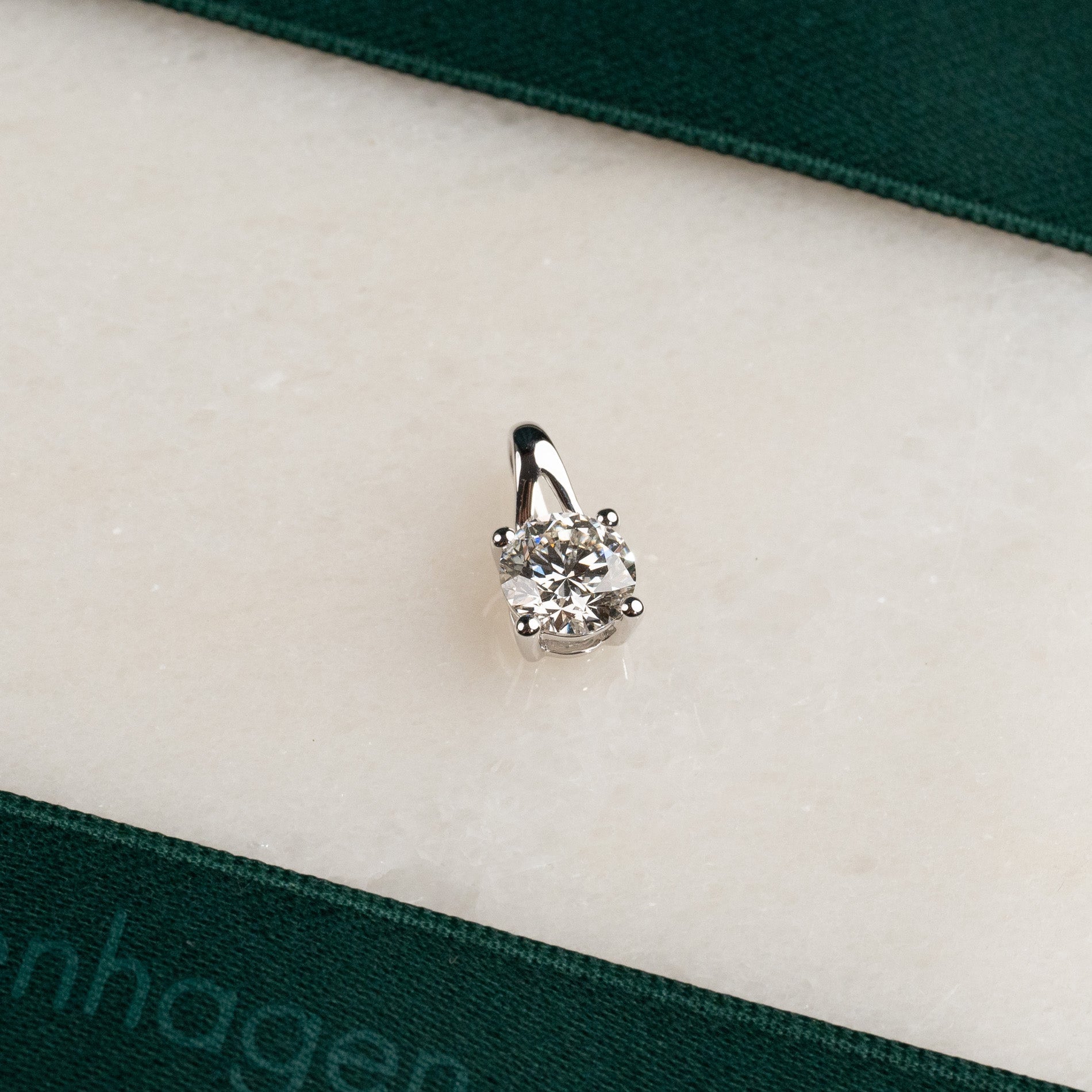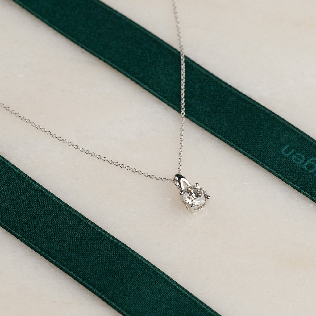 Vedhenget er laget i 14 karat massiv hvittgull med en etisk skapt lab-grown diamant som har en vekt på 1,0 ct. Diamantene har fargen E/F (River) og klarheten VVS.