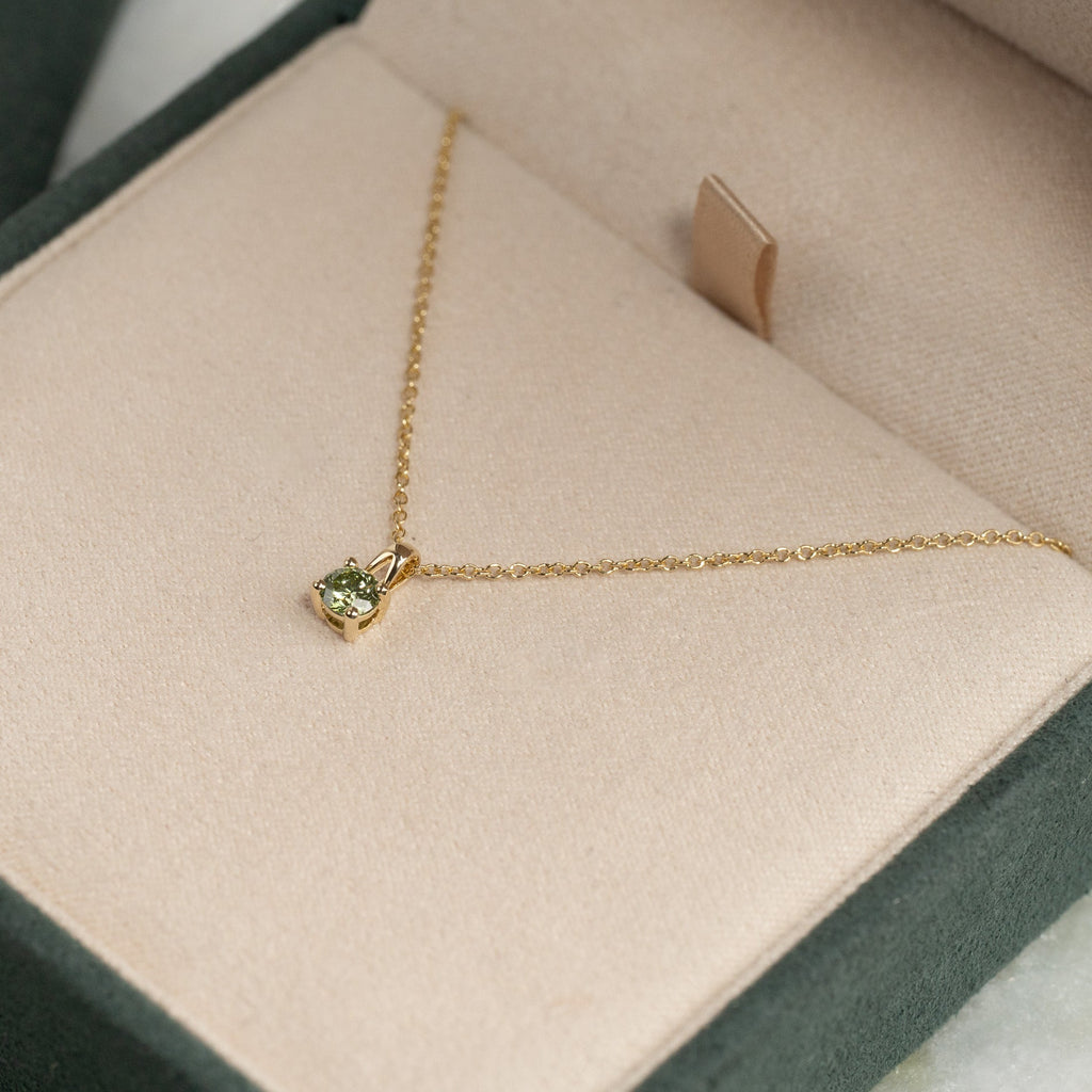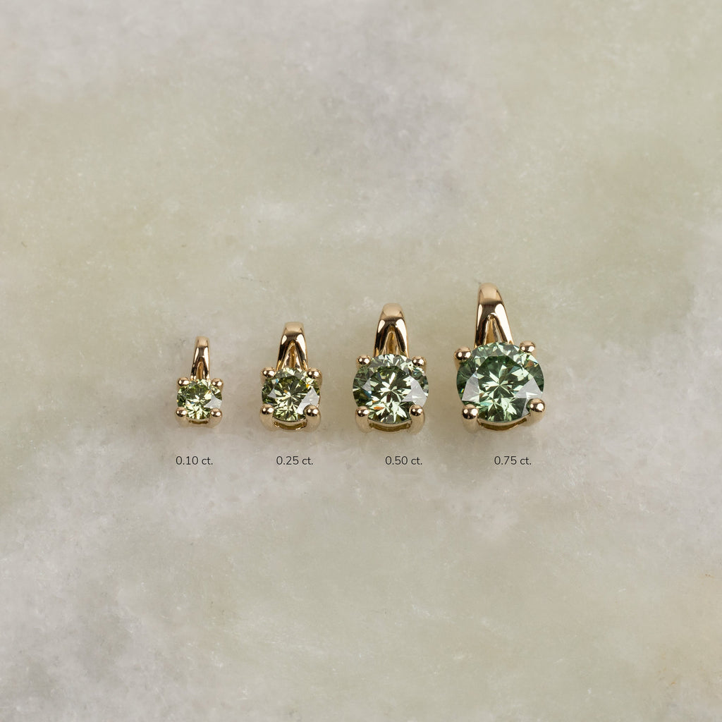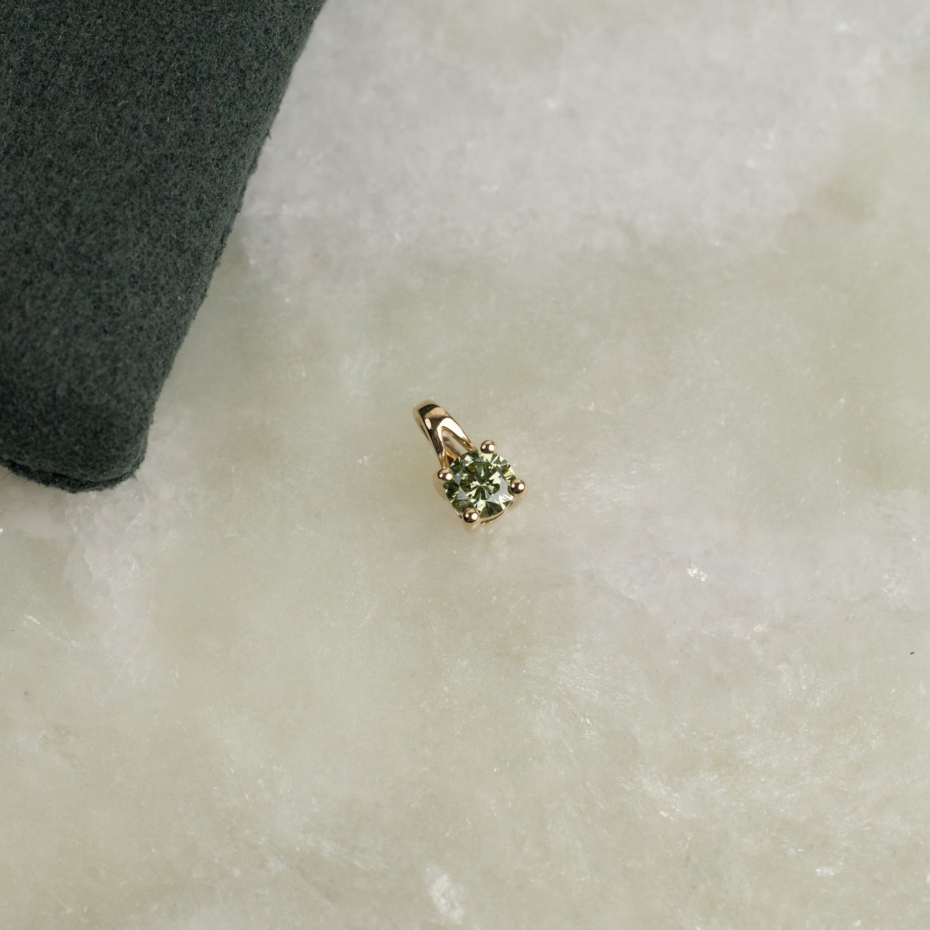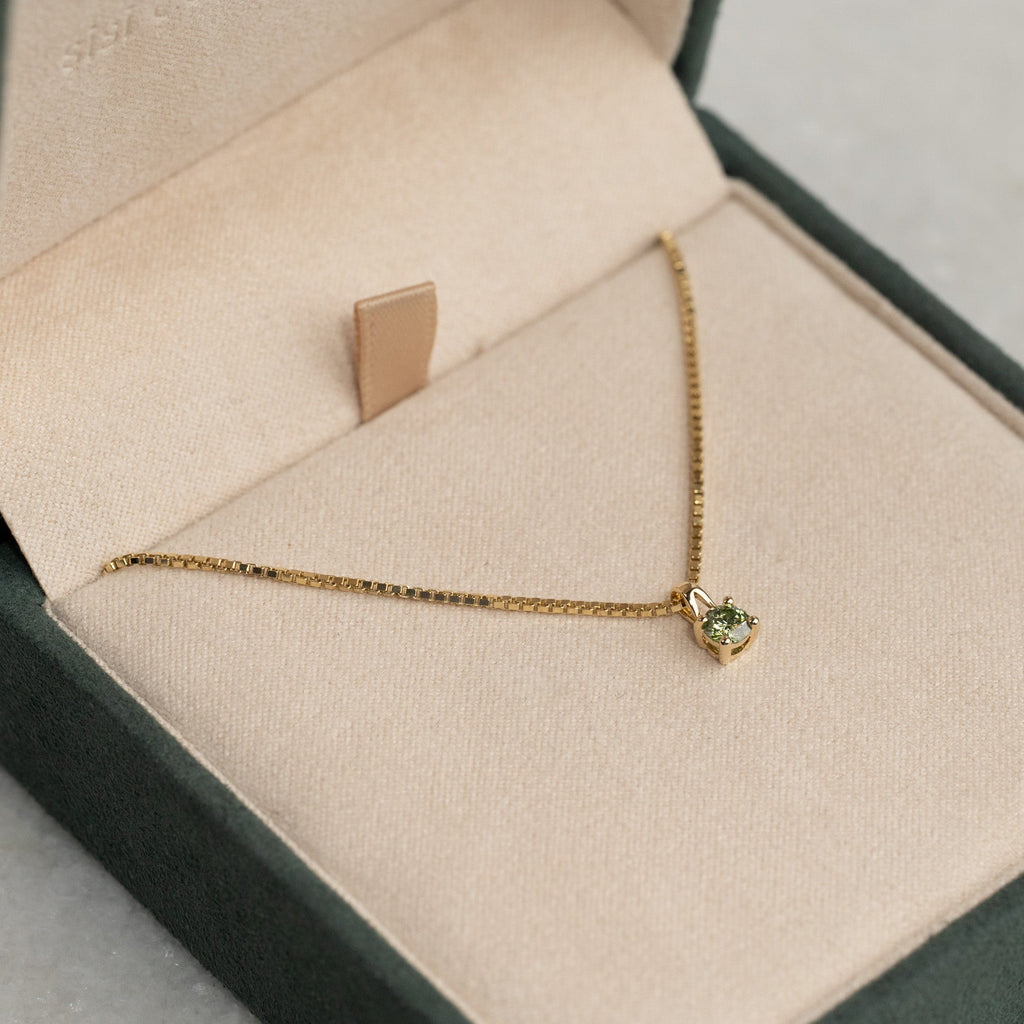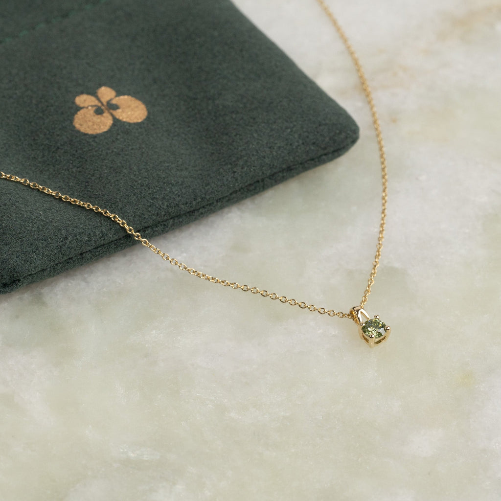 Vedhenget er laget i 14 karat massivt gull med en lab-grown diamant, som har en vekt på 0,25 ct. Diamanten er ‘fancy’ ocean green og klarheten VVS.