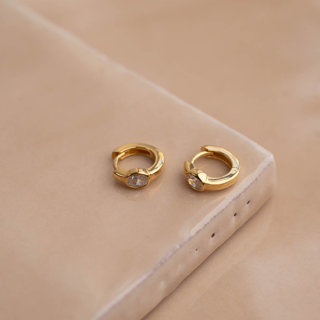 Våre elegante Rebecca Creol-øreringer er laget av 100 % resirkulert 18 karat forgylt sterlingsølv og prydet med en oval, fasettslipt klar zirkonia.