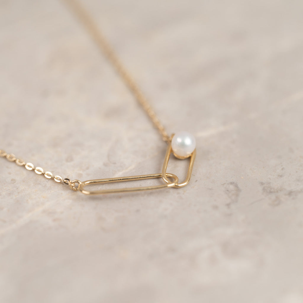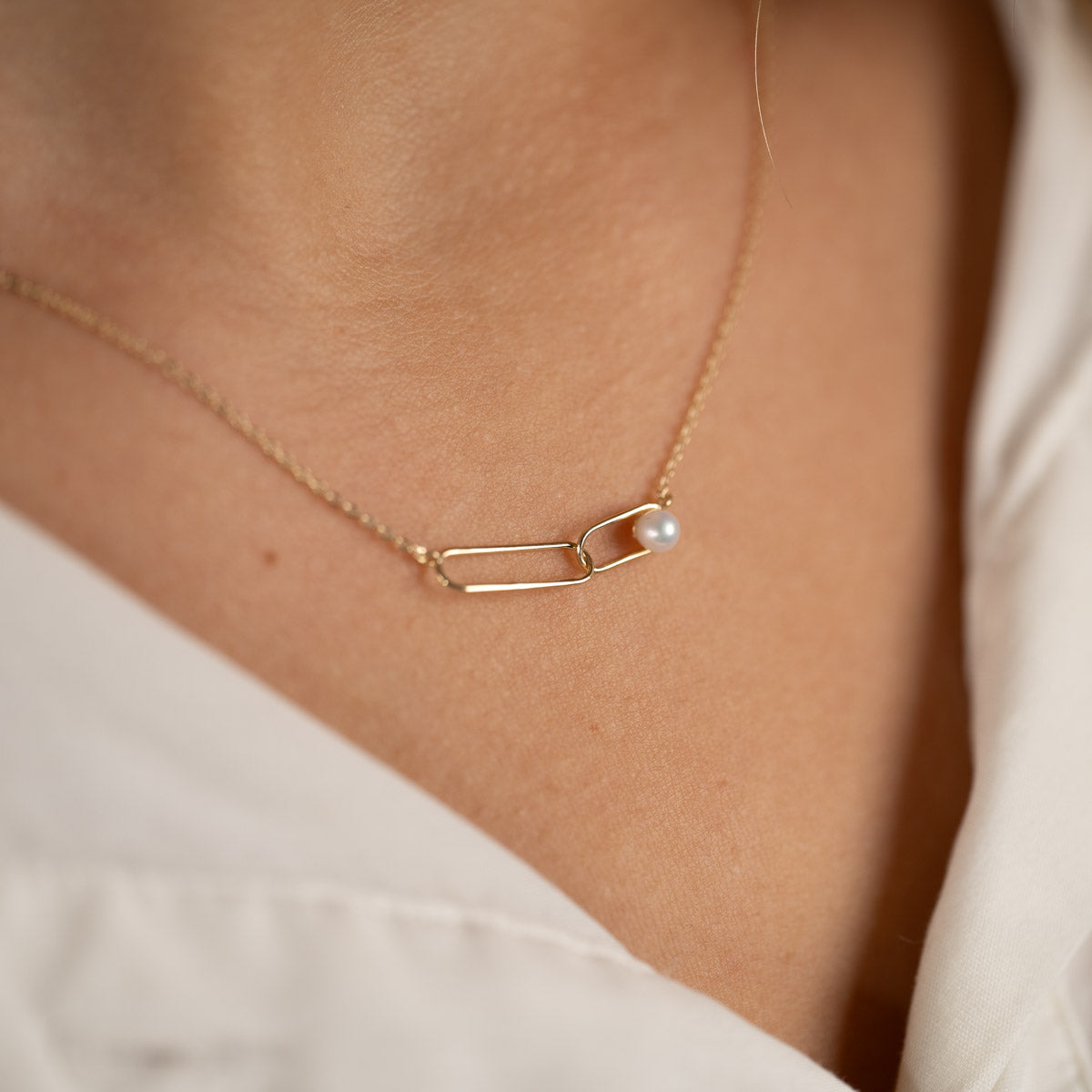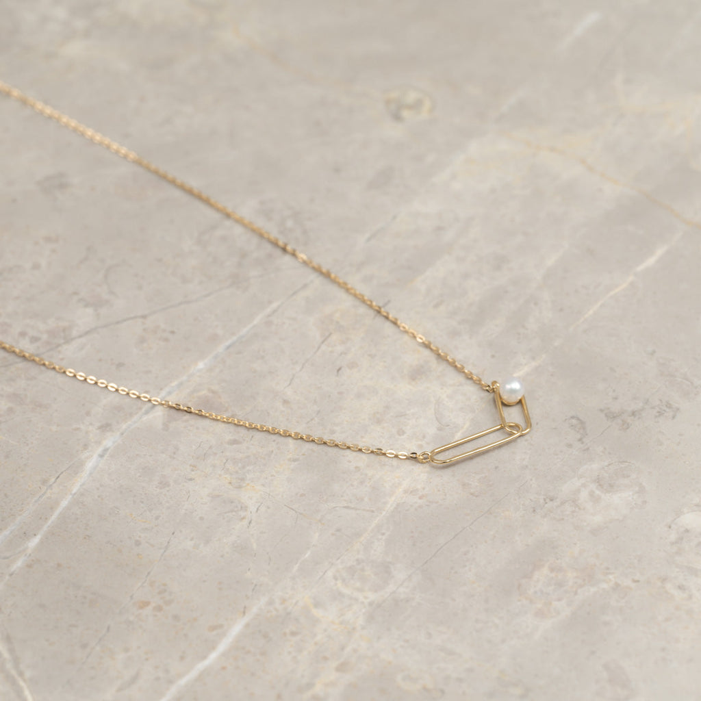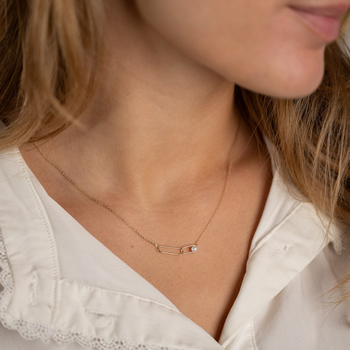 Vårt Riva halskjede er laget av 100% resirkulert 9 karat massivt gull. Selve anhenget er utformet som to ovale ringer, med en liten, rund ferskvannsperle som sitter i bunden av den ene ringen.