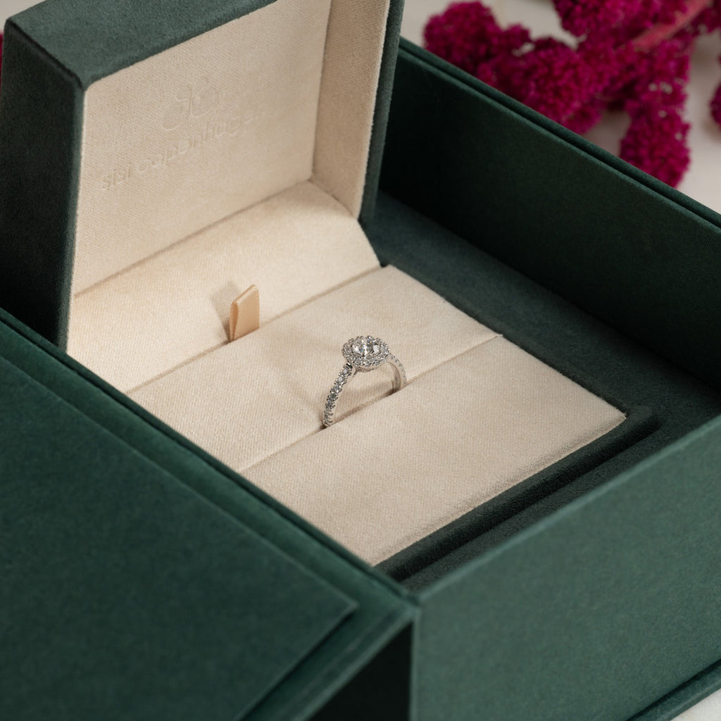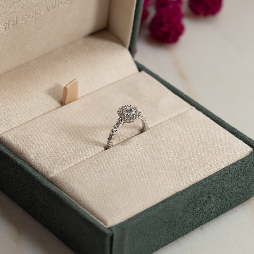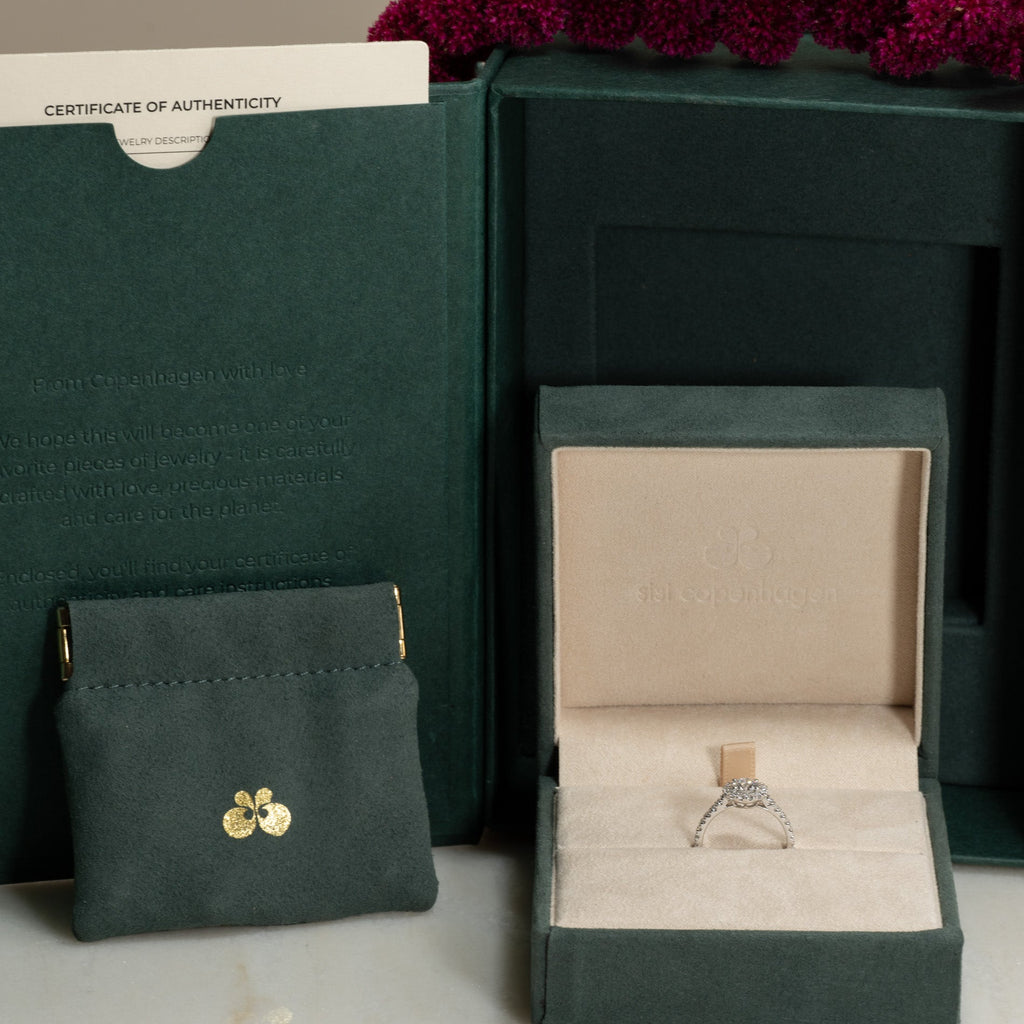 Ringen kommer i vår eksklusive Diamond Collection-boks. Boksen inneholder en smykkeeske, et diamant-sertifikat og en pouch.