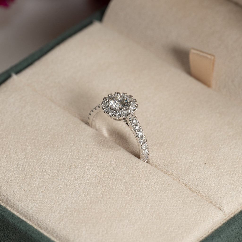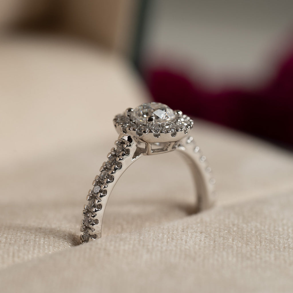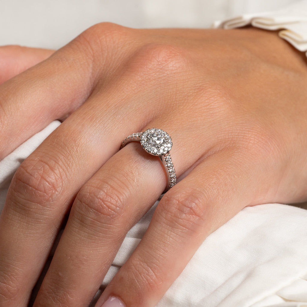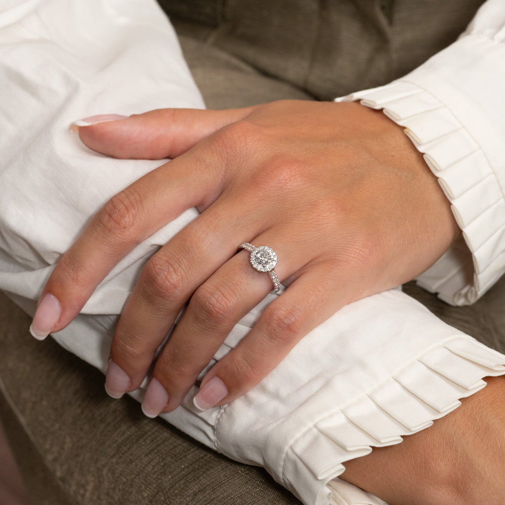 Nydelig rosettring med 14 karat hvitt gull med 0,85 ct. lab-dyrkede diamanter. Senterstenen har 0,5 kt. diamanter, omgitt av en 0,15 ct. halo/rosett. Ringen har også sidestener på ringskinnen på 0,2 ct.