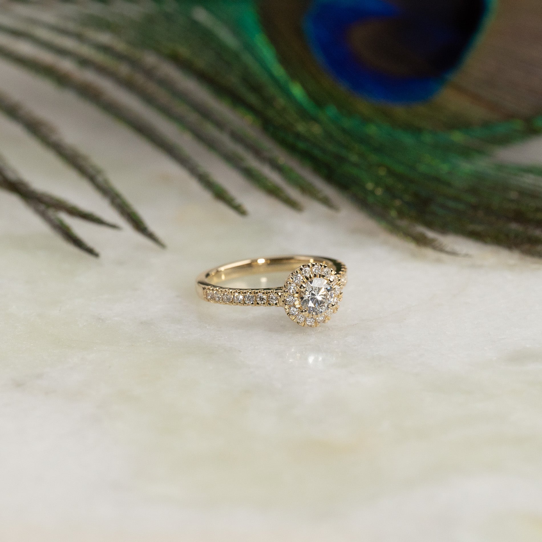 Nydelig rosettring med 14 karat gull med 0,85 ct. lab-dyrkede diamanter. Midtstenen har 0,5 ct. diamanter, omgitt av 0,15 ct. i halo/rosett. Ringen har også sidestener i ringskinnen på 0,2 ct.