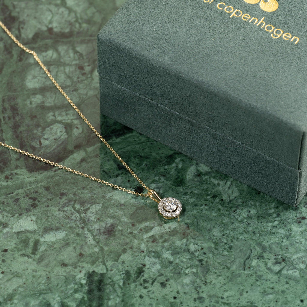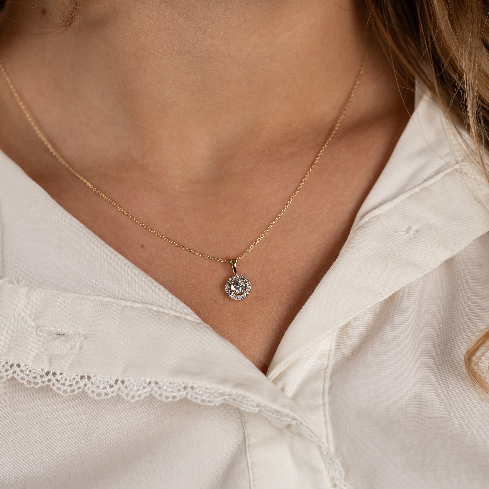 Vårt diamant anheng er laget i 14 karat massivt gull med en brilliantslipt diamant på 0,34ct. med en halo av 16 små 0,01ct. diamanter. Den totale diamantvekten er 0,5 karat. Anhenget måler 14mm i diameter og har en gullvekt på 1,0g.