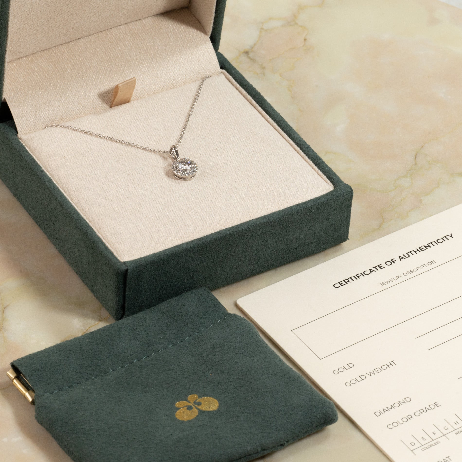Den matchende posen kan du bruke til å oppbevare diamantsmykket sikkert når du er på farten.