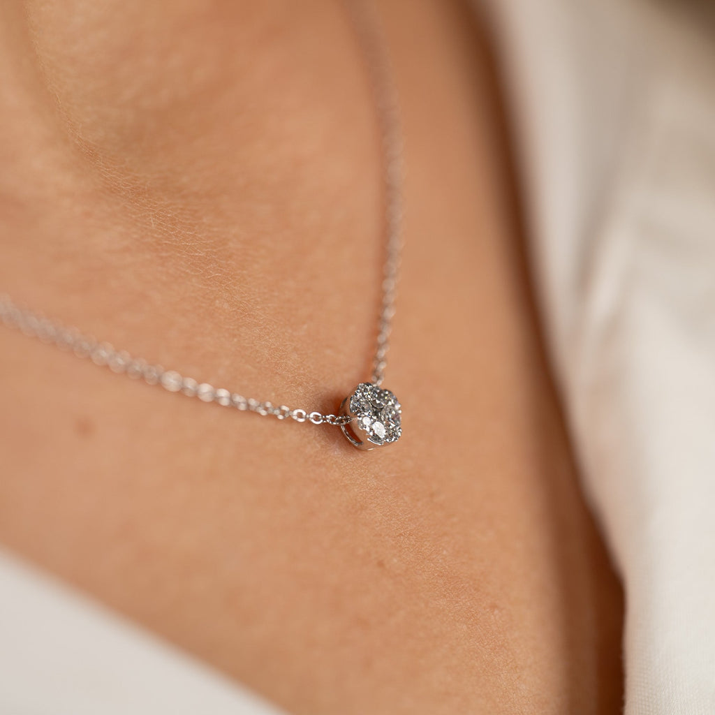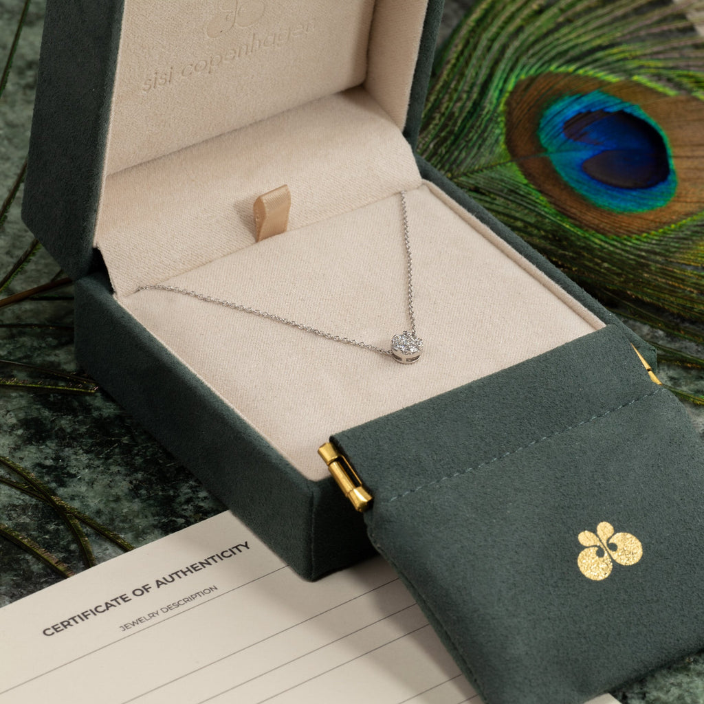 For å fullende smykket anbefaler vi at du bruker et kjede i 14 karat hvitt gull sammen med anhenget. Du kan tilvelge dette. Alternativt kan du kjøpe anhenget med et sølvkjede - da er anhenget fint presentert i esken om det skal gis i gave. Du kan også velge å kjøpe det helt uten kjede. Diamantene produseres bærekraftig med grønn energi – først og fremst fra solen.
