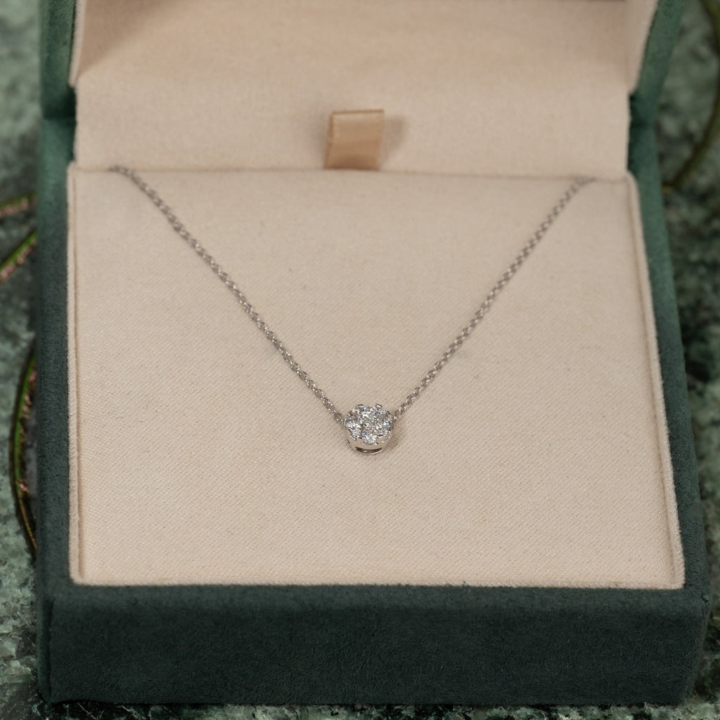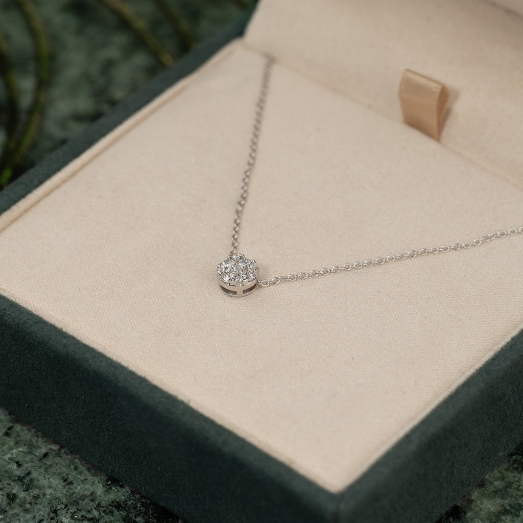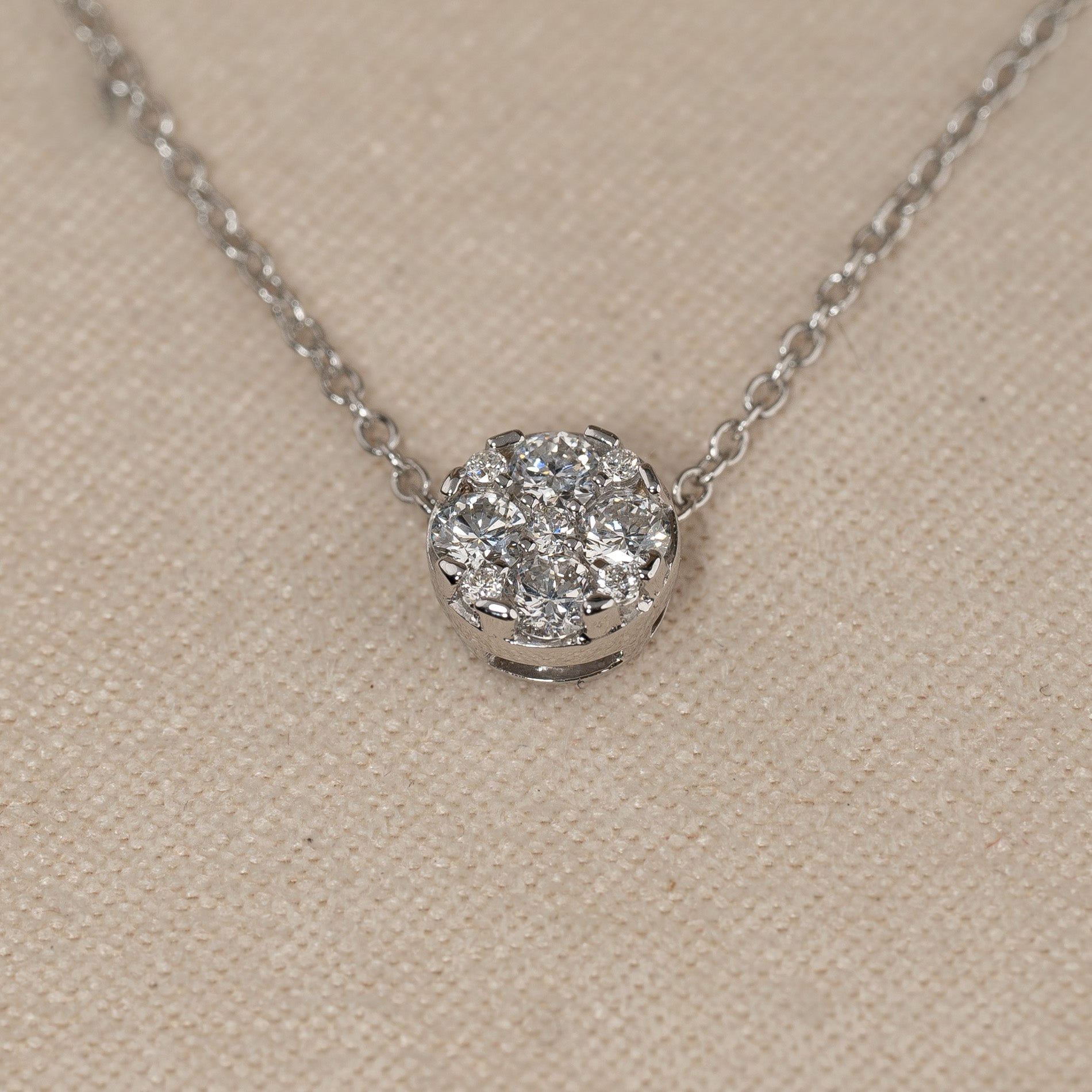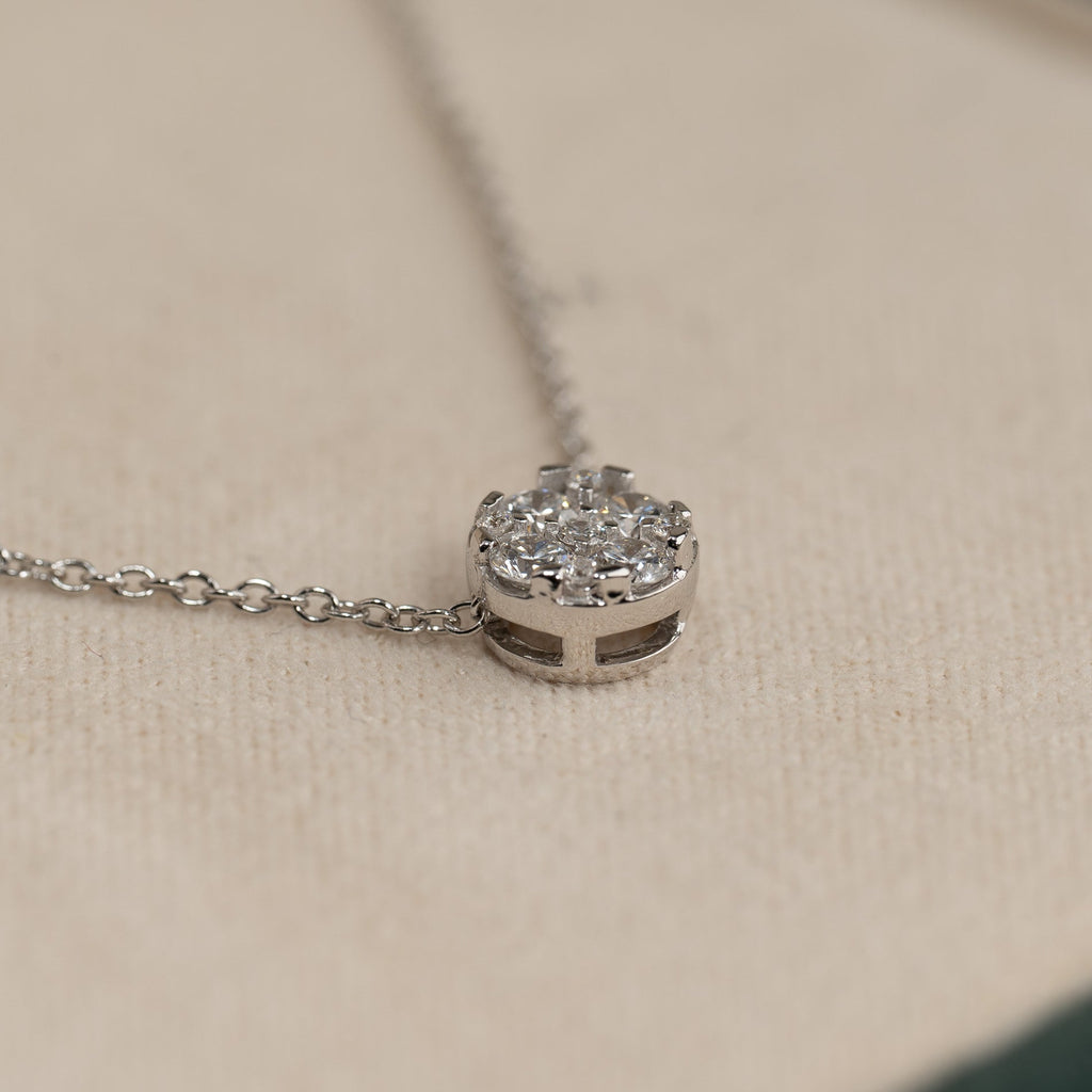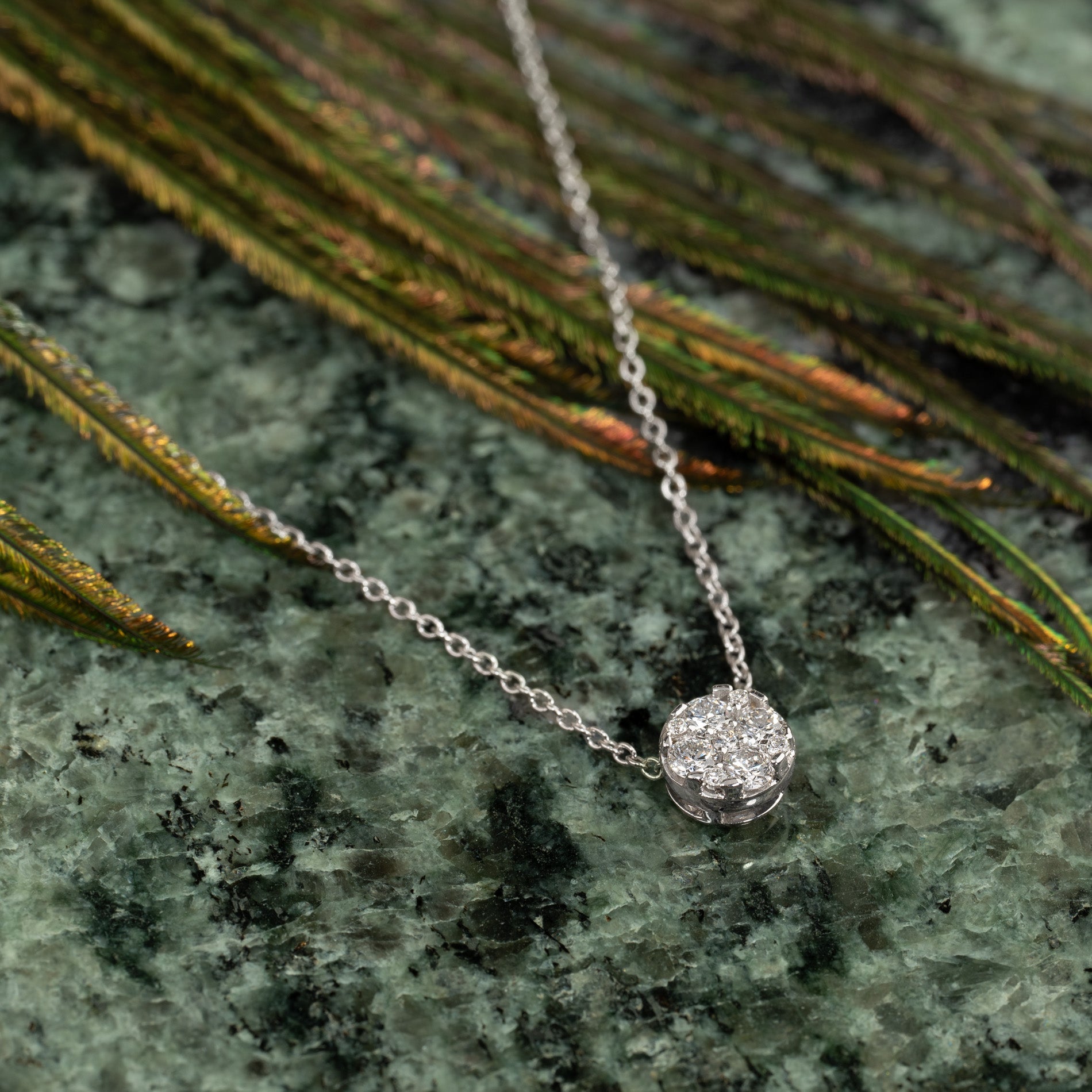 Diamantanheng i 14 karat hvitt gull med 9 briljantslipte lab-dyrkede diamanter med en totalvekt på 0,20 ct. De 9 briljantene holdes tett sammen i en rund pavé som fremstår som en samlet enhet. Anhenget trekkes direkte på kjedet, noe som skaper et minimalistisk og enkelt uttrykk - perfekt for enhver anledning.