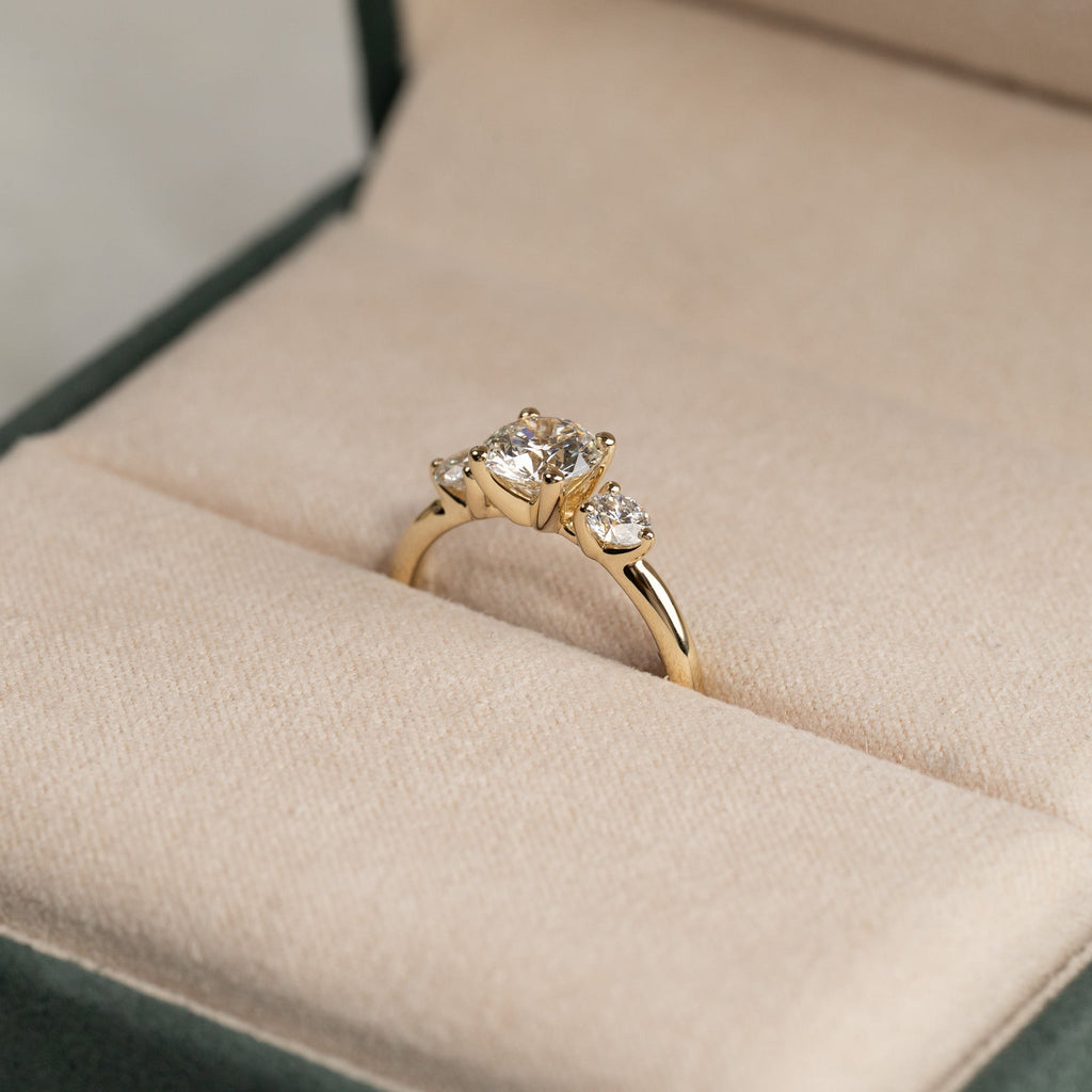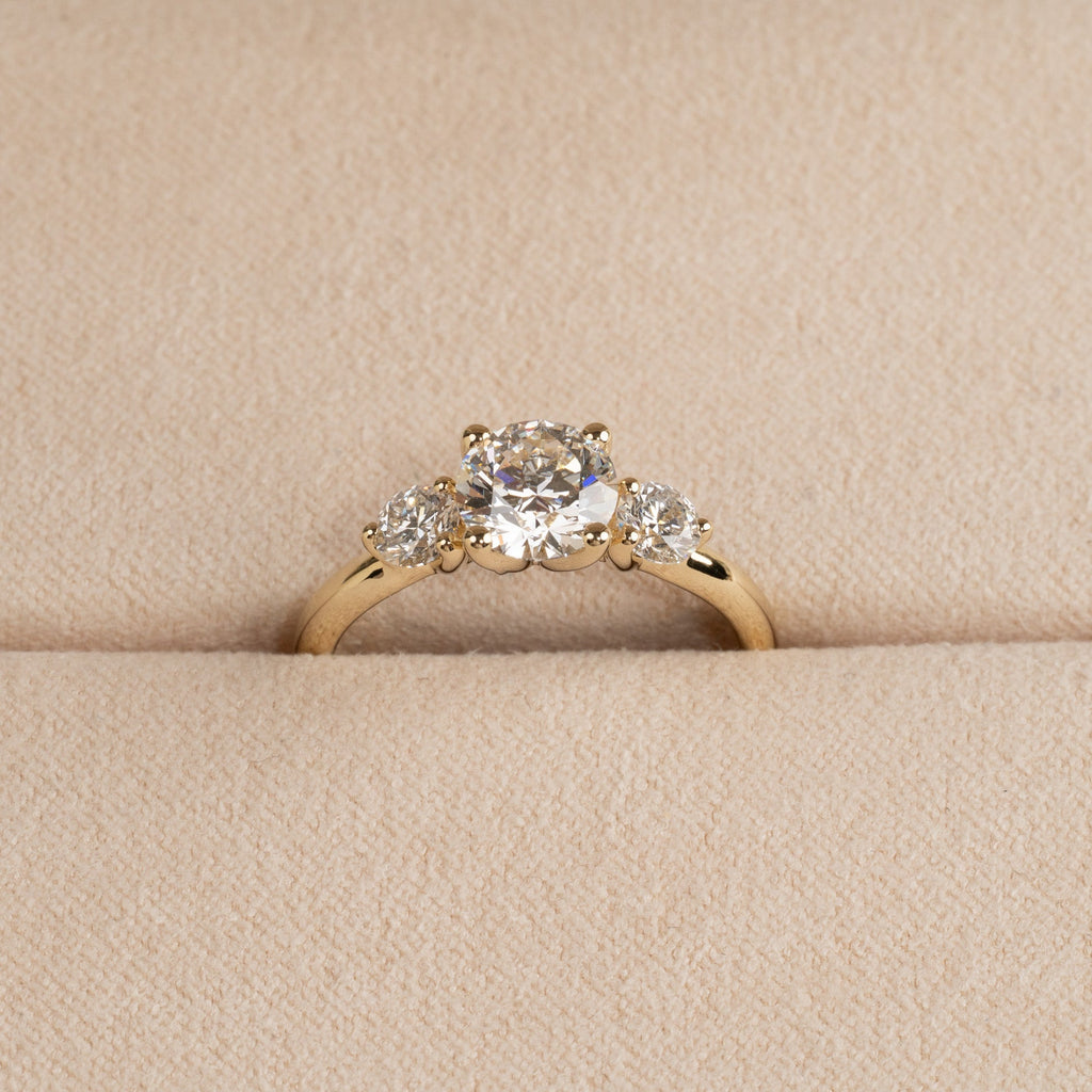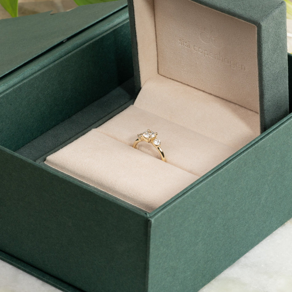 Ringen er i 14 karat massivt gull med tre lab-grown diamanter på samlet 1,4 ct. Diamanterne har farven E/F (River) og klarheden VVS. Smykket er skapt med omtanke; diamanterne er fremstillet med blant annet solenergi, og guldet er 100% sertifisert resirkulert.