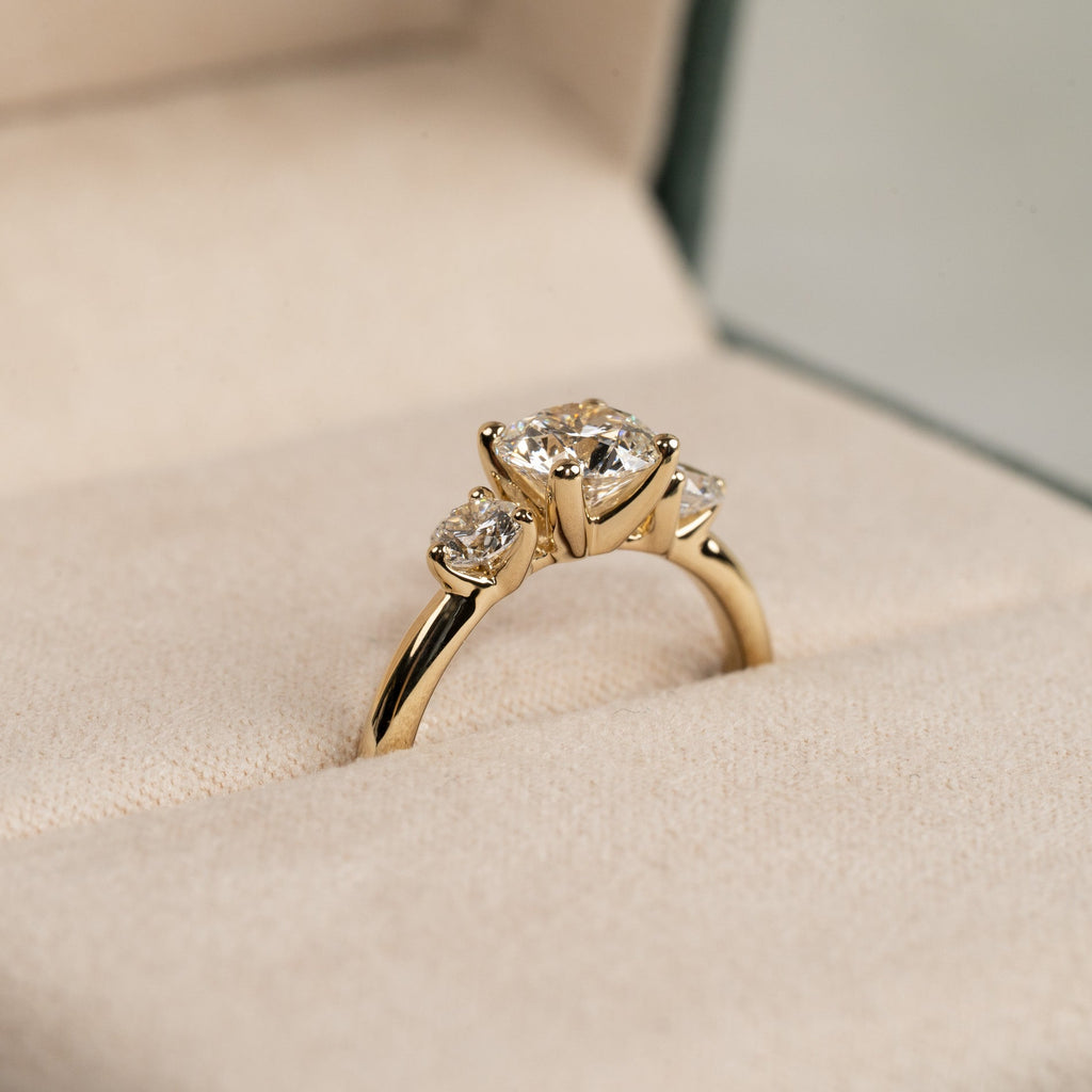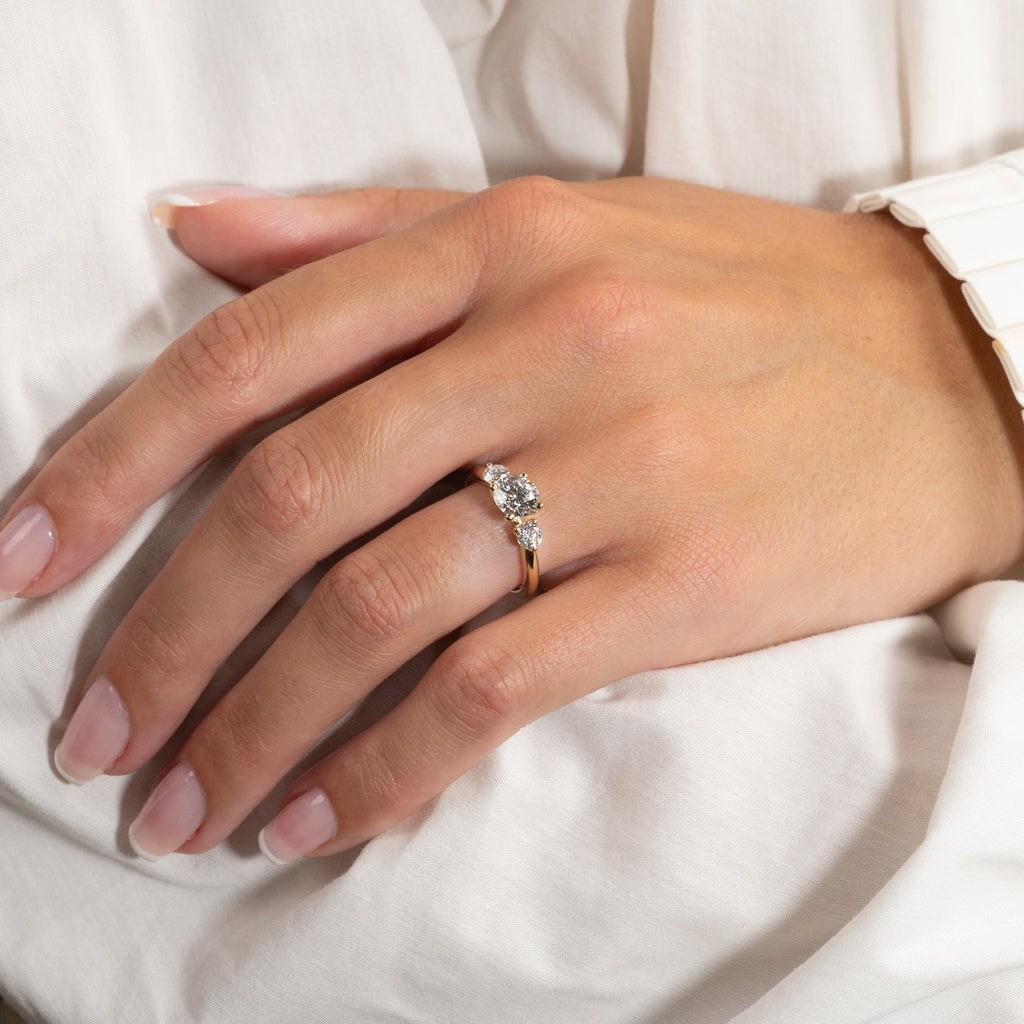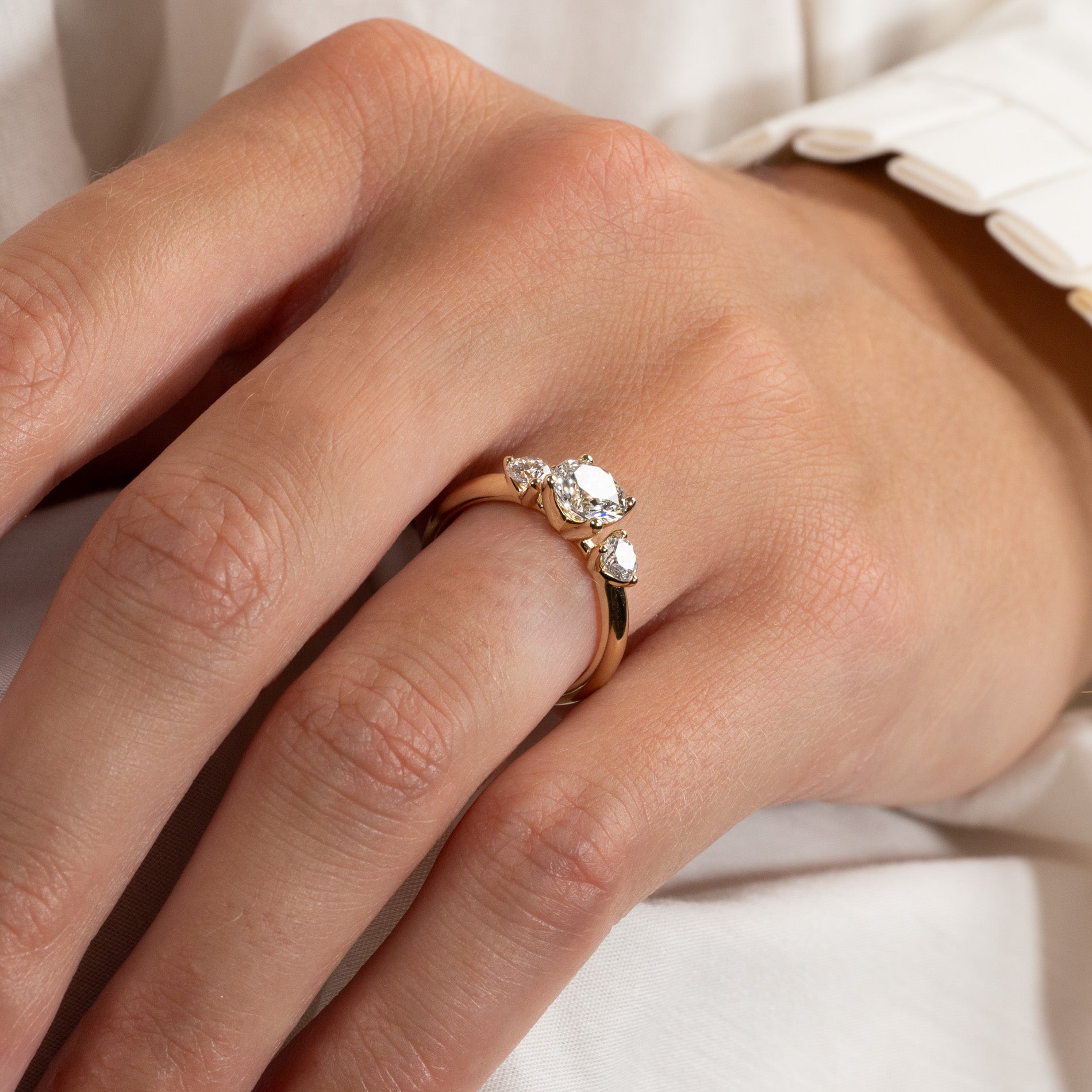 Ringen er i 14 karat massivt gull med tre lab-grown diamanter på samlet 1,4 ct. Diamanterne har farven E/F (River) og klarheden VVS. Smykket er skapt med omtanke; diamanterne er fremstillet med blant annet solenergi, og guldet er 100% sertifisert resirkulert.