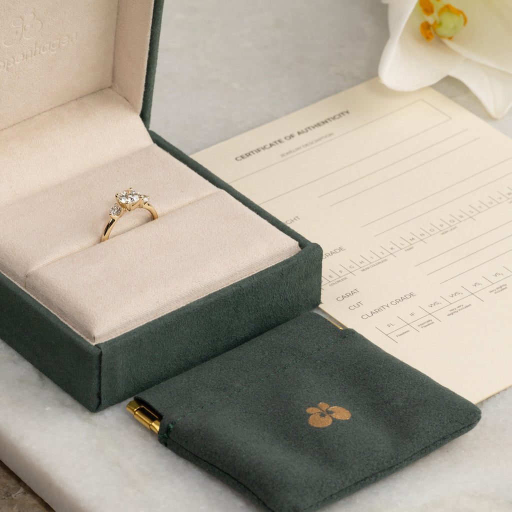 Ringen kommer i vores eksklusive Diamond Collection boks med en flot smykkeeske, sertifikat og pouch. Esken er også perfekt, hvis smykket skal gis som gave.