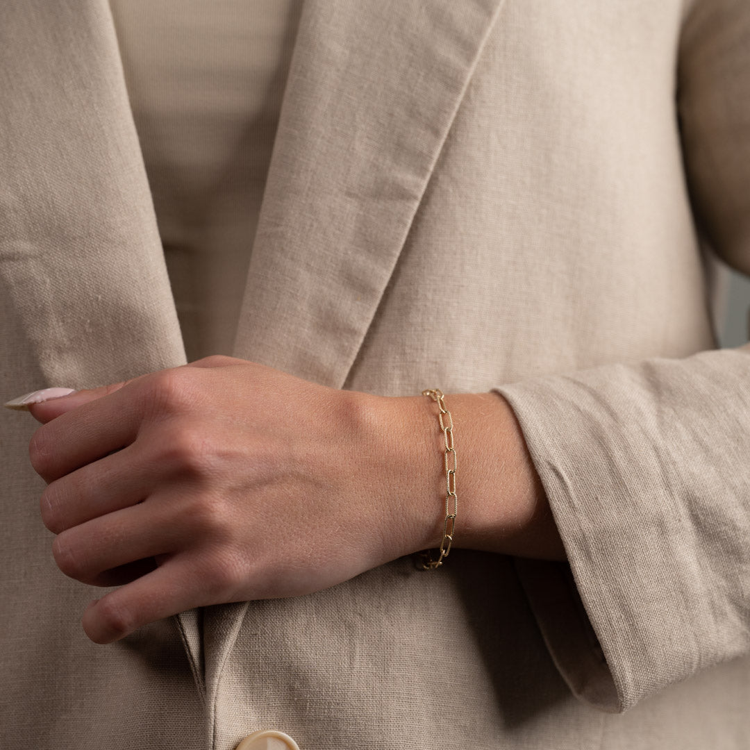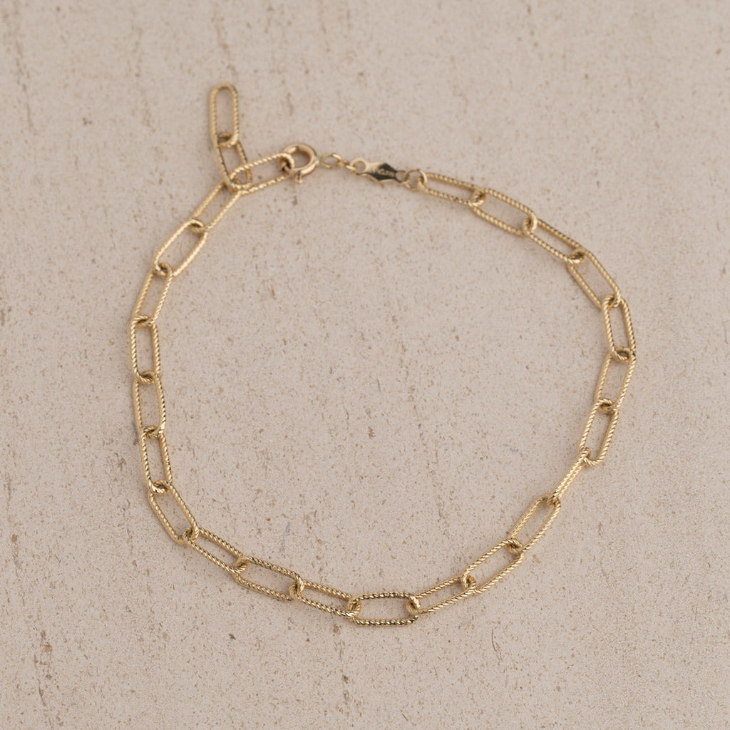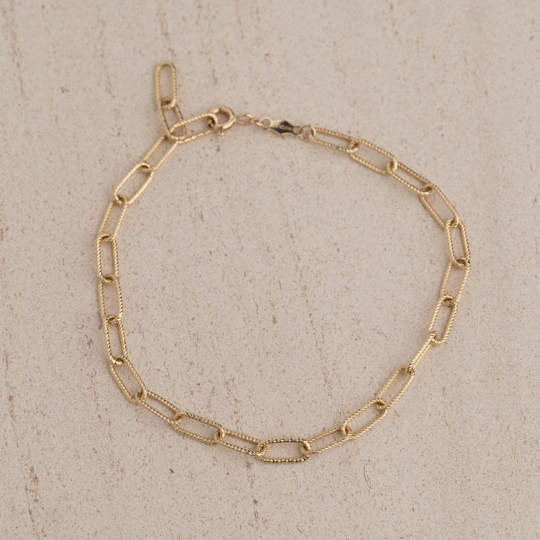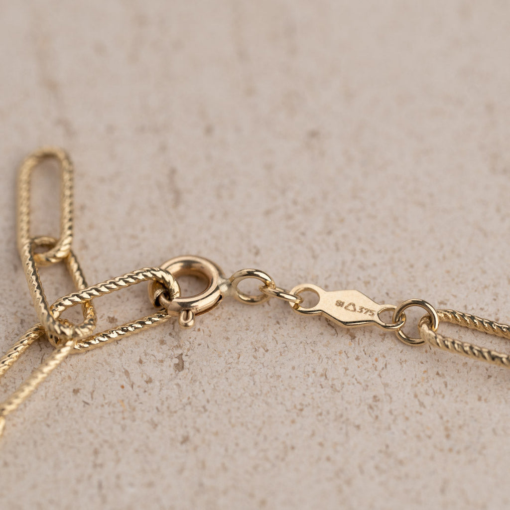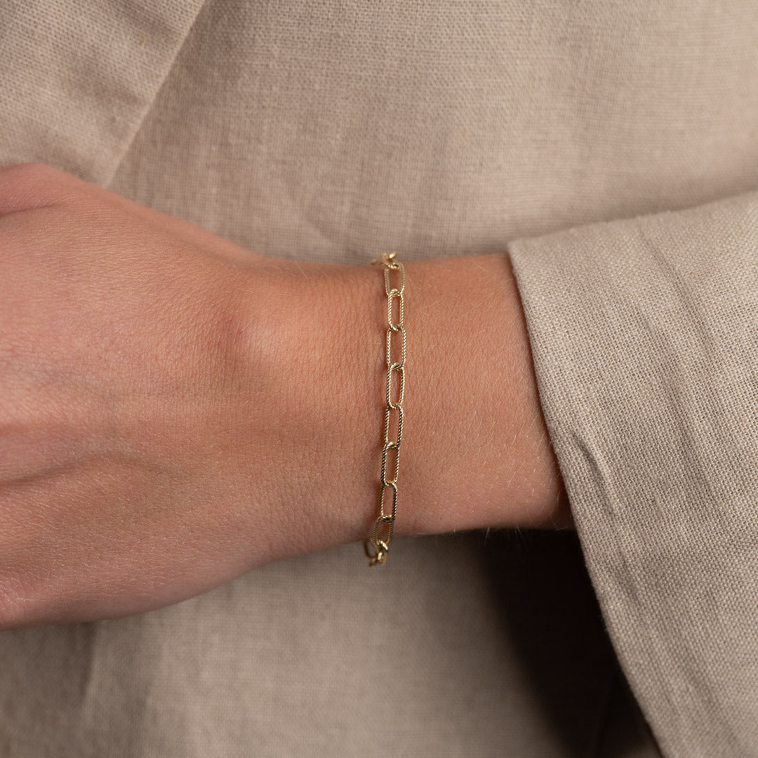 Vårt Roxanne gullarmbånd er laget av 100% resirkulert 9 karat massivt gull. Det vakre armbåndet er designet med halvstore kjedeledd med en rillet struktur.
