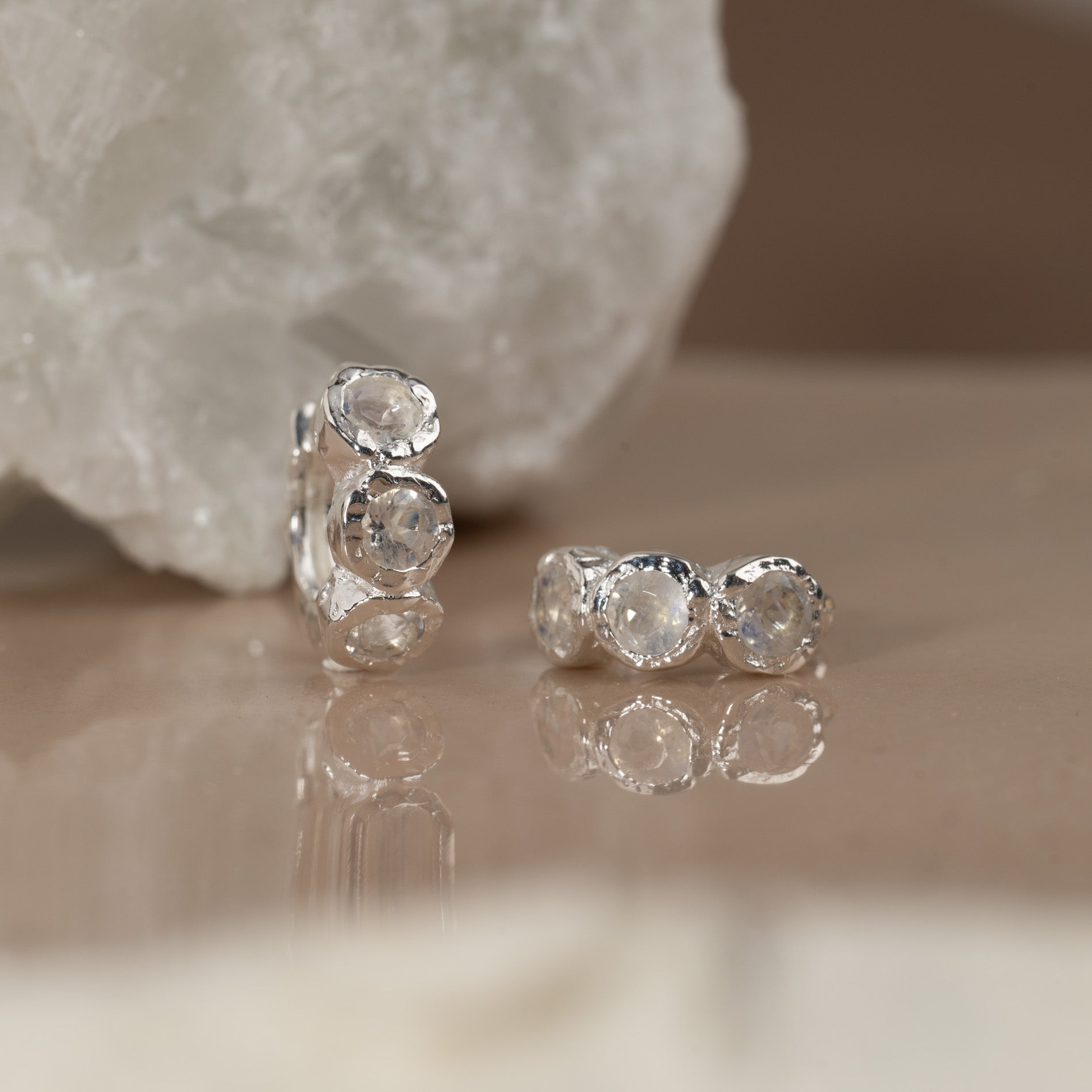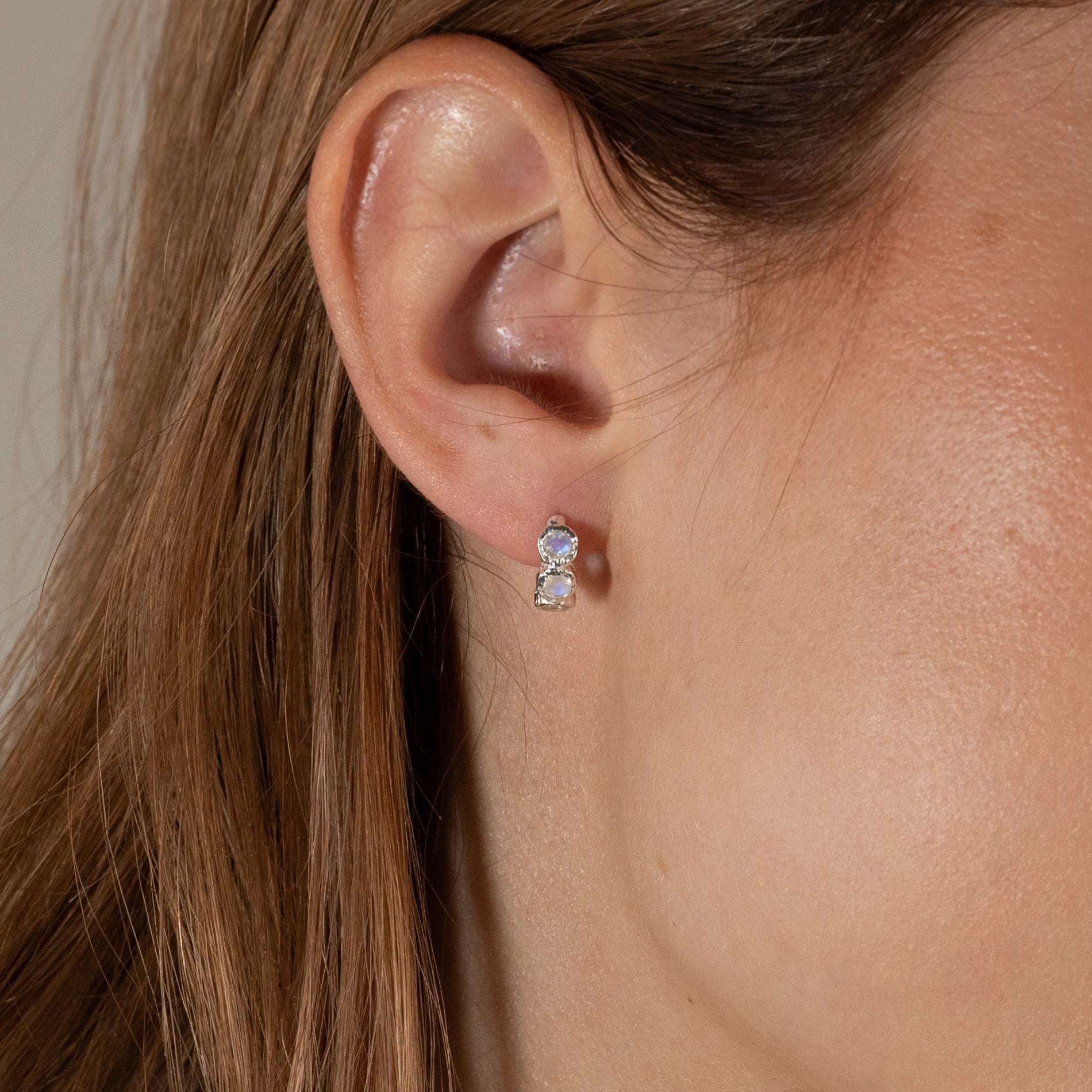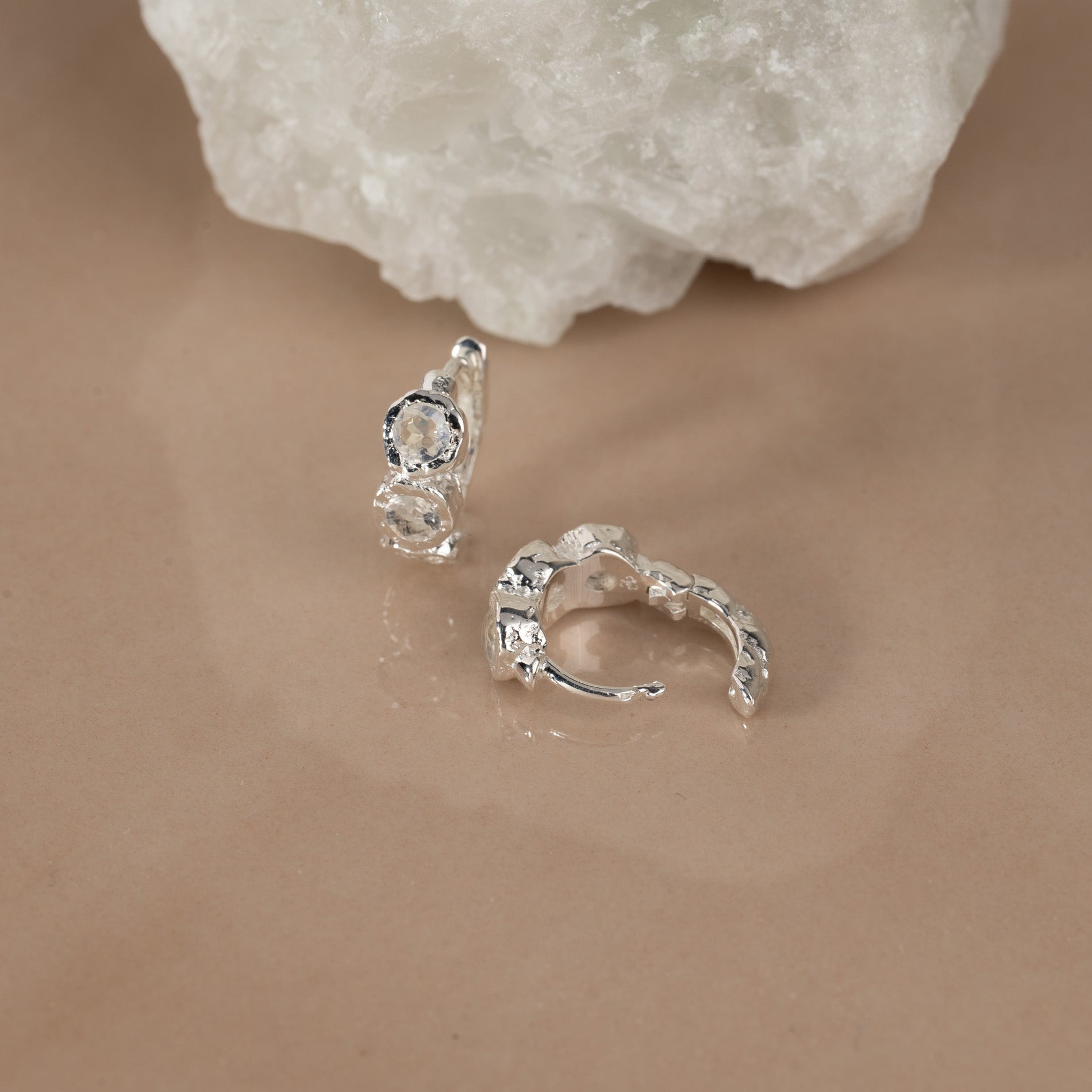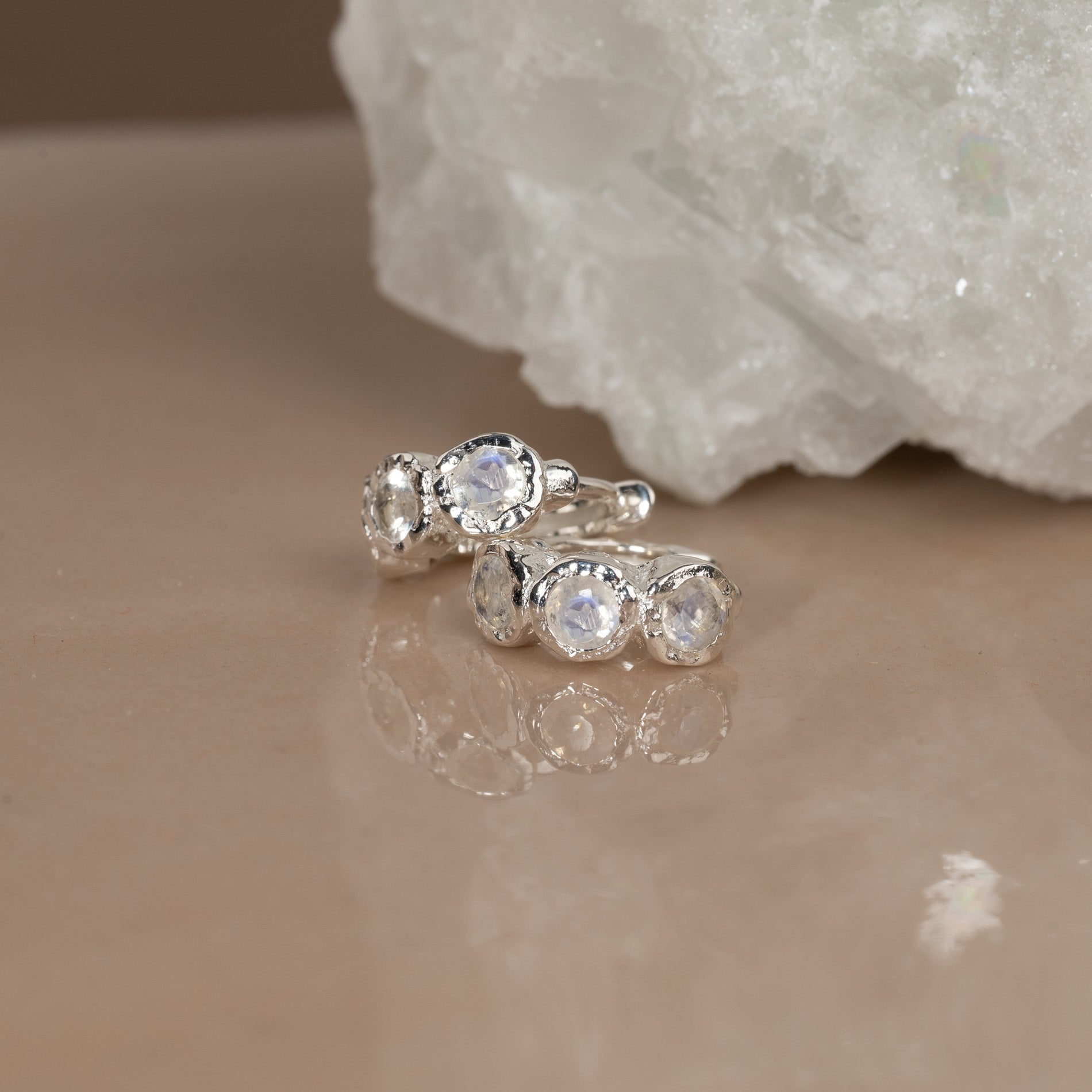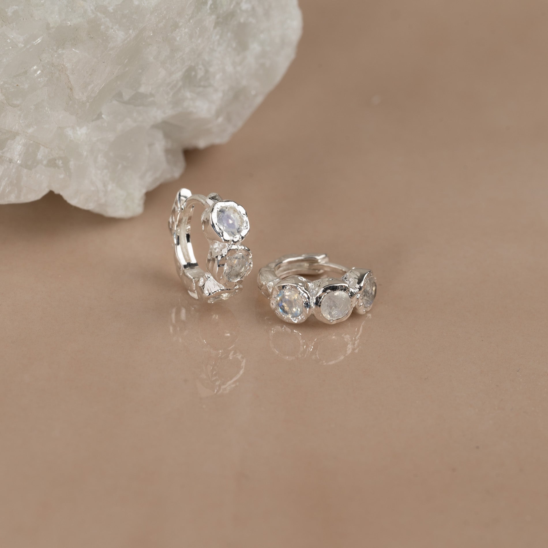 Huggies i 100% resirkulert 925 sterlingsølv med tre runde månesten hver. Øredobbene har en støpt overflate - inspirert av smeltet metall.