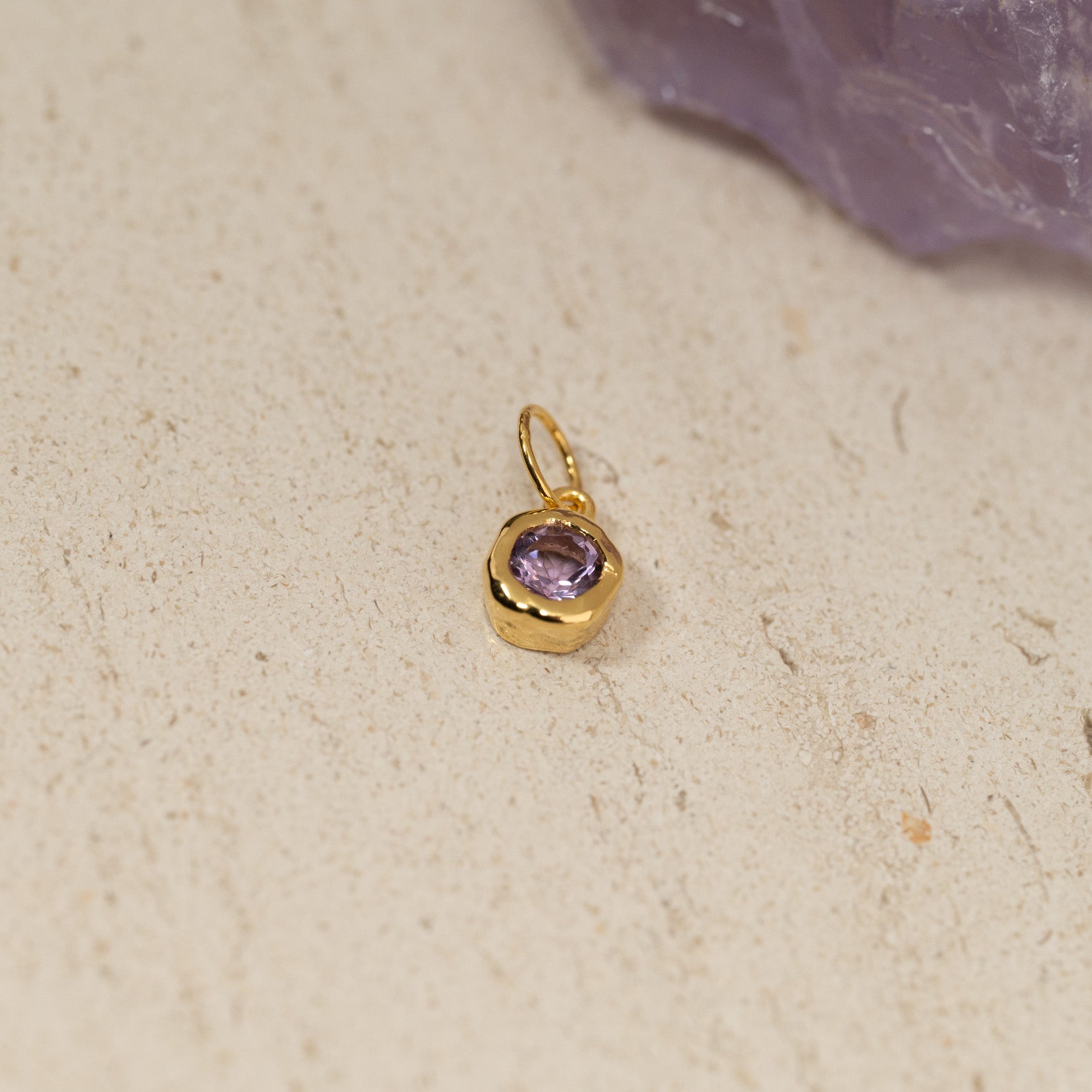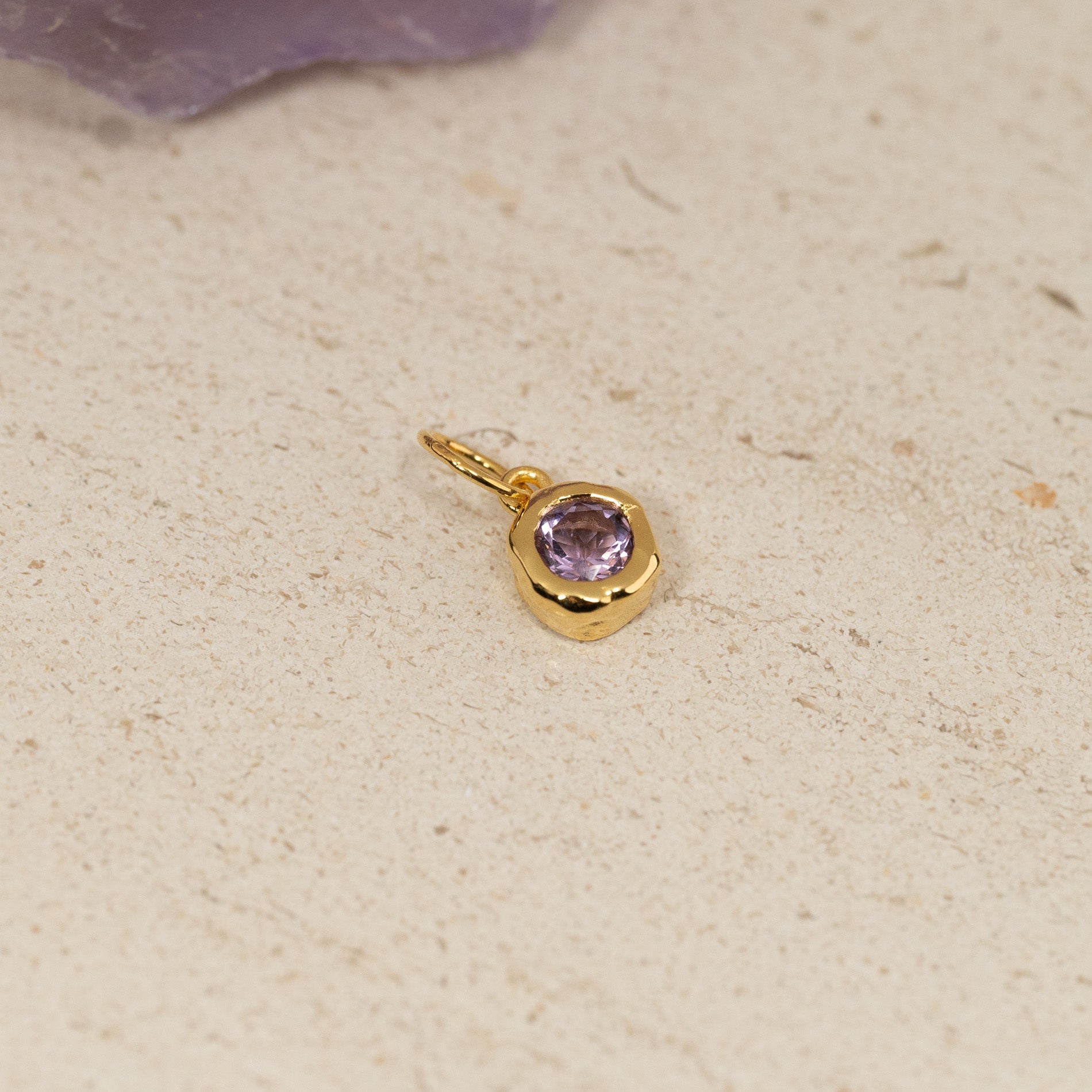 Rått forgylt anheng med en rund fasettslipt lilla ametyst