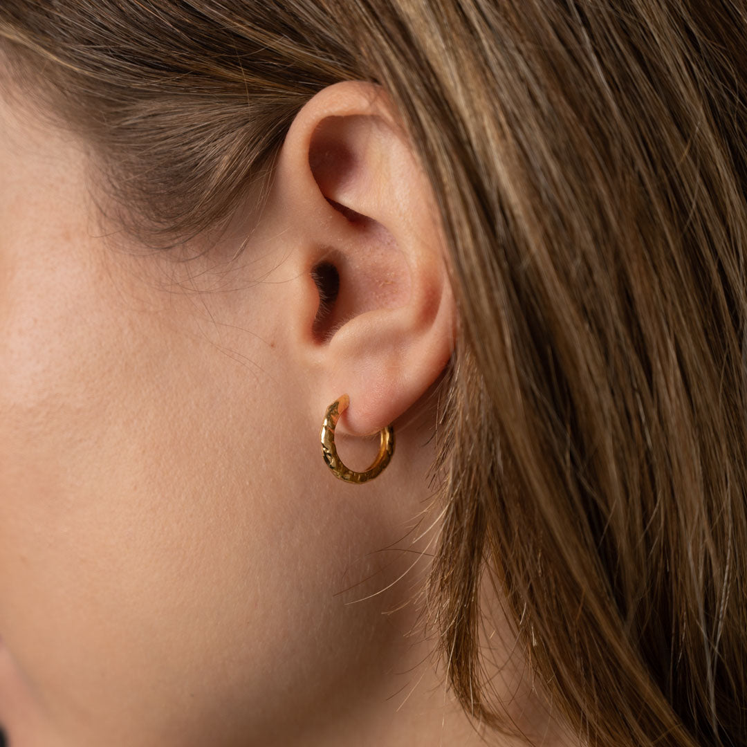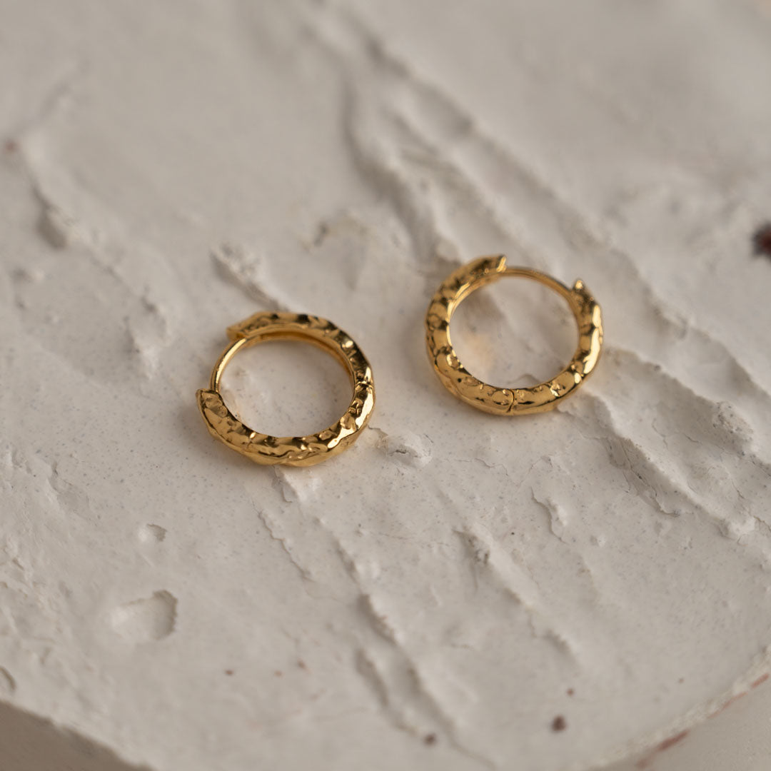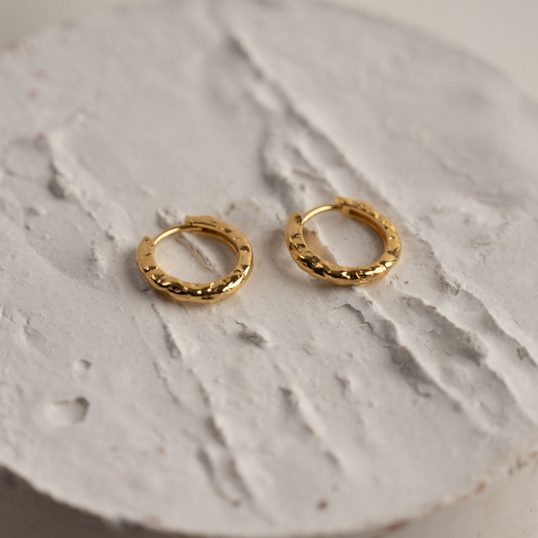 Våre Selina Huggies er laget i 100% resirkulert 18 karat forgylt sterlingsølv. De fine, små huggies lukkes med klemme-lås. Den støpte overflaten på øreringene er inspirert av flytende metall, og gitt en struktur som er mer levende og litt mer rå.