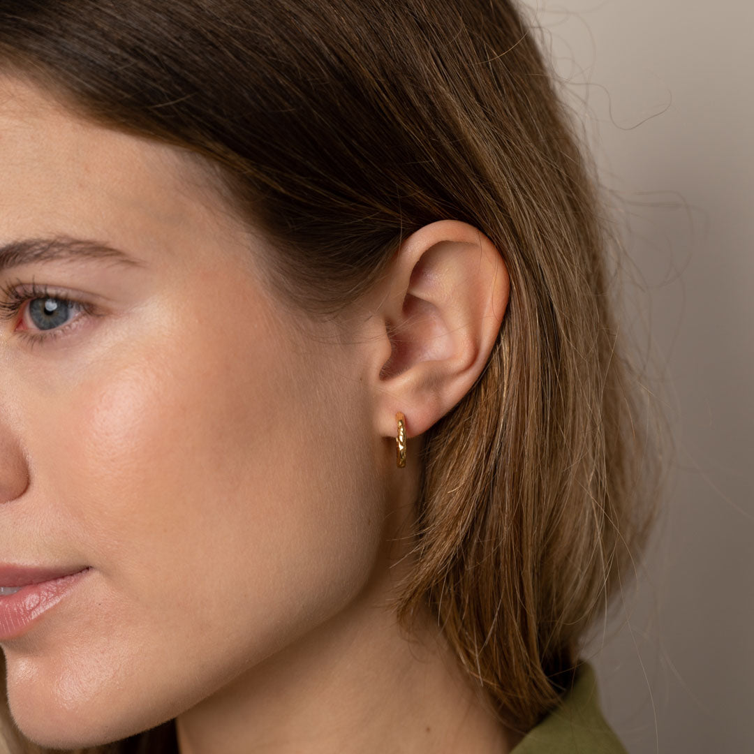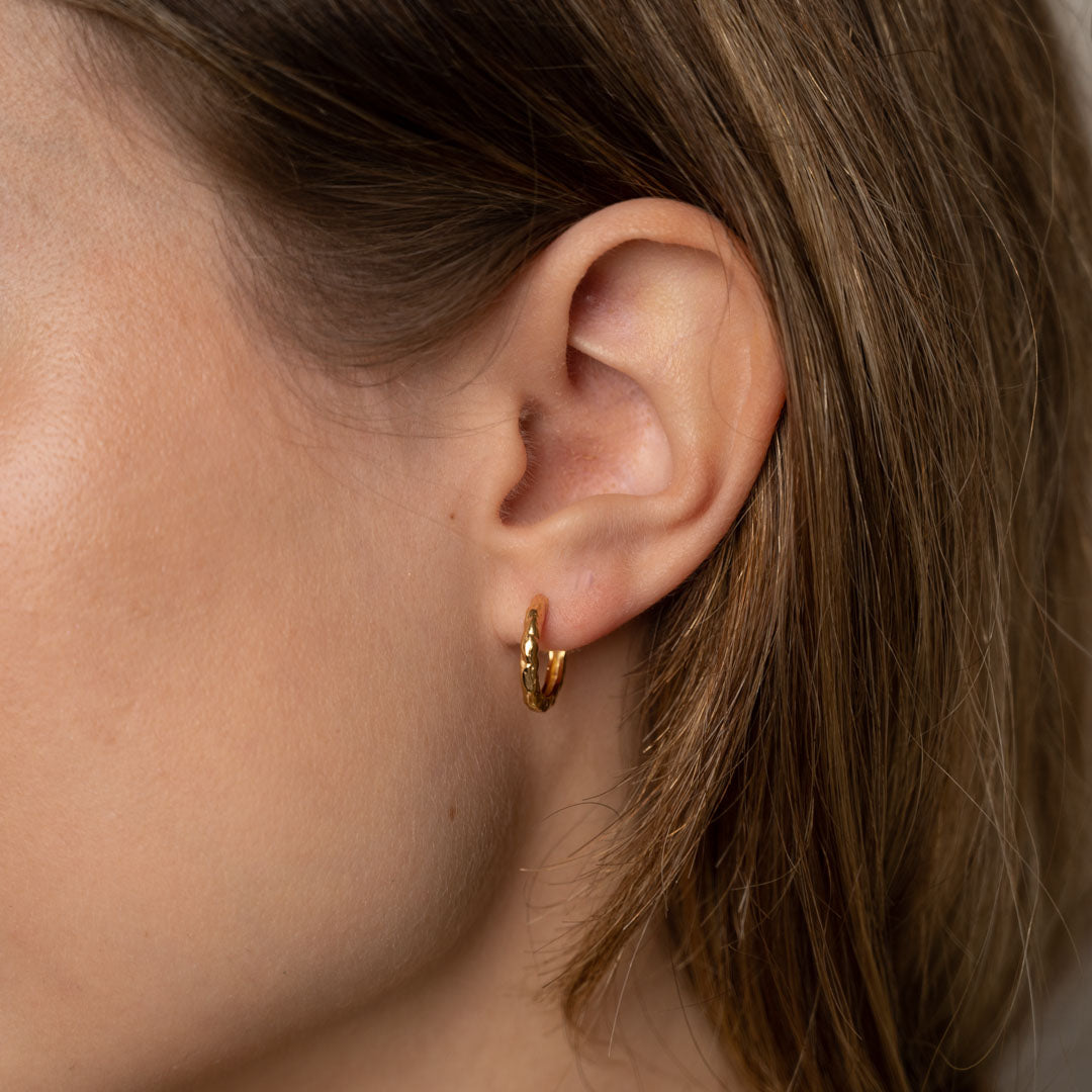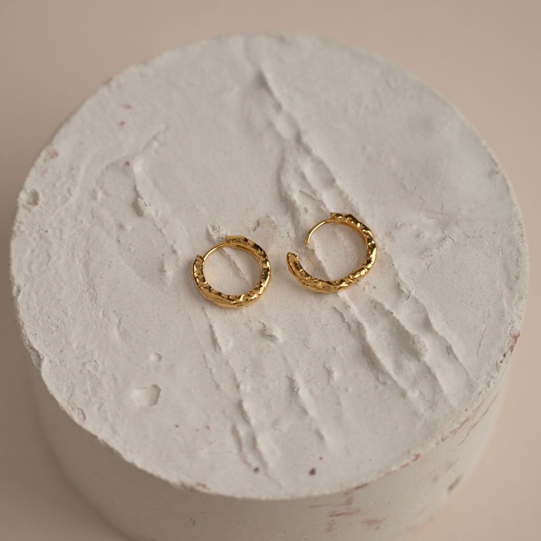 Våre Selina Huggies er laget i 100% resirkulert 18 karat forgylt sterlingsølv. De fine, små huggies lukkes med klemme-lås. Den støpte overflaten på øreringene er inspirert av flytende metall, og gitt en struktur som er mer levende og litt mer rå.