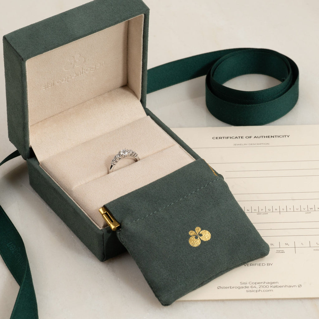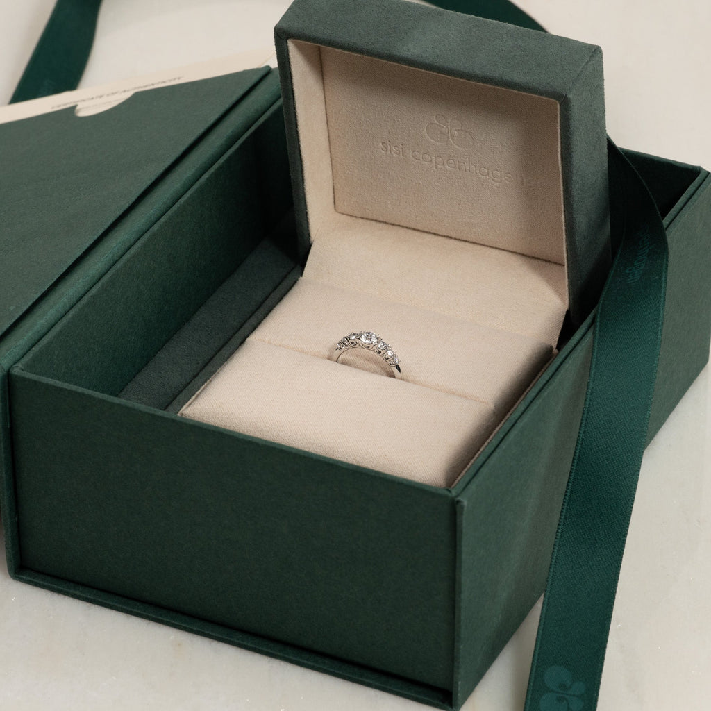 Ringen leveres i vår eksklusive Diamond Collection-eske med et vakkert smykkeskrin, sertifikat og pose. Esken er også perfekt hvis smykket skal gis i gave.