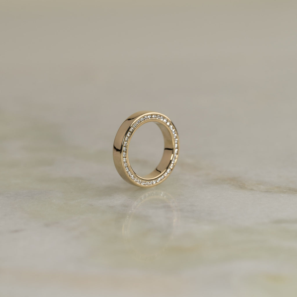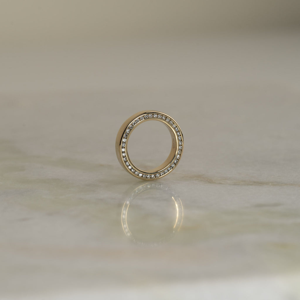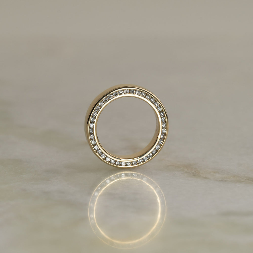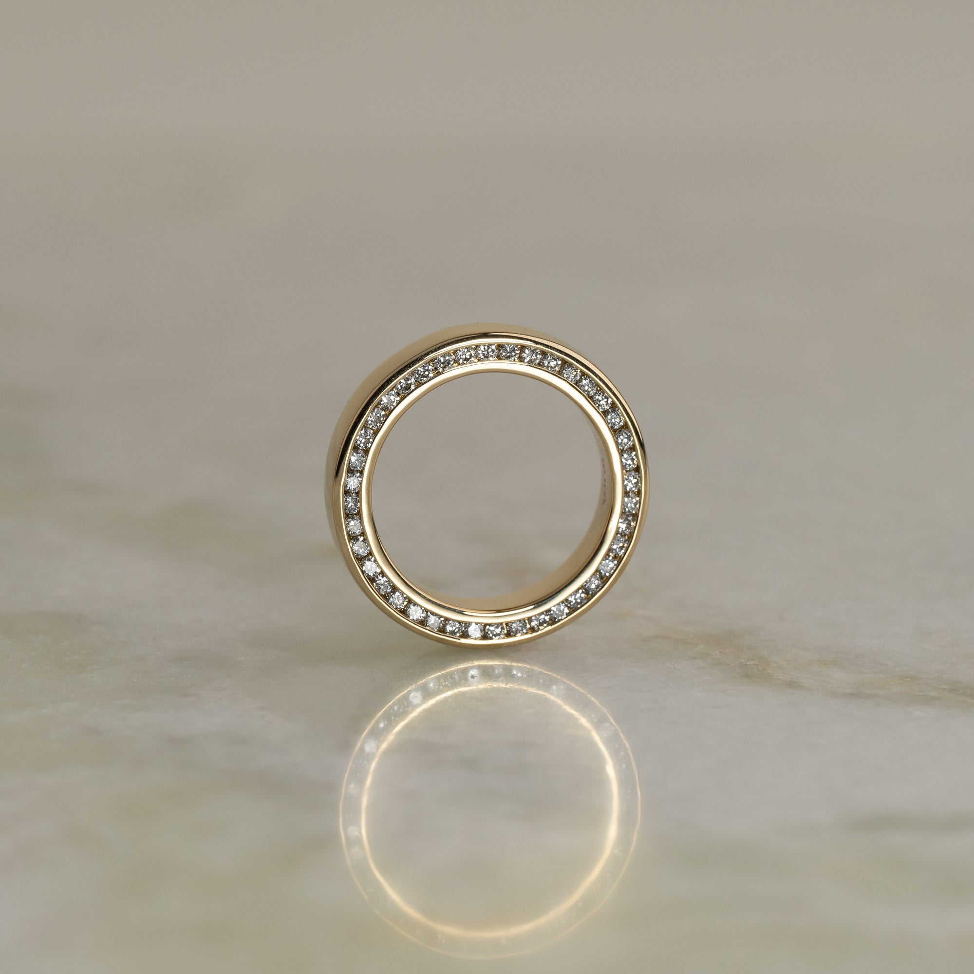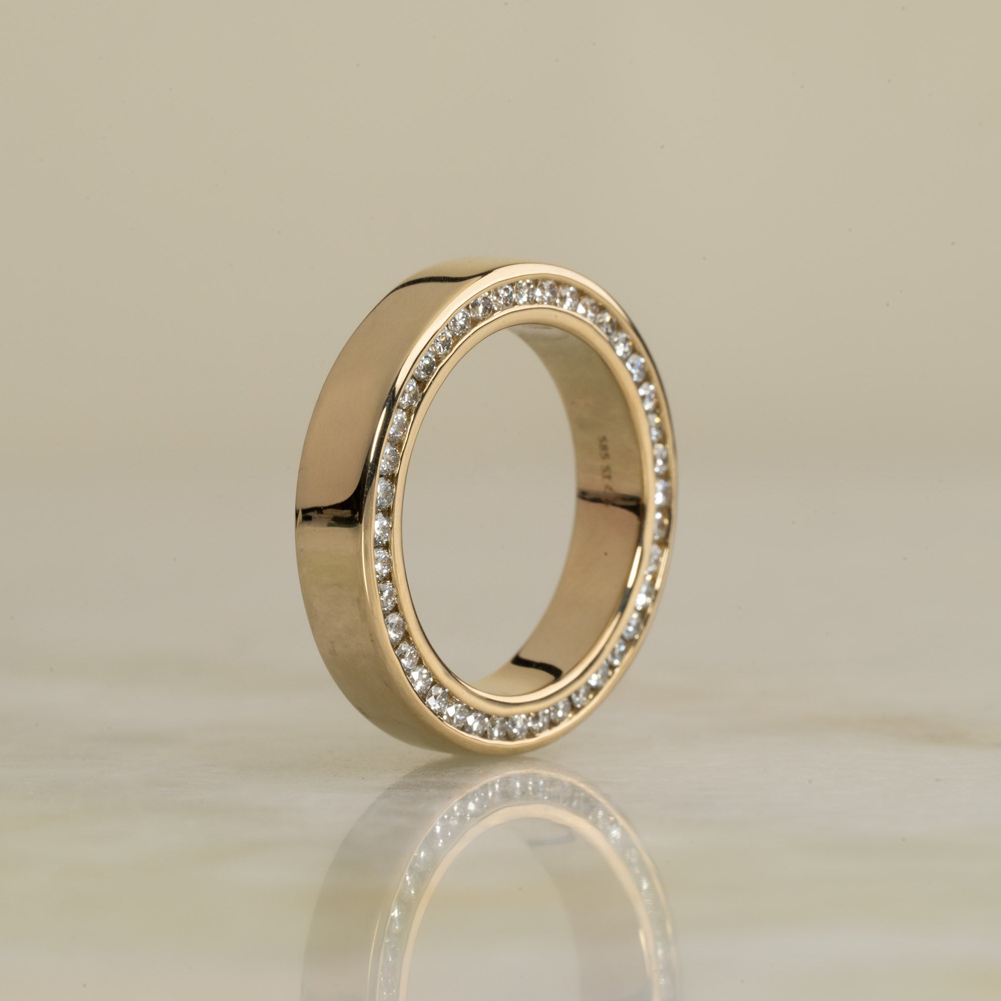 Ringen er laget i 14 karat gull med et elegant og moderne uttrykk. Det unike ved dette designet er at de lab-grown diamantene er satt hele veien rundt langs ringens ytterside i en vakker channel setting.