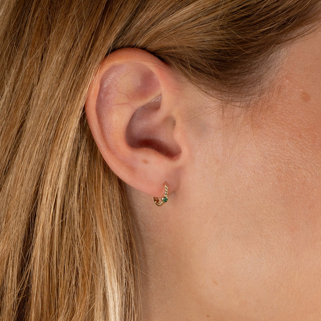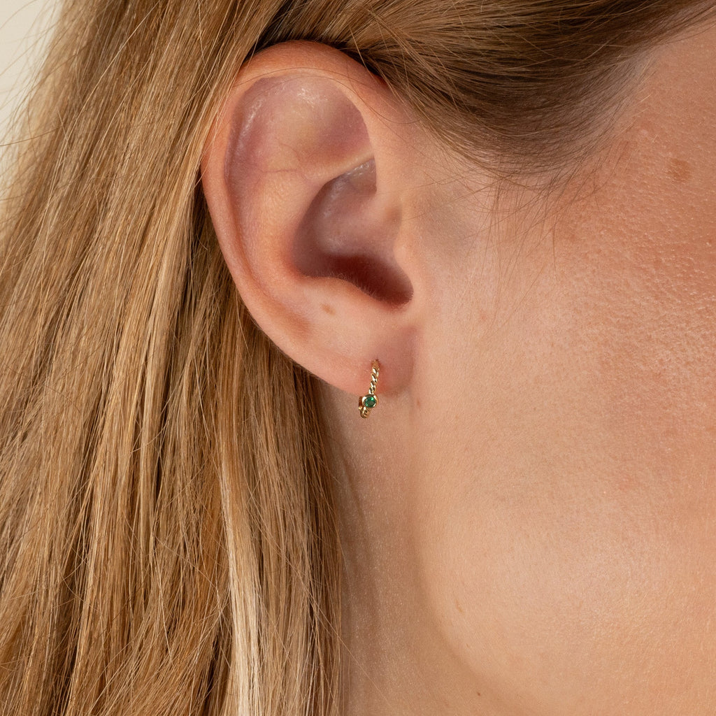Øredobbene har et vridd design med en nydelig, liten edelsten i en innfatning på midten.